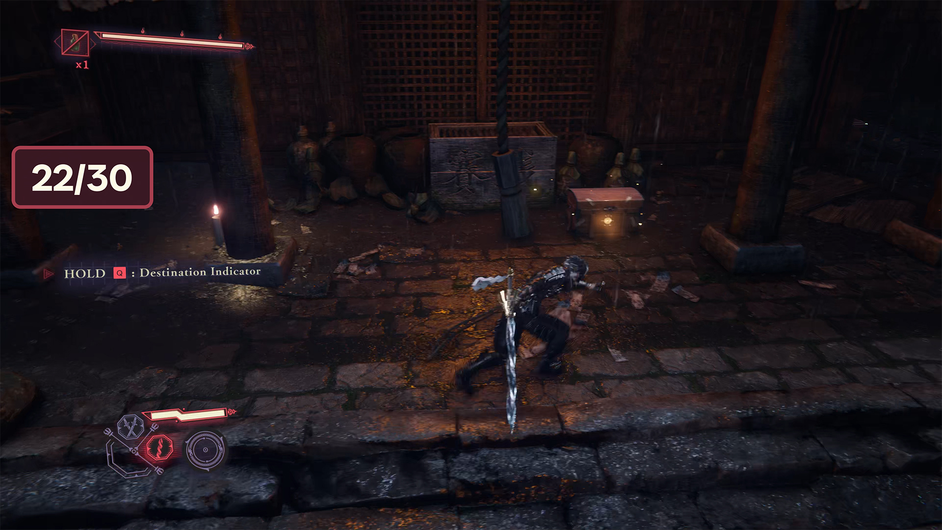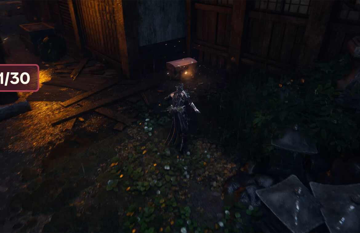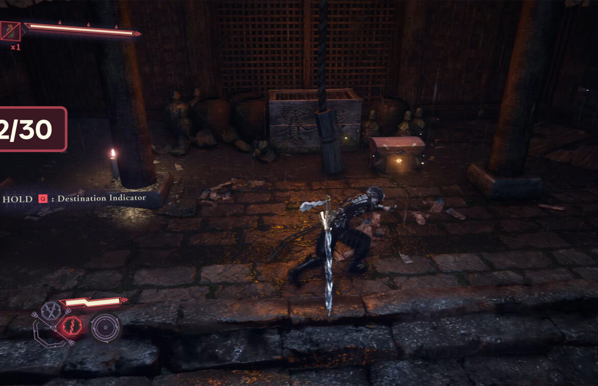 When you exit this building, use your Caddis Wire to reach the roof of another building. Tengu is walking here, and if you jump onto the roof in time, you can assassinate him without engaging in direct combat. After that, jump back into the hole in the roof. There will be one enemy waiting for you inside the building, so you can quickly deal with him and open the twentieth chest to get Kongou Iron Brew.