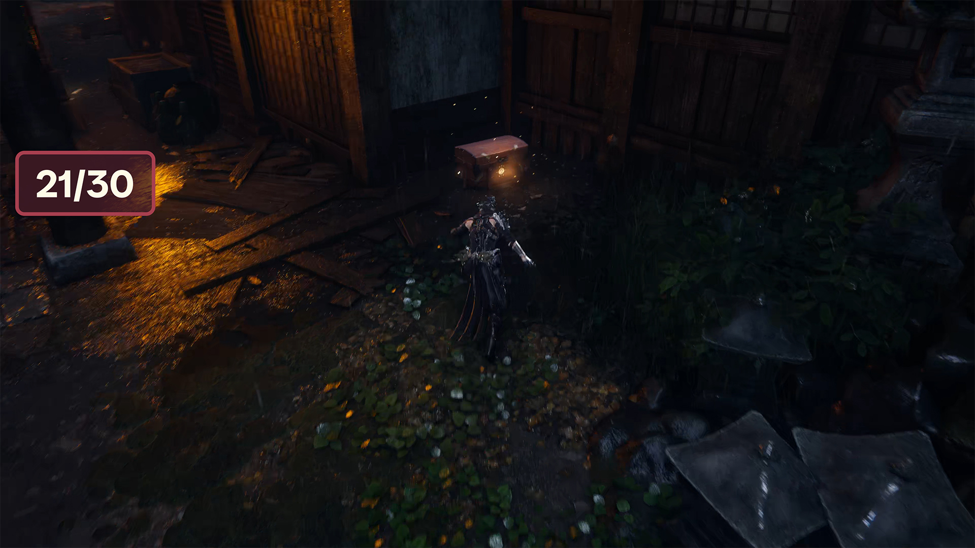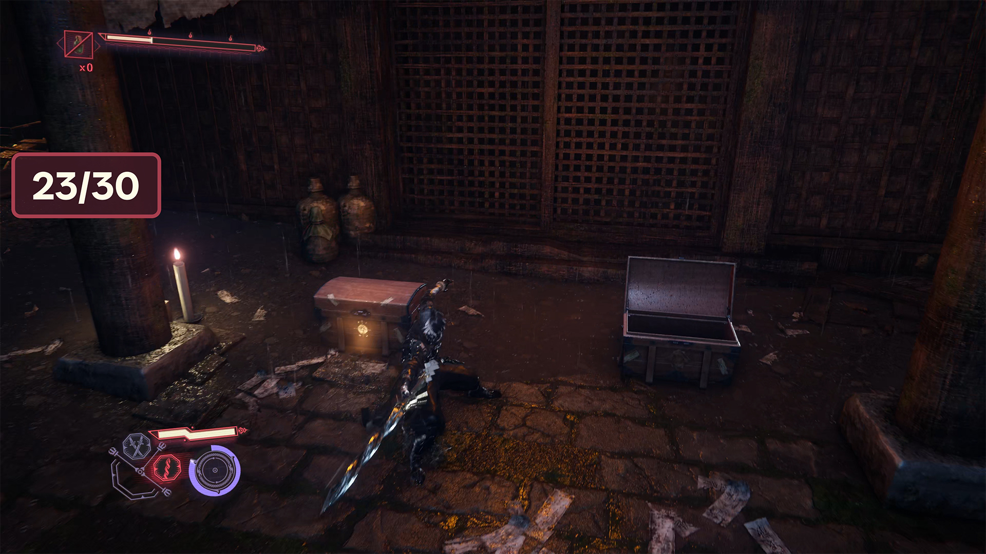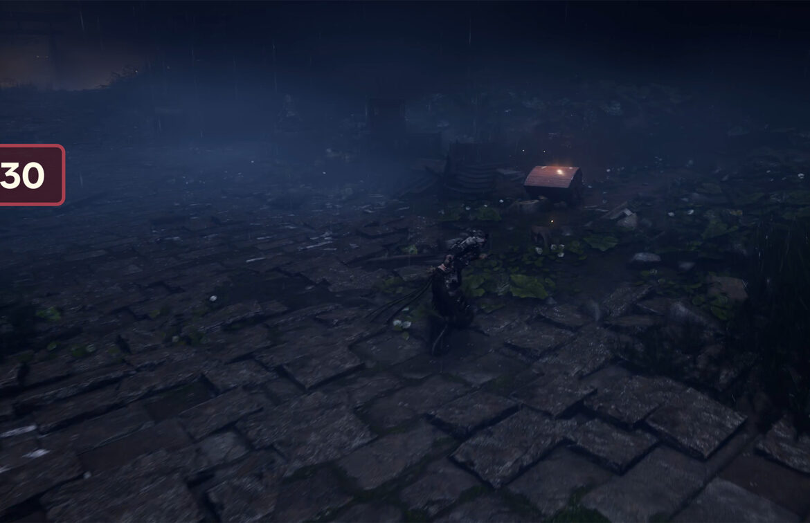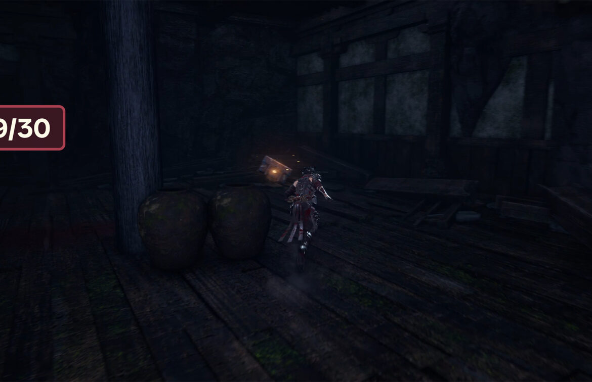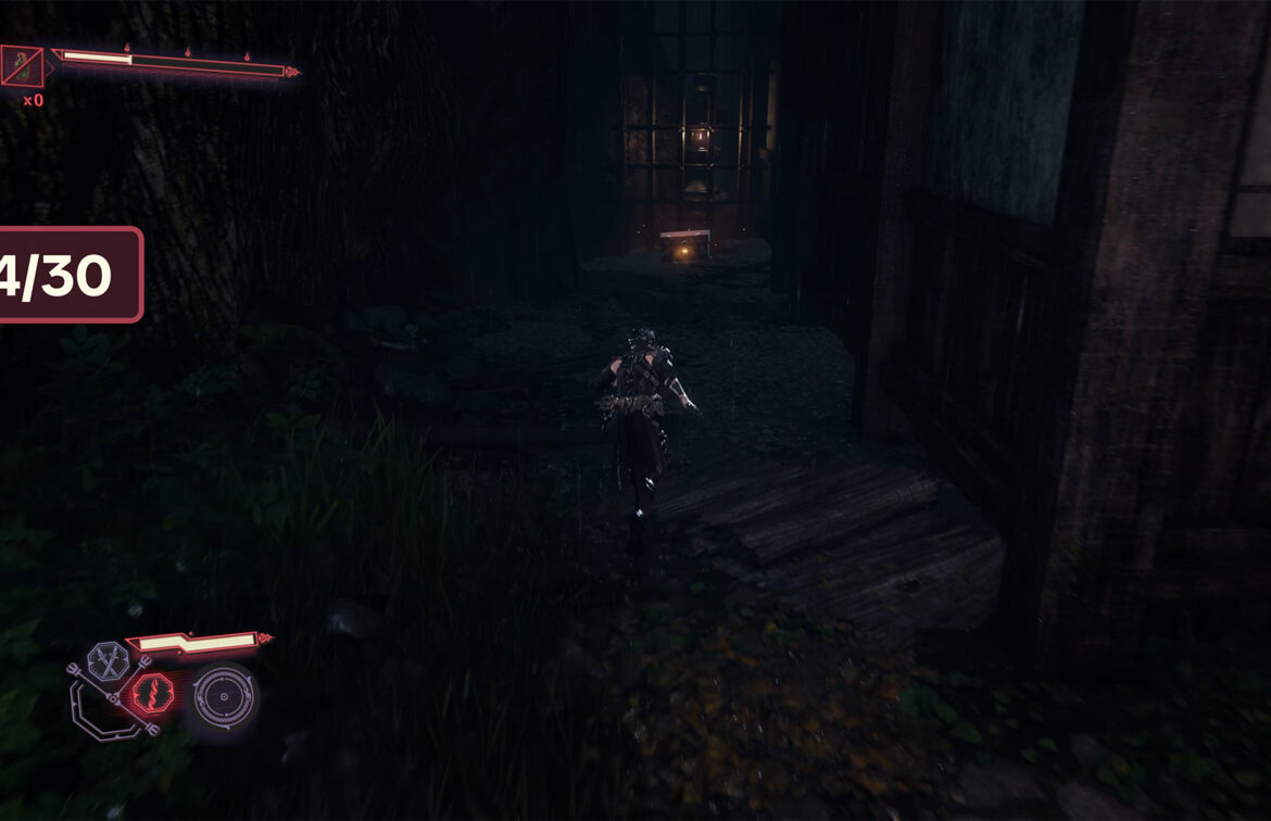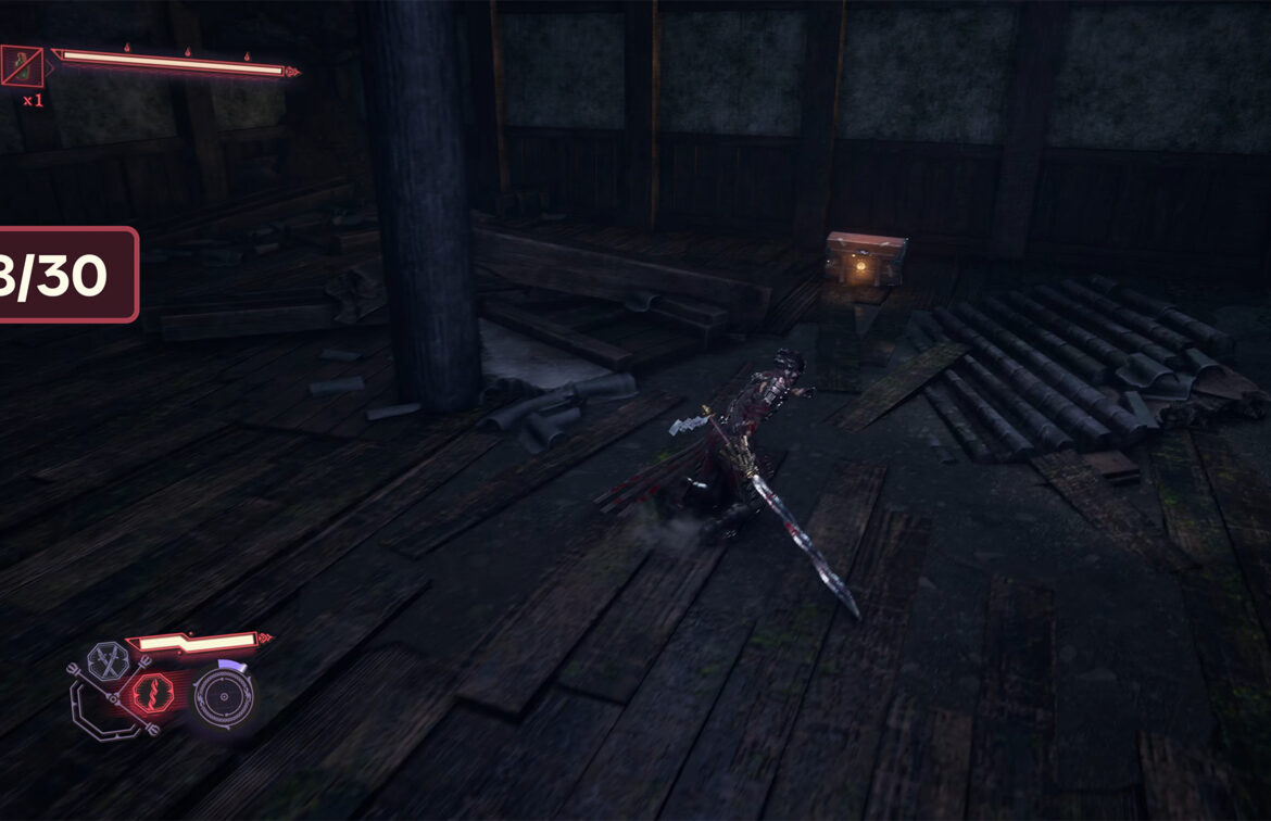 Next, you will find yourself in an interesting location that resembles a village. After completing the side quests, you will find yourself on the roof of a building with a hole in it. Jump inside the building. Here you must defeat your enemies, and then you will be able to open the eighteenth chest with Life Elixir and the nineteenth chest with Crimson Blood Pellets.