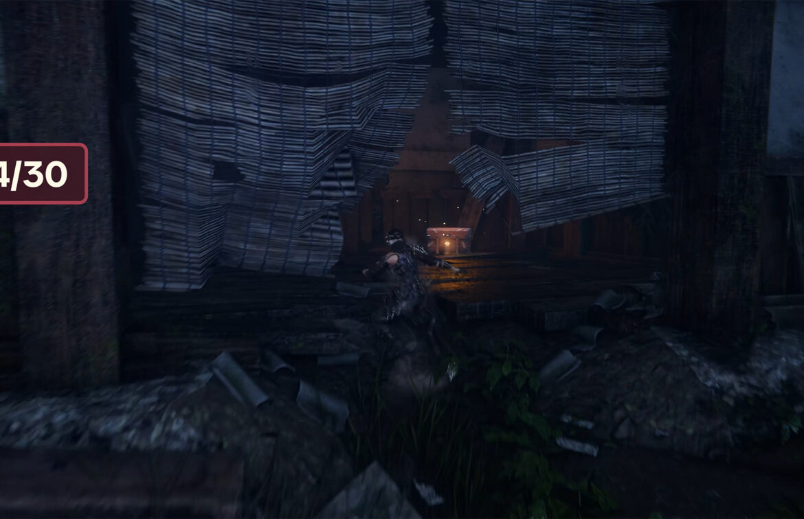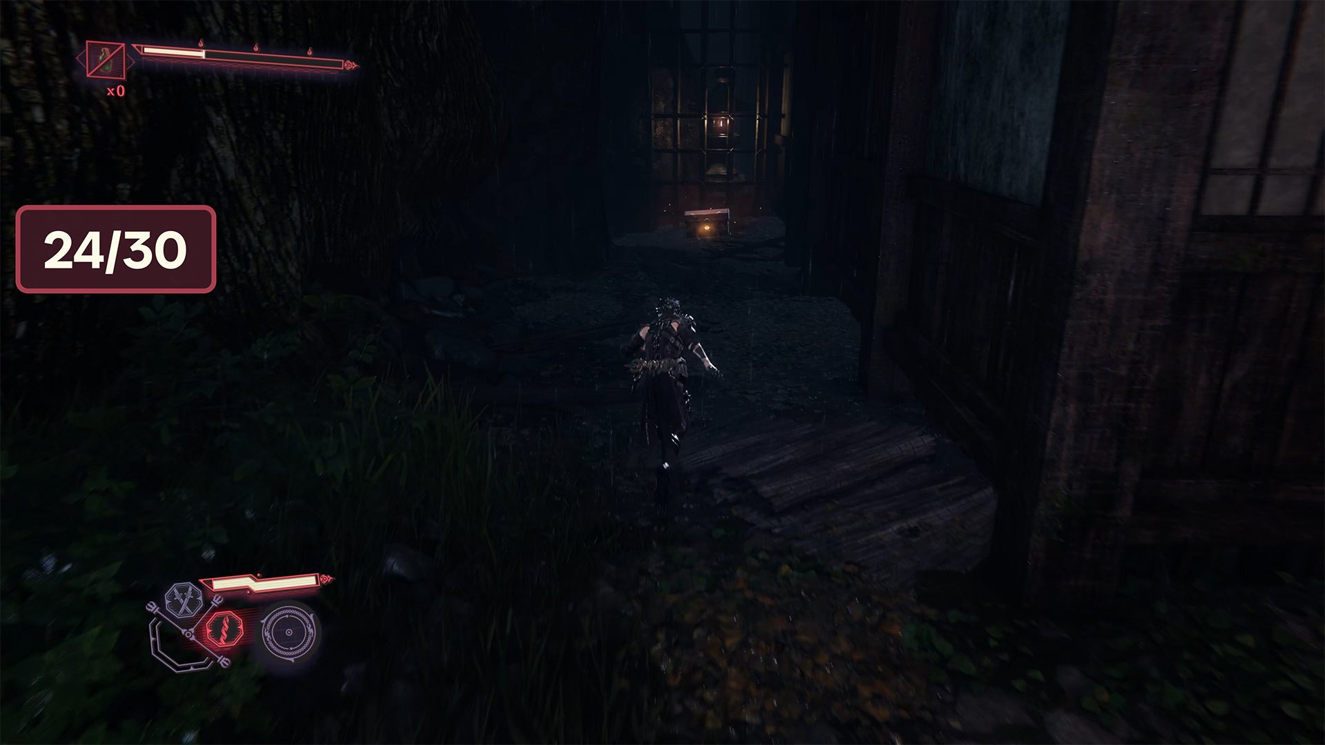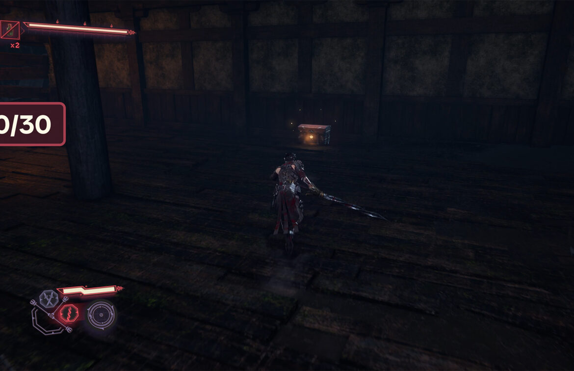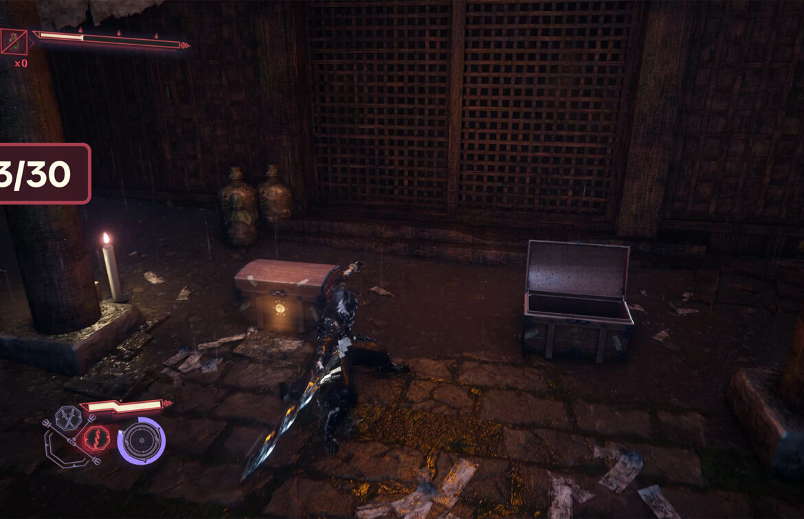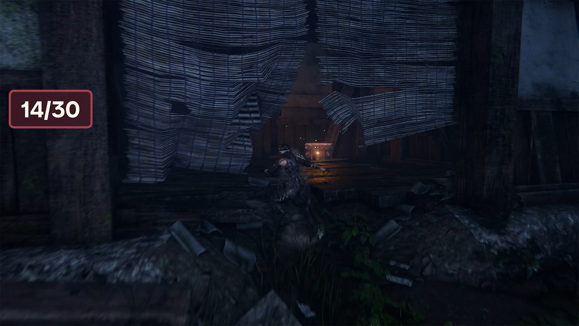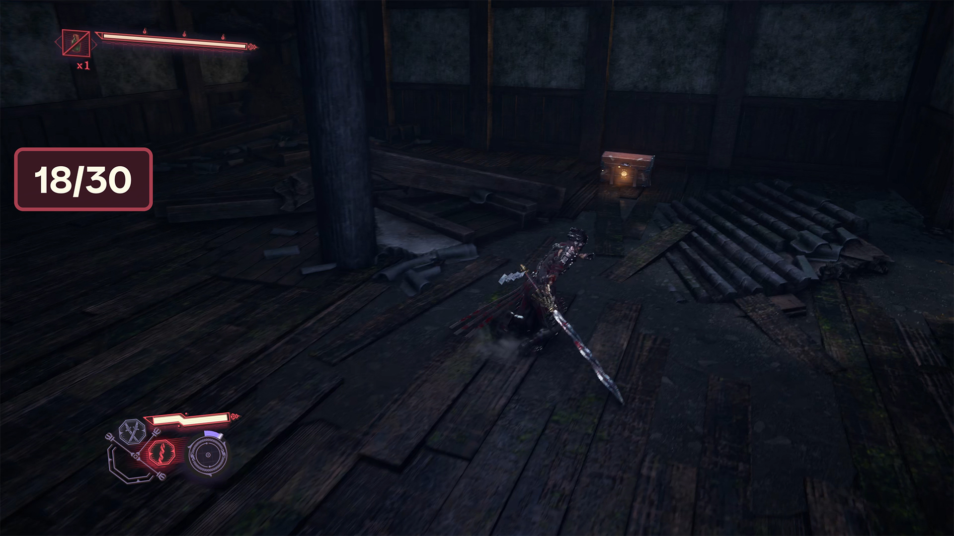 Next, you will find yourself in an interesting location that resembles a village. After completing the side quests, you will find yourself on the roof of a building with a hole in it. Jump inside the building. Here you must defeat your enemies, and then you will be able to open the eighteenth chest with Life Elixir and the nineteenth chest with Crimson Blood Pellets.
