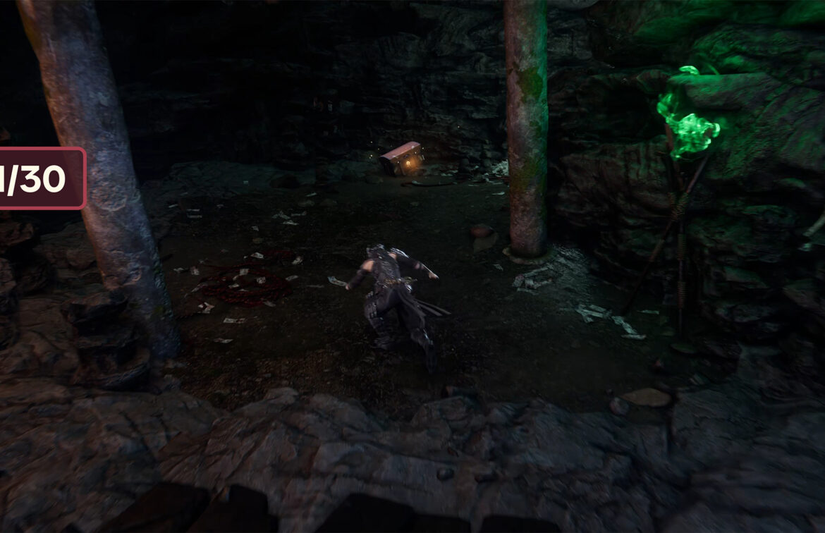 After the last chest, turn left and go forward. You will see a large wooden closed door in front of you. Open it to move to the next location. Of course, there will also be enemies here that you must destroy. After victory, look around carefully. The twelfth chest will be near the wall, not far from the green torch. Open it to get the Life Elixir. After that, turn right and go to another green torch. Here, on a small hill, you will see the thirteenth chest. Inside, you will find the Incense of Rebirth.