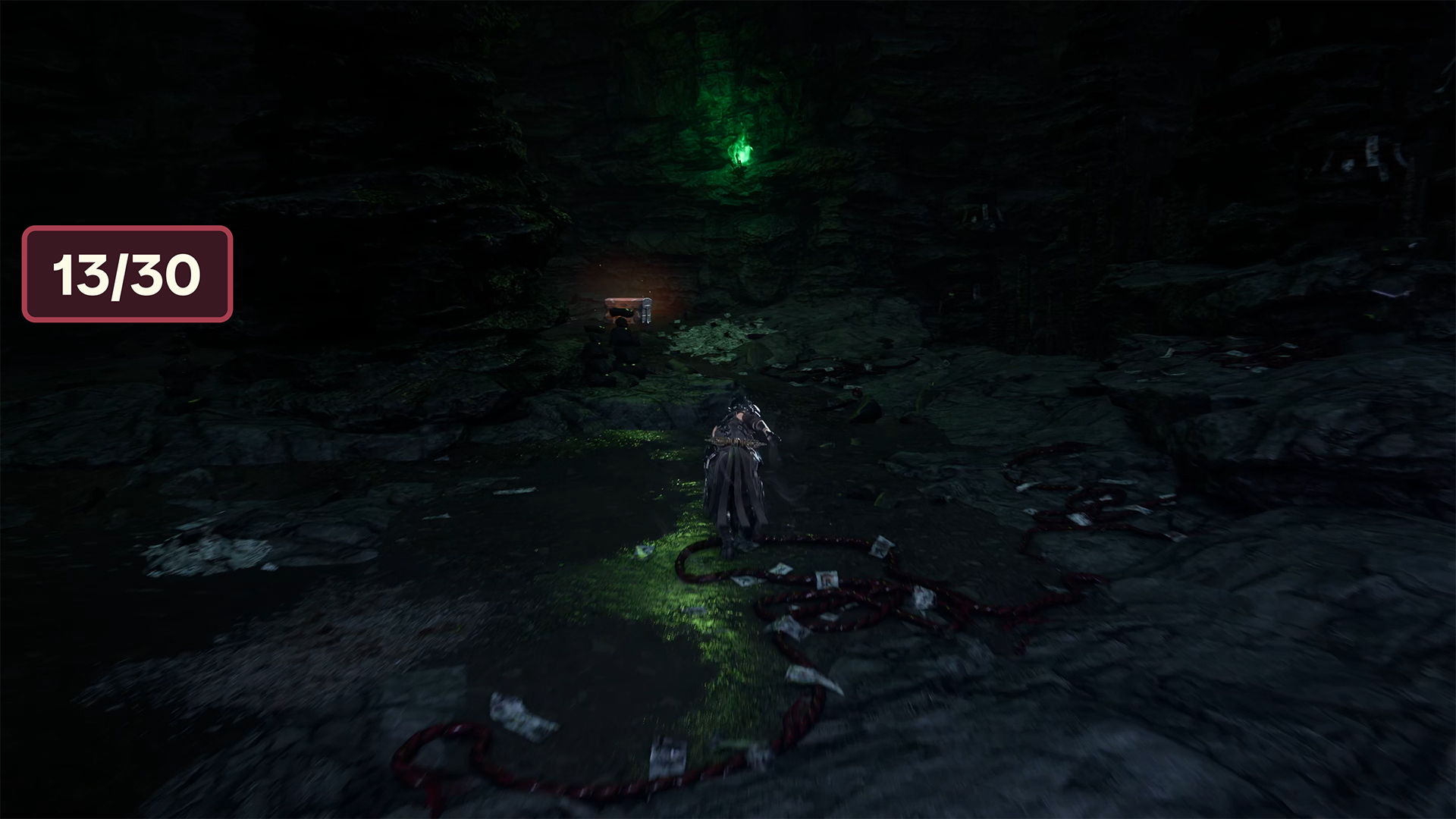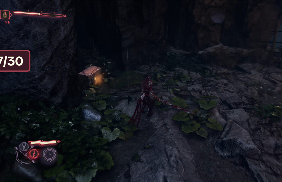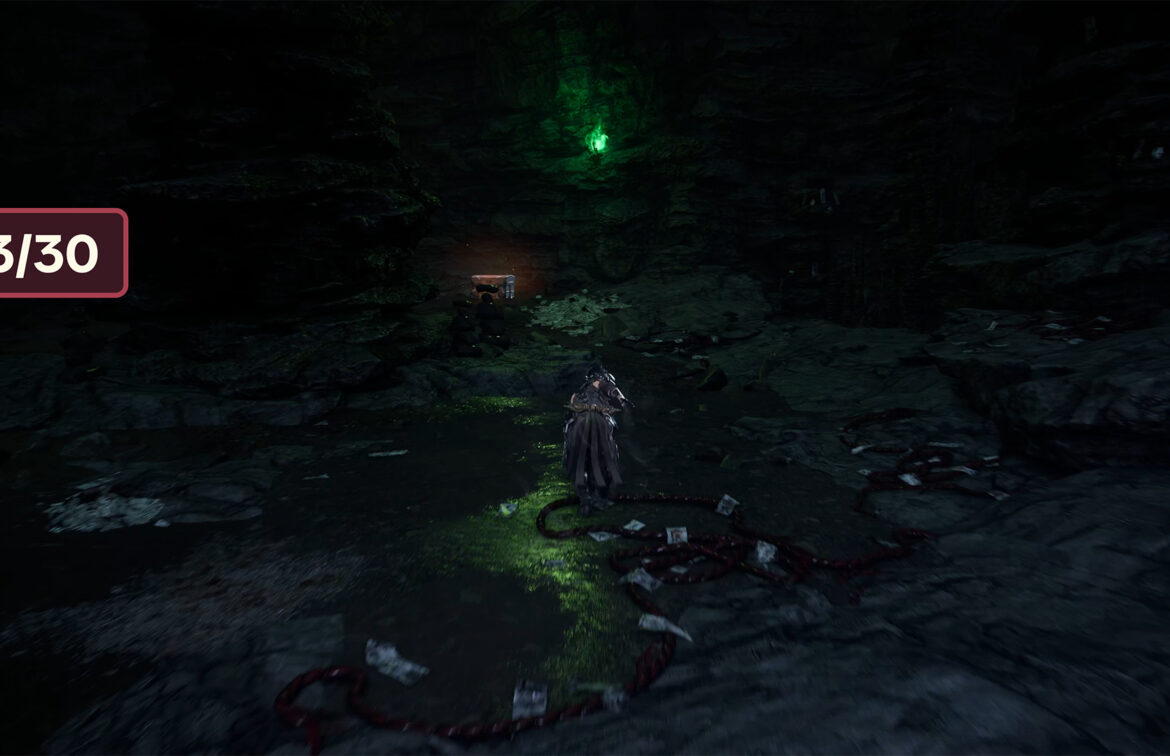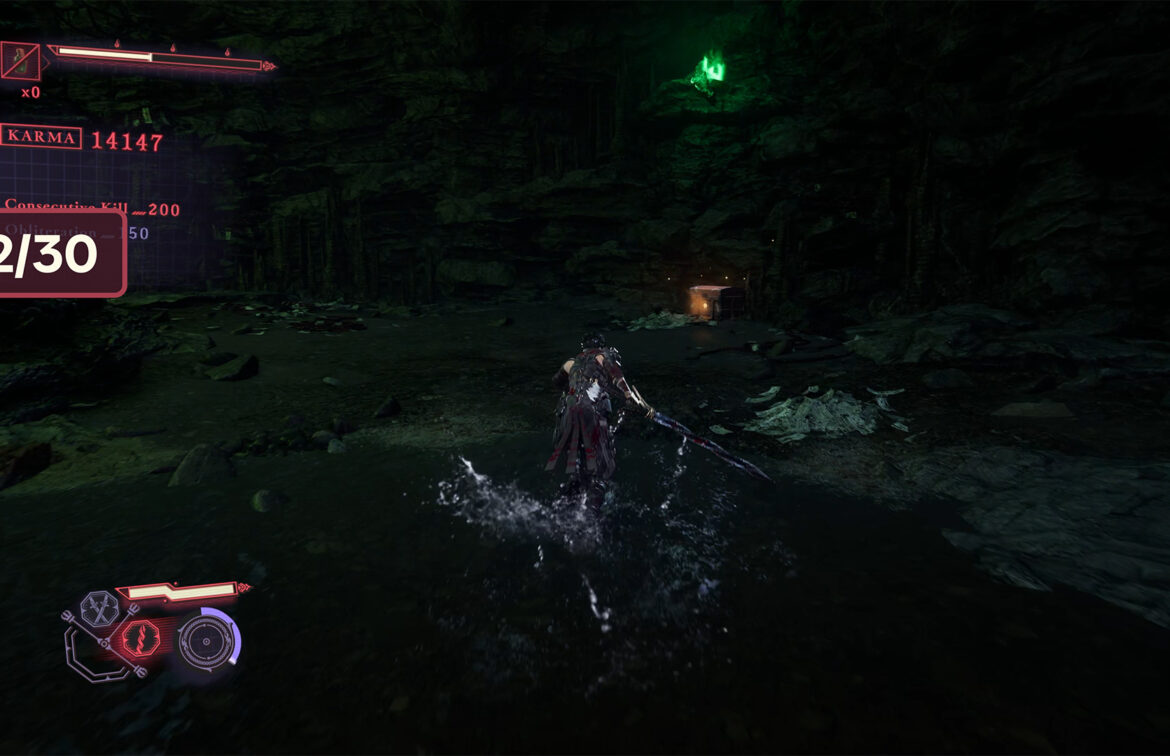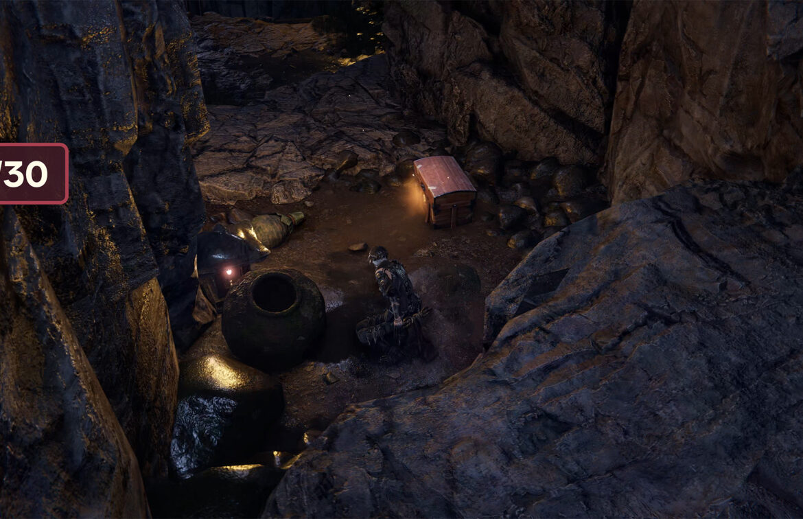 Continue forward through the story and you will enter a beautiful cave. A distinctive feature of this place is the water under your feet. You definitely won’t miss this place. Here you will have a small skirmish with enemies. There are two chests in this cave. So jump onto the raised platform on the left to open the sixth chest containing Divine Life Elixir. Then turn left from this chest. This will be the seventh chest. Inside, you will find Crimson Blood Pellets.