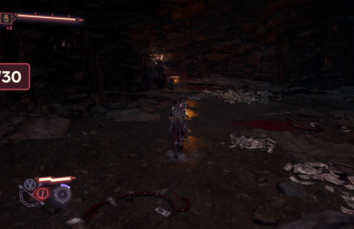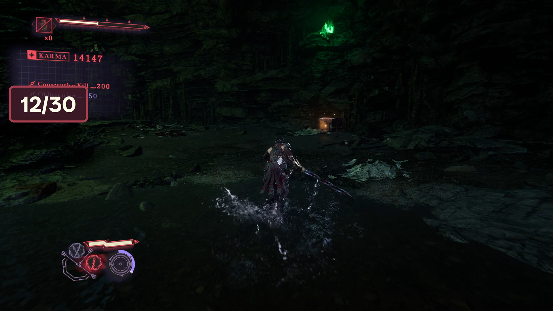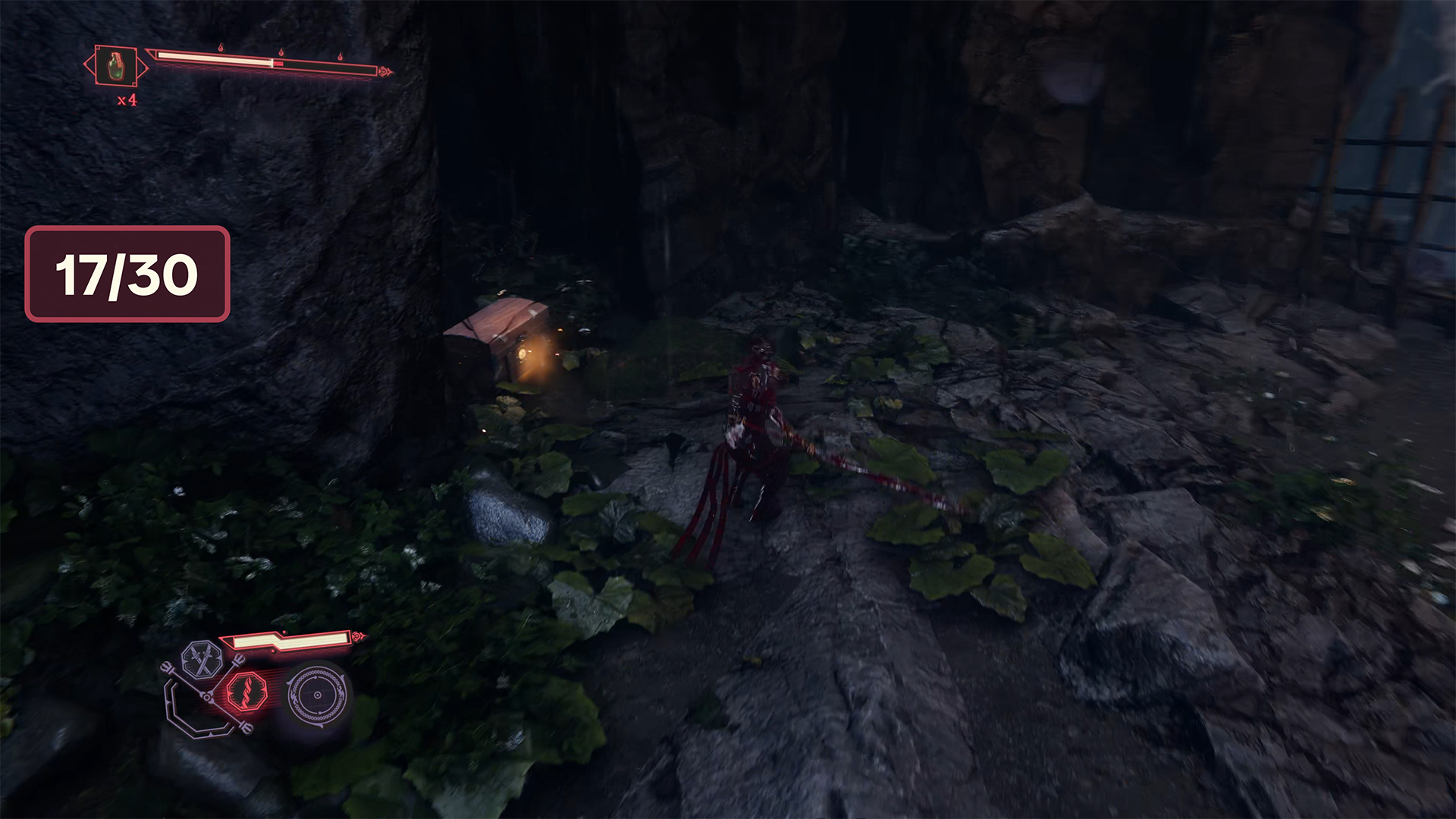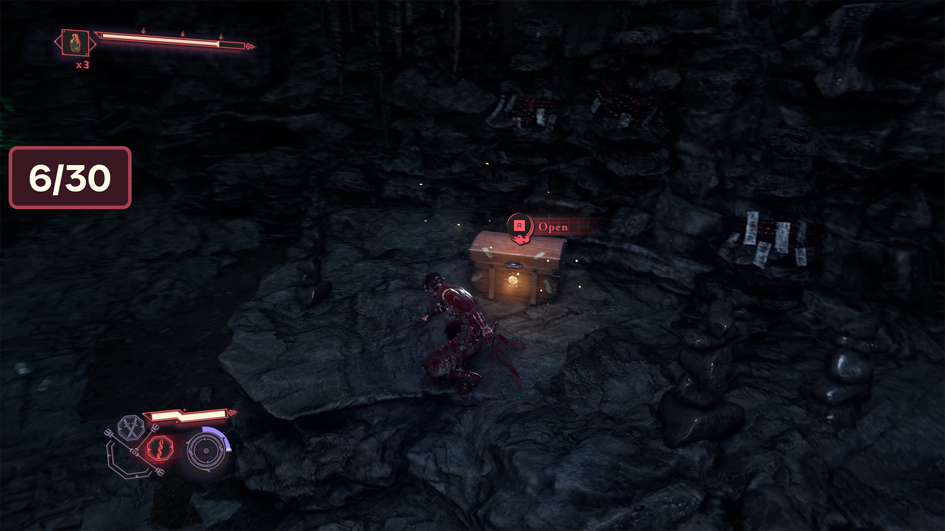 Continue forward through the story and you will enter a beautiful cave. A distinctive feature of this place is the water under your feet. You definitely won’t miss this place. Here you will have a small skirmish with enemies. There are two chests in this cave. So jump onto the raised platform on the left to open the sixth chest containing Divine Life Elixir. Then turn left from this chest. This will be the seventh chest. Inside, you will find Crimson Blood Pellets.