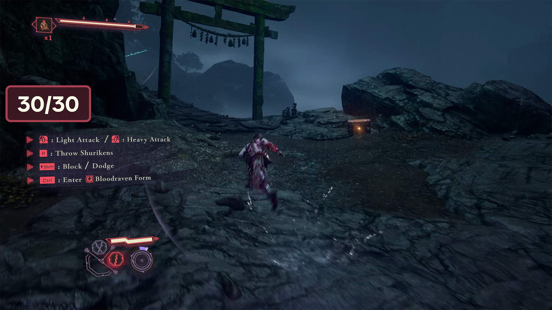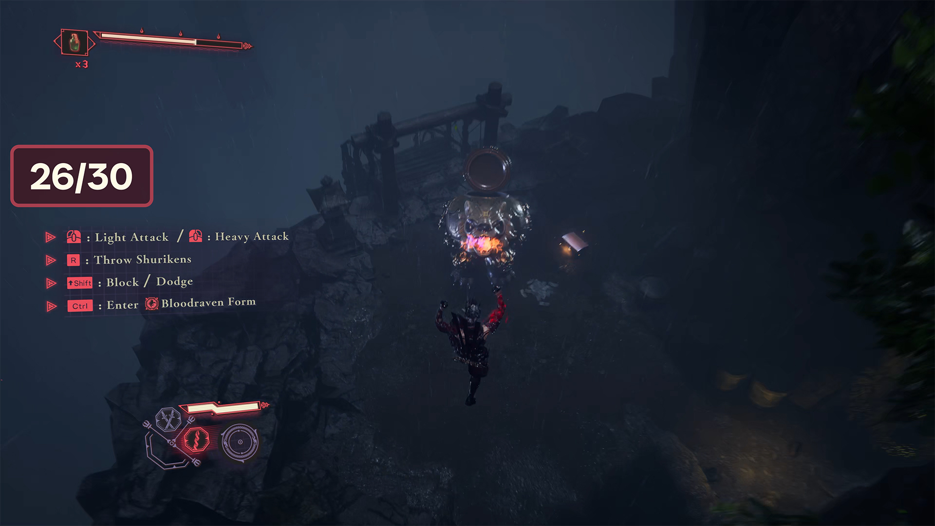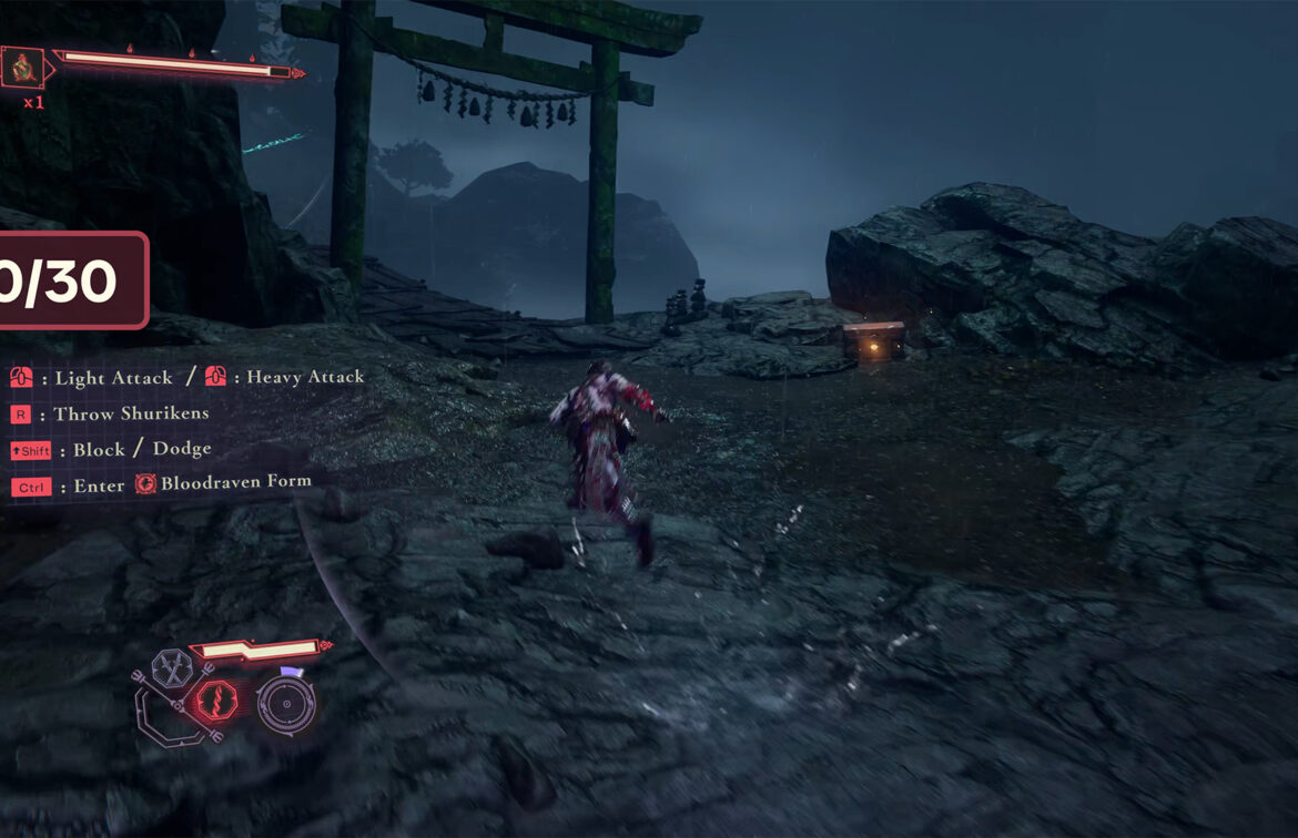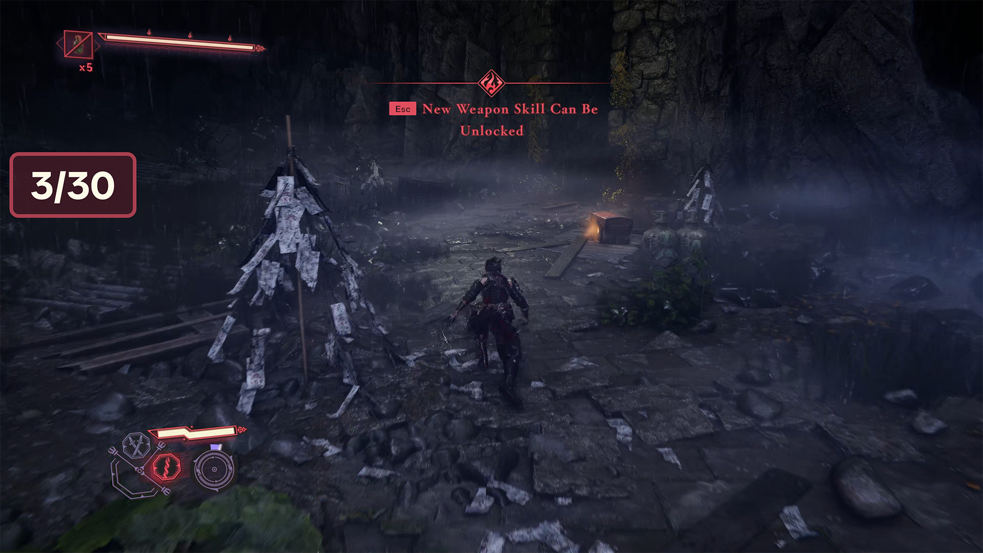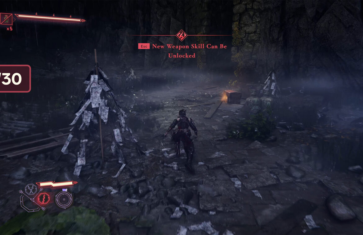 Next is a very important chest that is easy to miss. When you reach the bridge with the Torii Gate at the far end, turn right without crossing the bridge and jump onto the pole using Caddis Wire. The route is clear from there; keep going until you reach the platform. The twenty-ninth chest is located here. Inside is the very useful Crimson Ring, which I recommend equipping immediately.