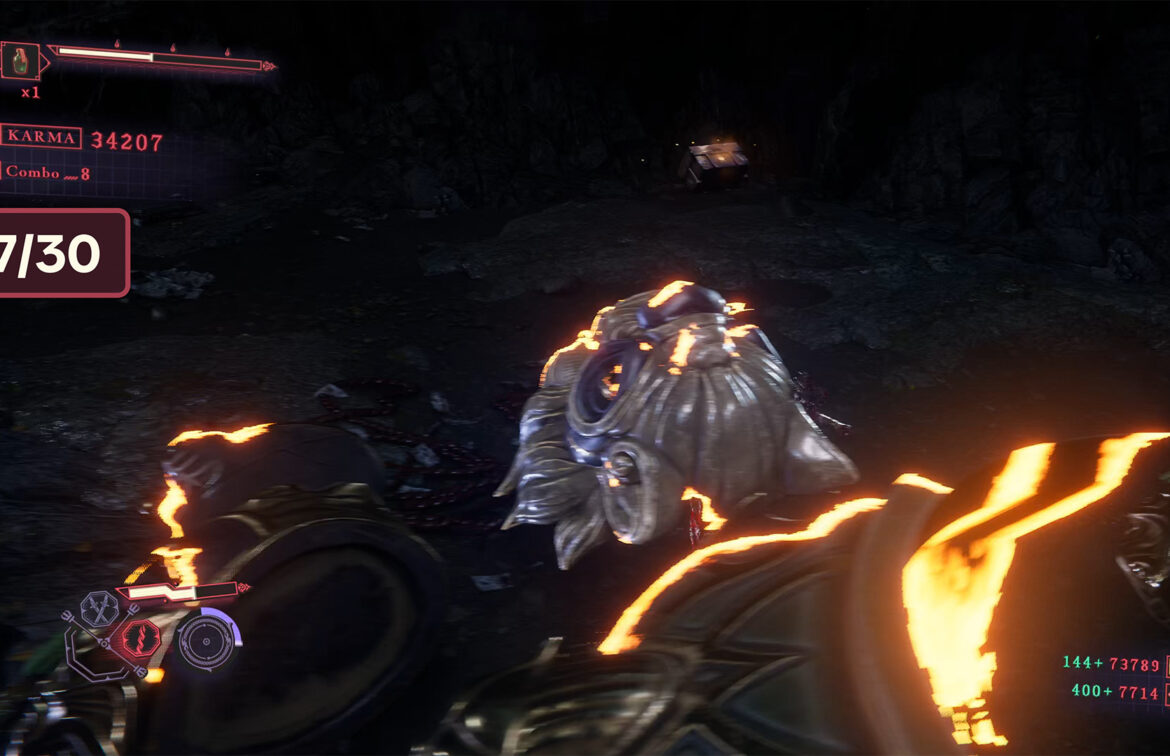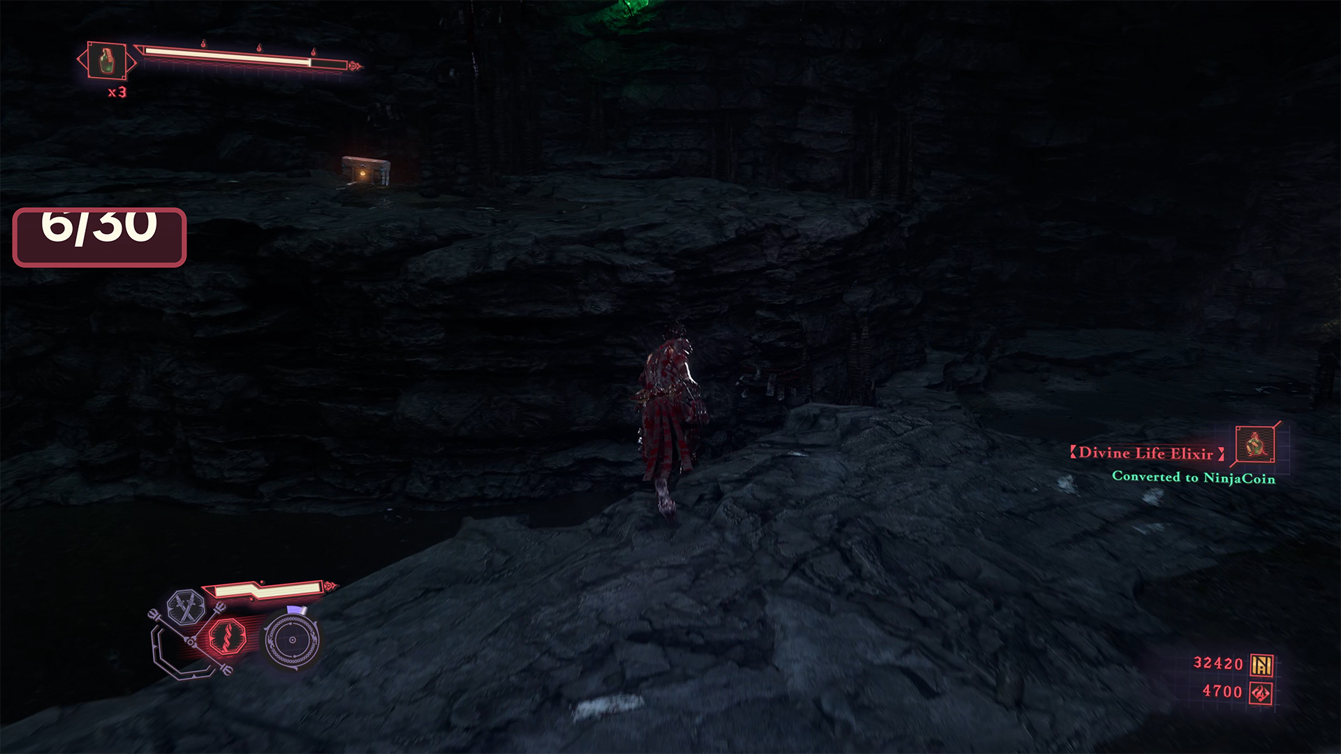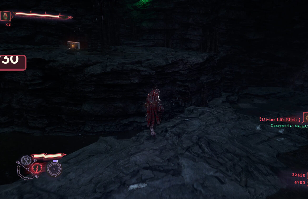 Moving forward, you will now see that you need to jump to the other side of the chasm. But look down. Right below you is the fifteenth chest. Jump down, deal with the enemies, and open the chest containing Senjin War Brew. After that, go to the left, where you will find a room with the next sixteenth chest. Inside the chest is the Divine Life Elixir. Now you can leave this ravine and return to the place where you jumped down from above.