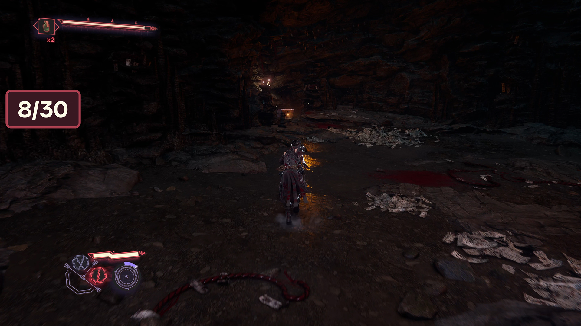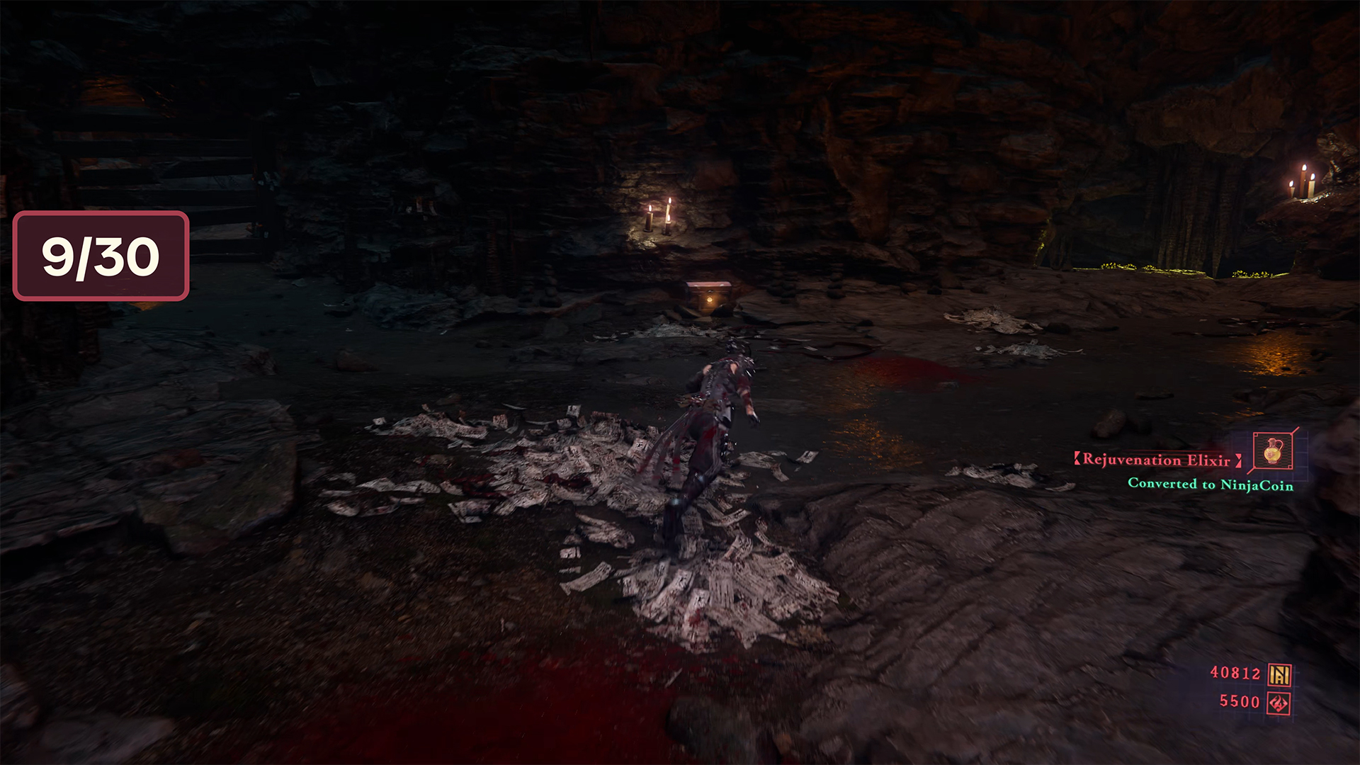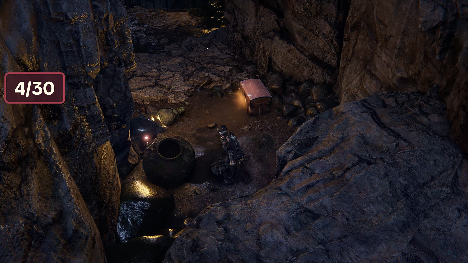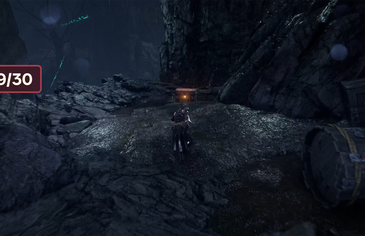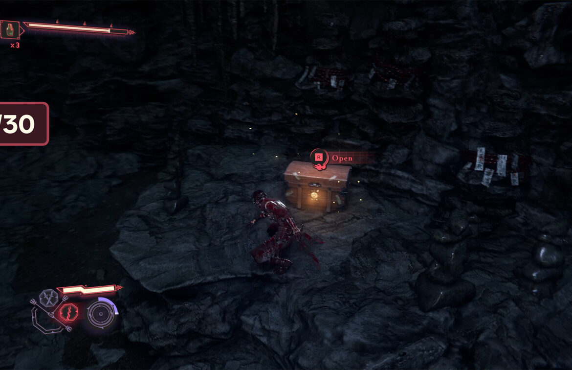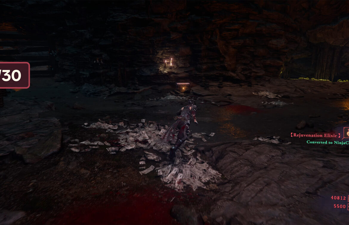 Continuing onward, you will need to slip under the rock and you will find yourself in a room with enemies. Ahead of them, you can see the eighth chest. First, defeat the enemies, then open the chest to get the Rejuvenation Elixir. After that, turn around and you will see the ninth chest in front of you. Open it to get the Crimson Blood Balm.