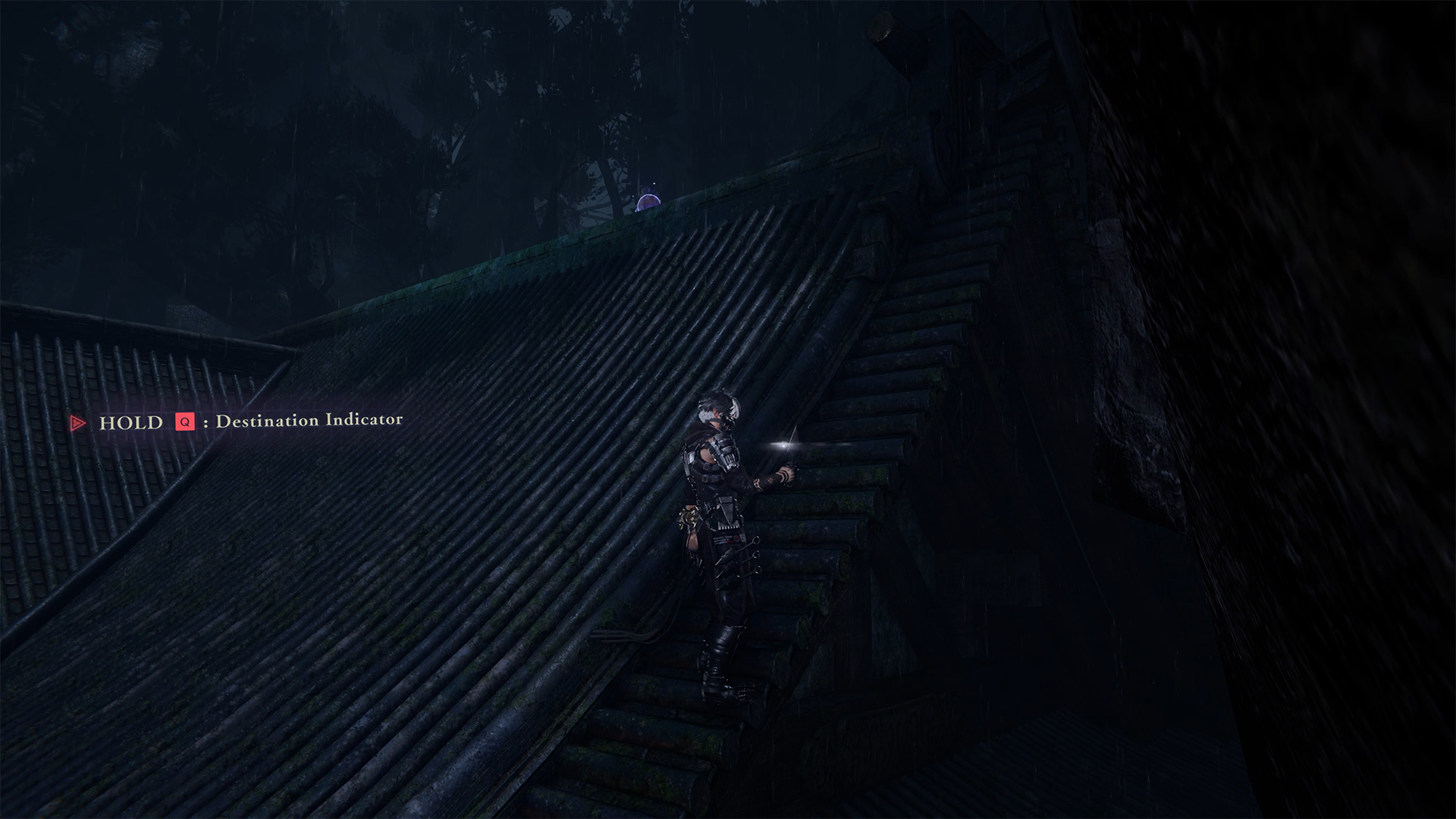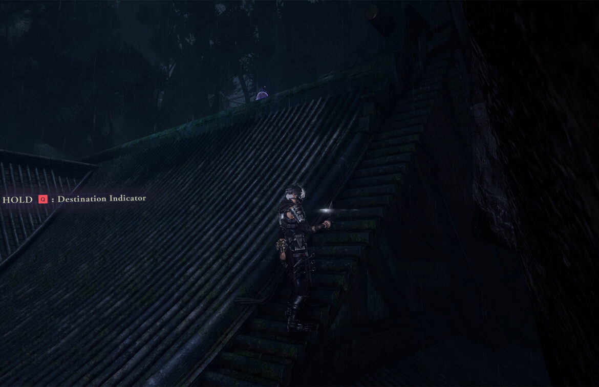 Next, you will collect chests in this location, and then climb the stairs to a large building. There will be large Tori gates near the stairs. Find a convenient position and jump onto these Tori gates using Caddis Wire. If you look ahead, you will see a blue Gourdy walking on the roof of the large building.