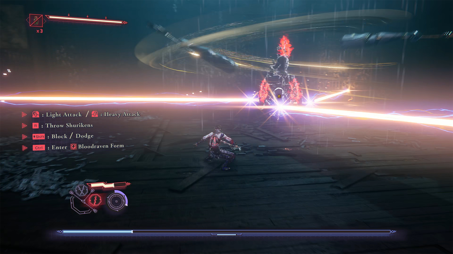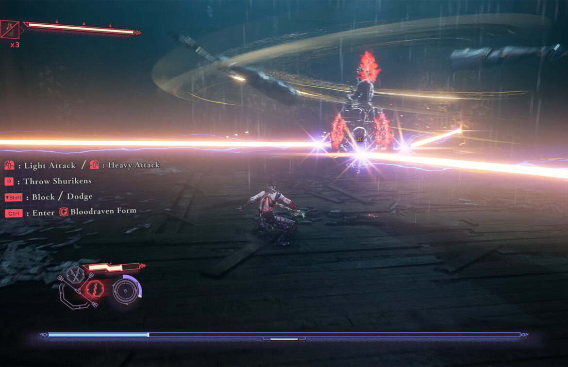 Next, I will tell you how to defeat the final boss in Raging Valley, whose name is Sanzeon. This boss has two phases. The first phase is quite simple. The boss has the shape of folded hands. He constantly tries to shoot you with a laser from a long distance, so you need to constantly monitor his movements and dodge in time. Here, at your discretion, you can block the lasers or dodge them. I prefer the second option. The first phase is quite monotonous. The boss has a single regular laser attack and a triple laser attack, which is more difficult to dodge. There are also shots with several missiles.
