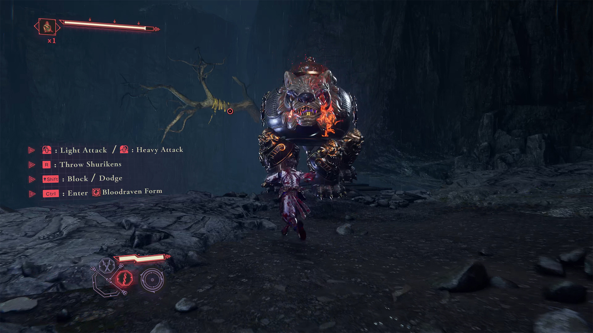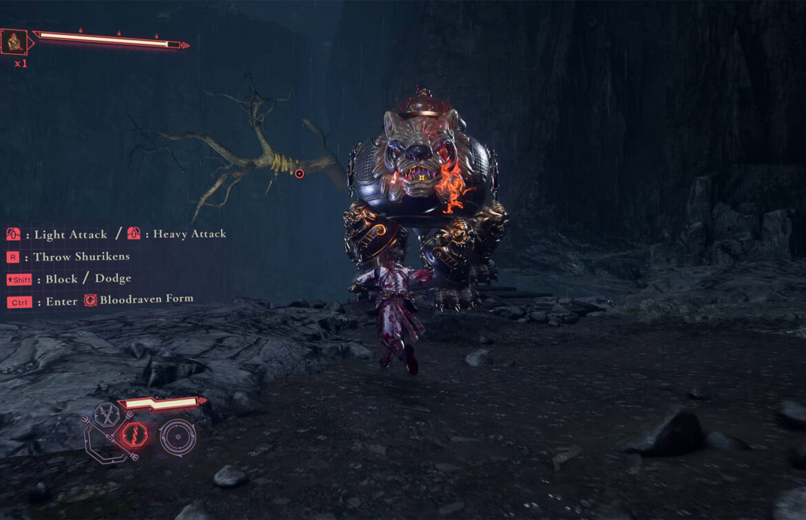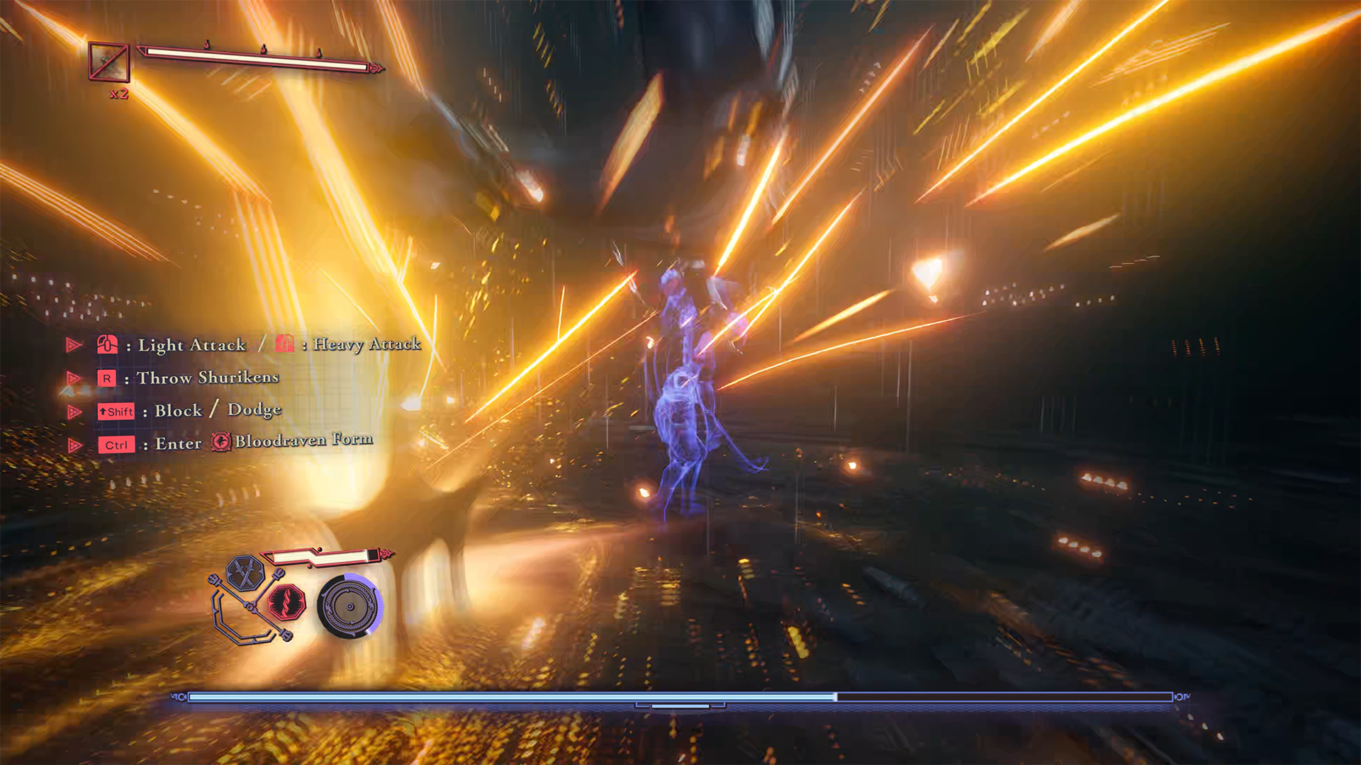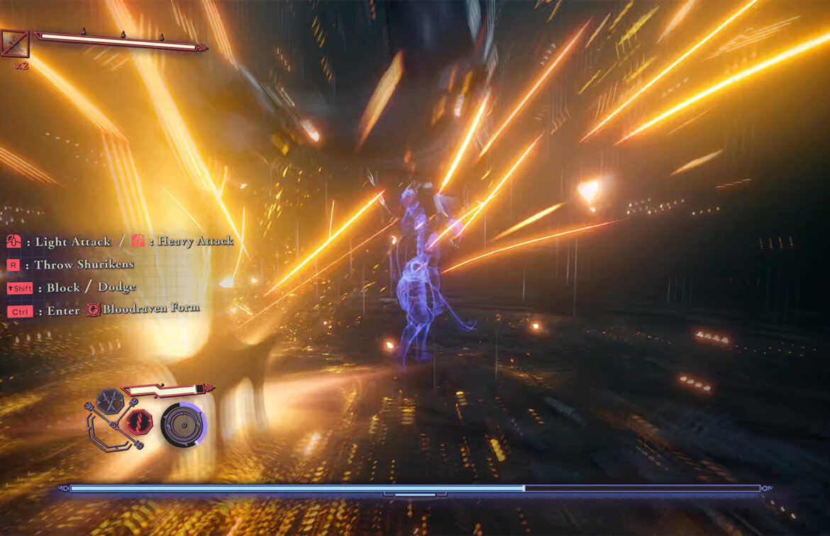 Here, I just run to the side and they don’t hit me. At close range, when the floor glows with round spots, it is important to dodge in time. The boss also sometimes jumps up and falls down, causing damage. This can be blocked or dodged. The second phase is much more difficult. The boss’s arms open up and his arsenal of attacks becomes much richer. As always, you can parry simple attacks and, after a successful parry, use a quick counterattack. Things get pretty tricky when the boss throws his arms at you.