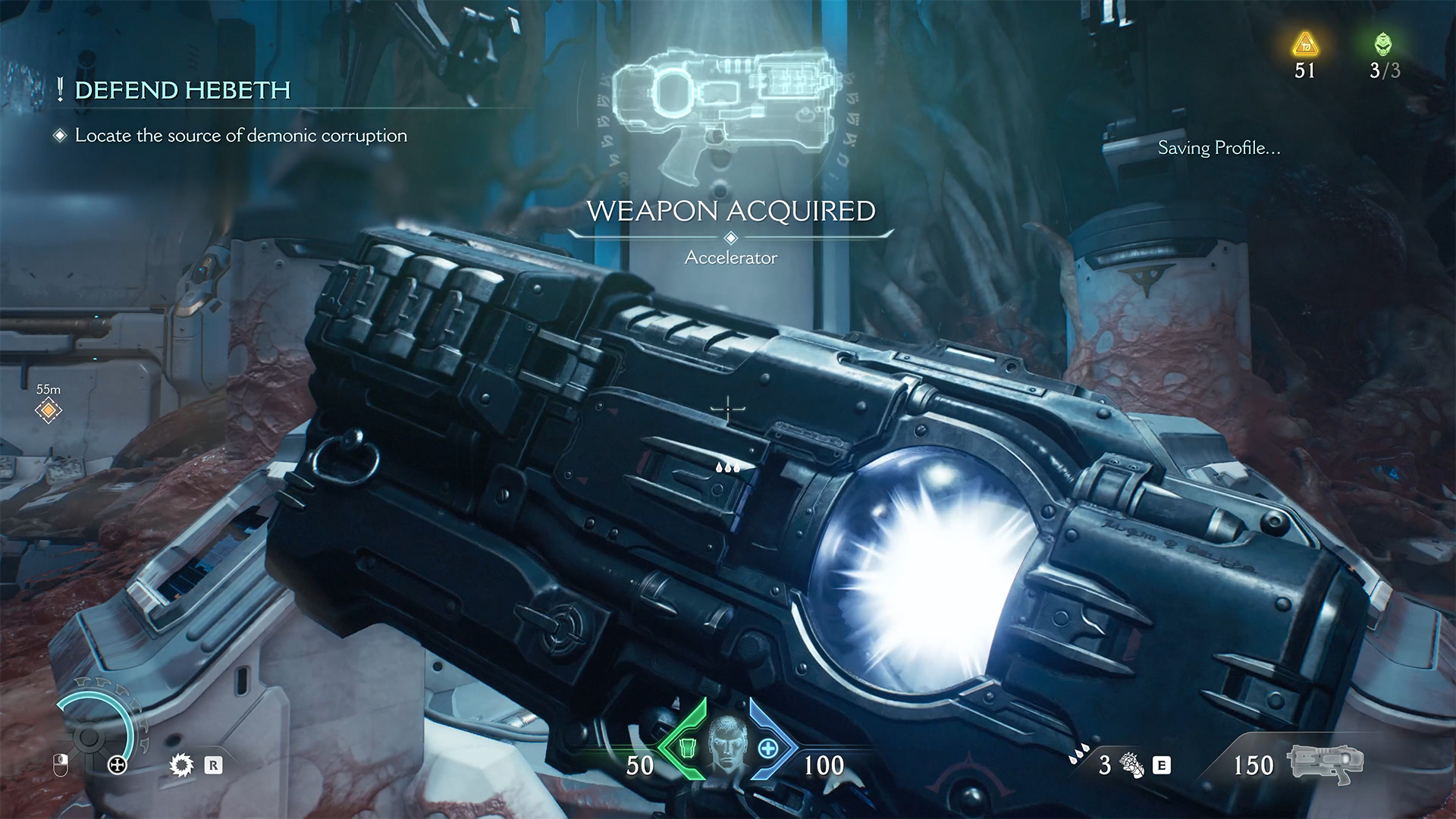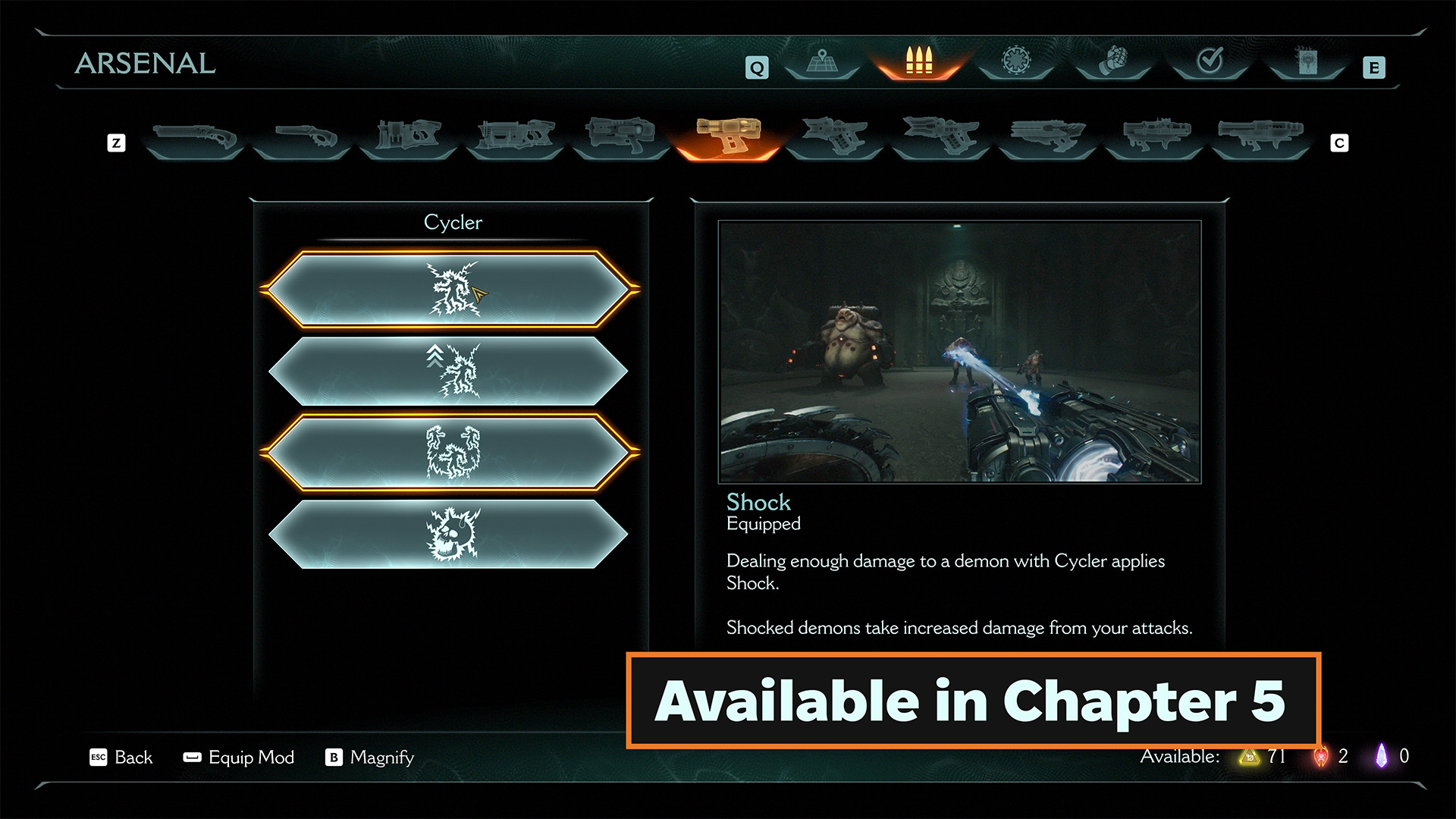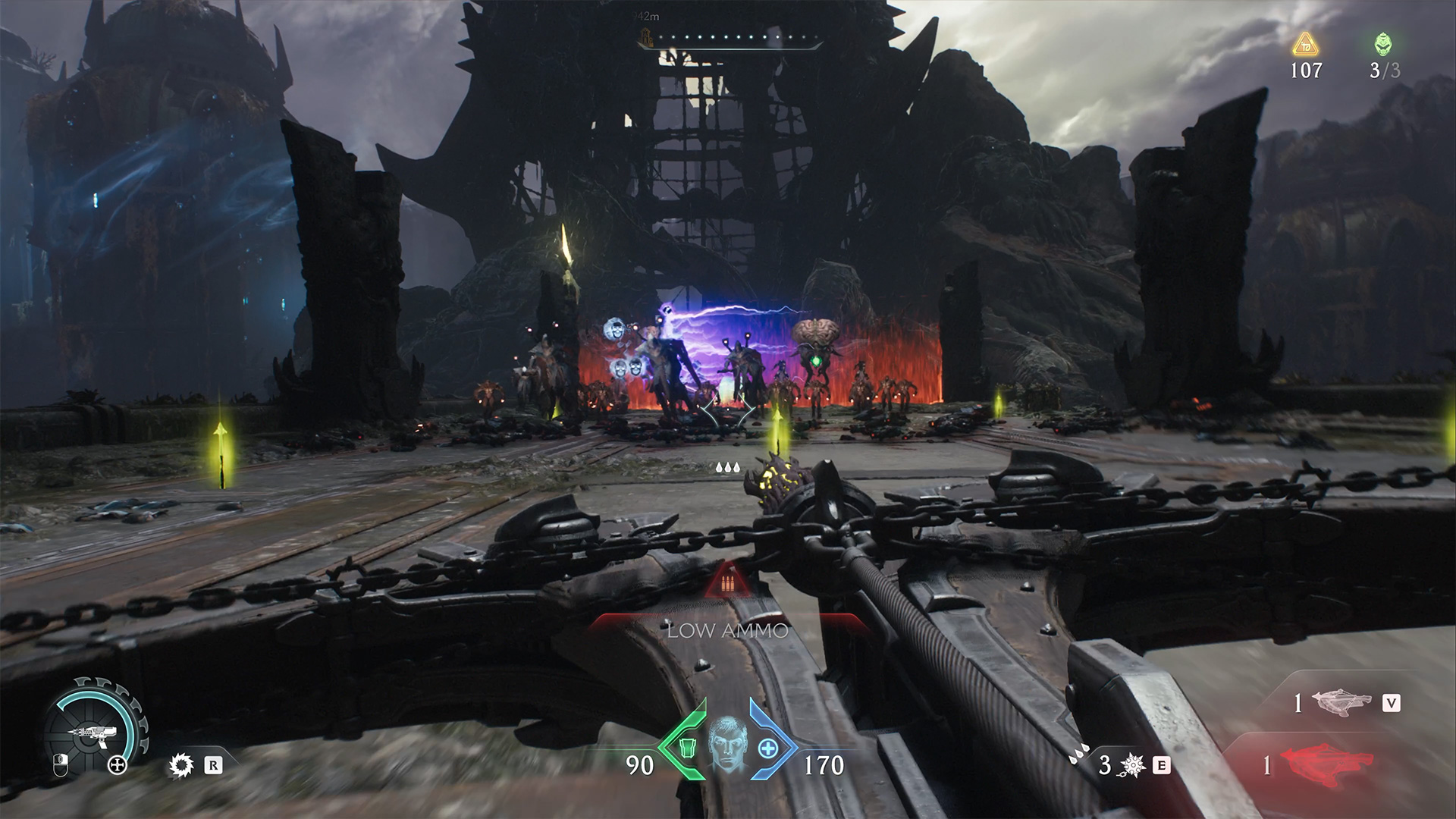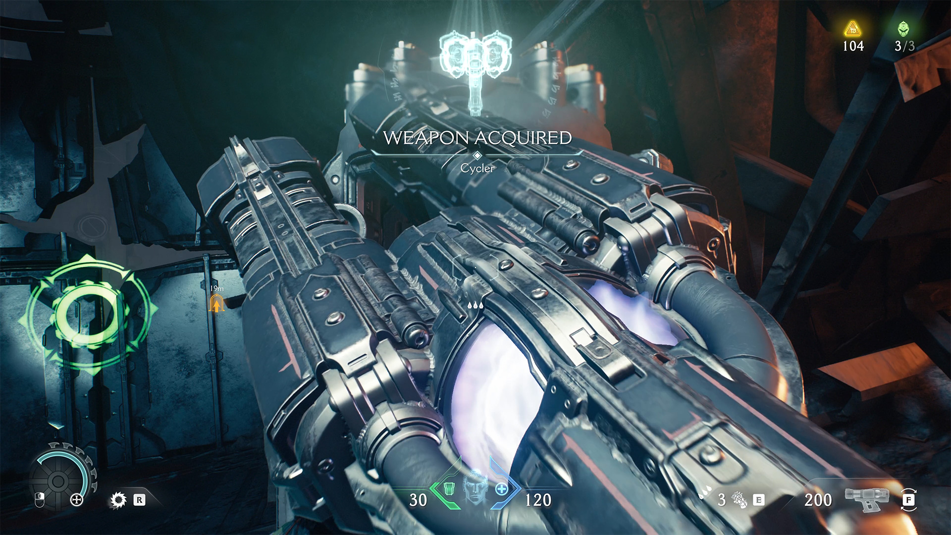 The Cycler is a dual-barreled plasma assault weapon available in Chapter 5, “The Holy City of Aratum,” where players can find it on one of the ships in the initial segment of the level. The Cycler has increased accuracy and range compared to the Accelerator, and its plasma bolts effectively destroy demon energy shields and damage reactive enemies.