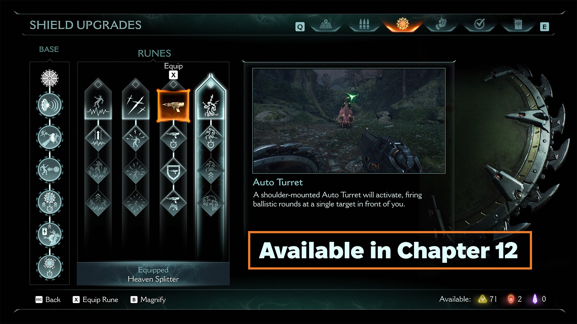 The third rune, Auto Turret, is the best in my opinion. You will receive this rune in Chapter 12. When this rune is activated, a turret appears on your left shoulder, which deals damage to the enemy in front of you. Upgrading the rune gives you several bonuses. Damage and firing speed increase, and enemies drop health that you can replenish yourself. It’s a kind of vampirism. A very useful and effective rune.