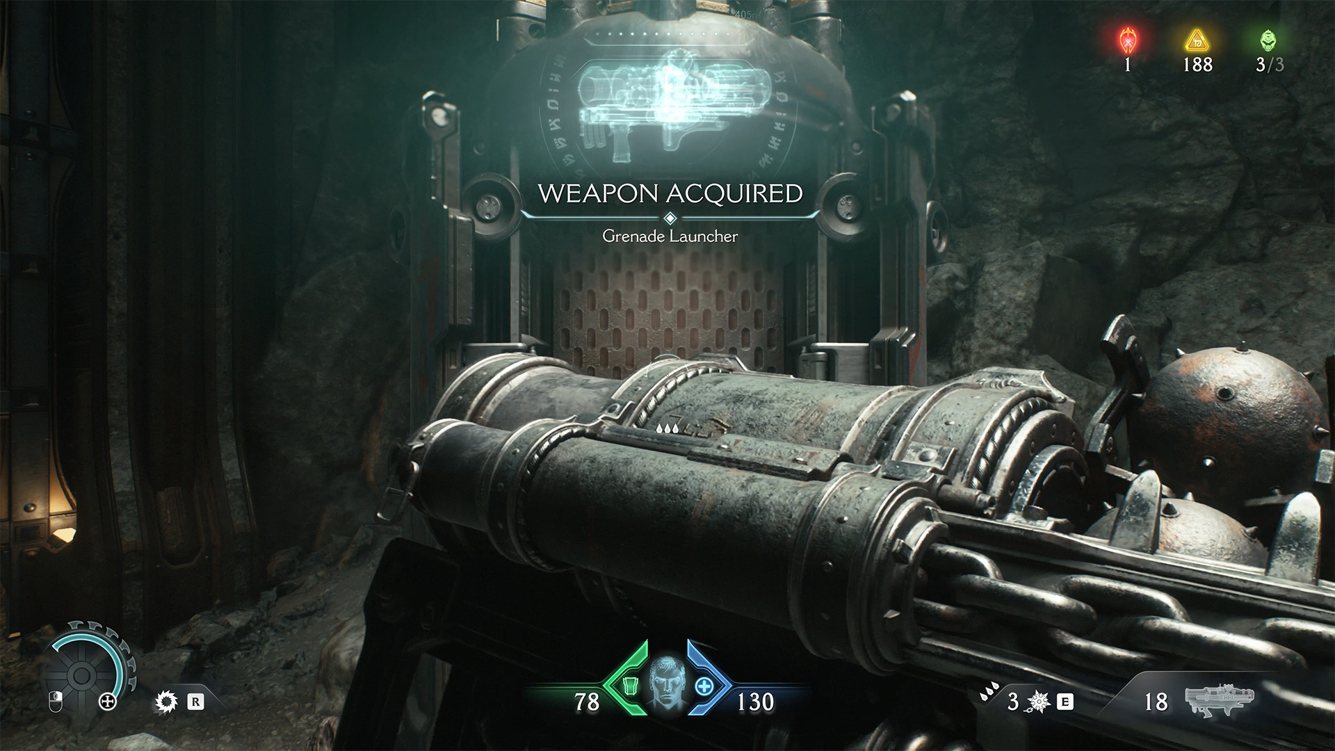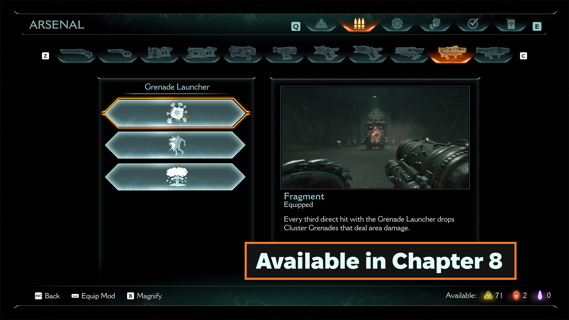 The Grenade Launcher in Doom: The Dark Ages is a heavy explosive weapon that the player receives in the eighth chapter, “Abyssal Forest,” after descending into the mine level. It fires grenades that bounce off surfaces and explode on contact with enemies, damaging everyone in the blast zone, making it extremely effective against groups of enemies and armored opponents.