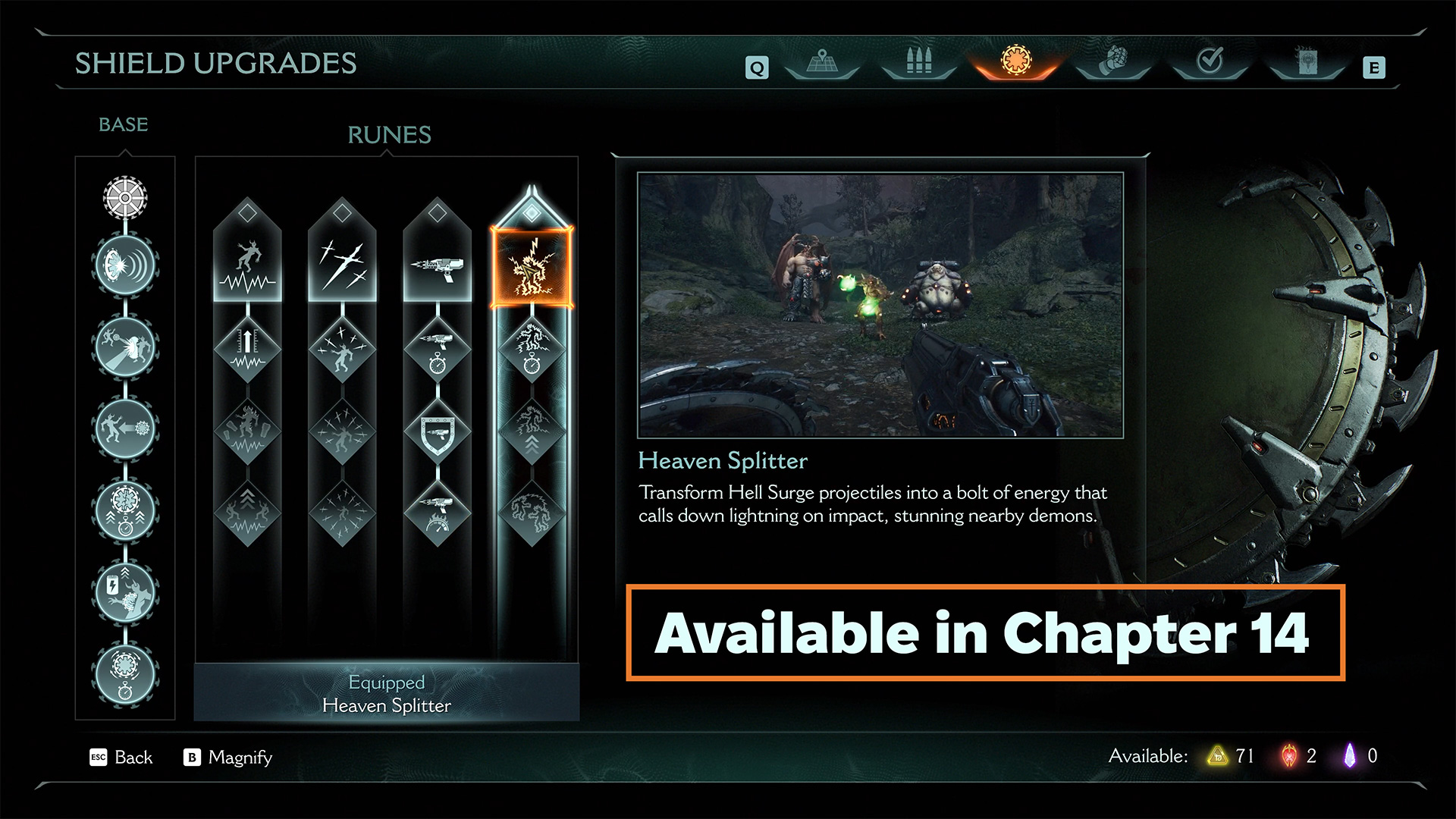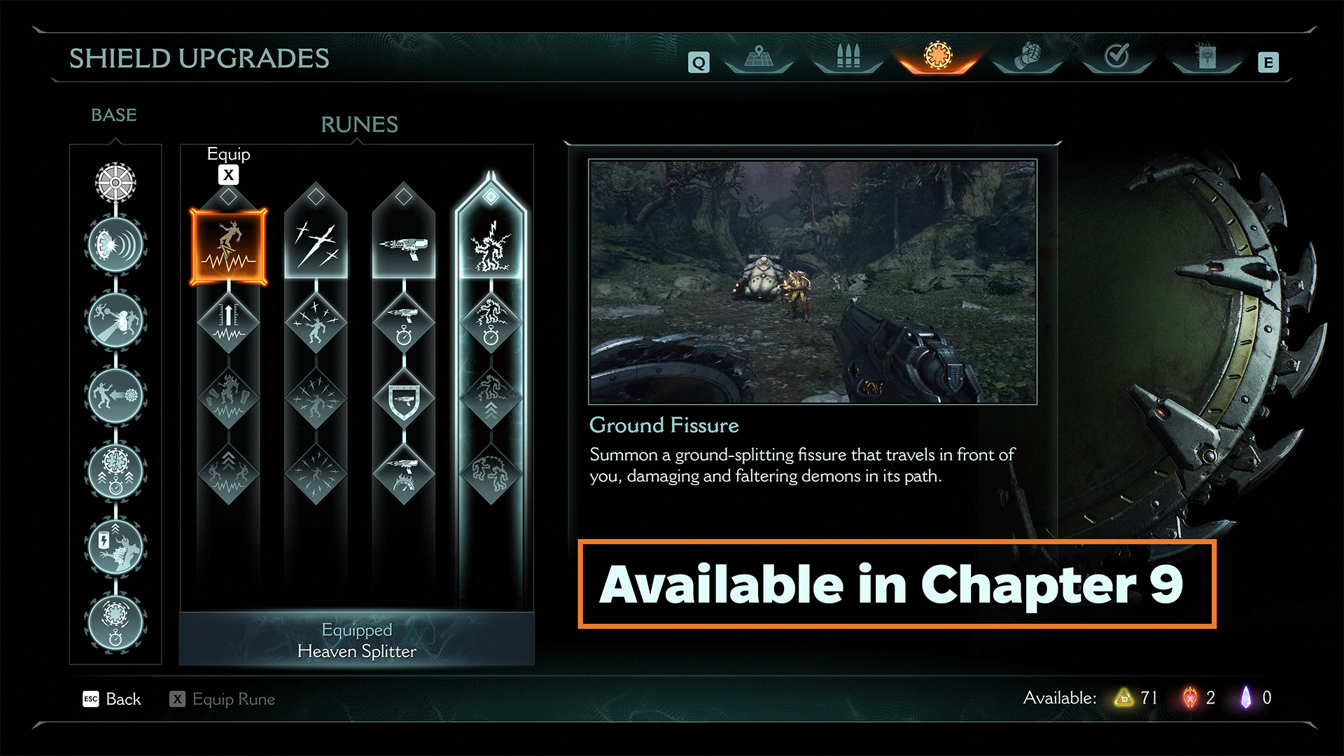You will receive your first rune in Chapter 9. This rune is called Ground Fissure. After deflecting a green attack, a crack forms in the ground in front of you, dealing a small amount of damage to all enemies standing in front of you. Upgrading this rune increases the damage, range, and slightly replenishes your armor.