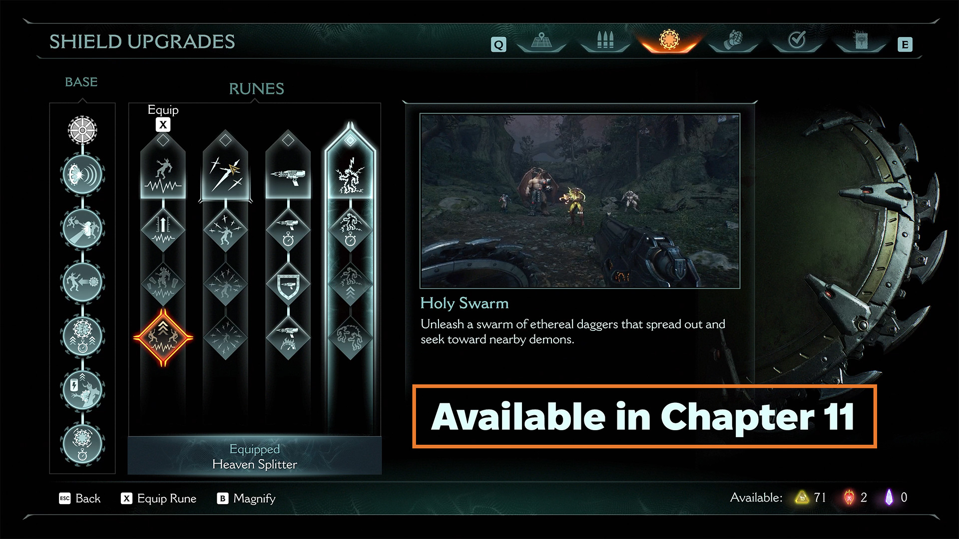 The next rune, Holy Swarm, will be unlocked for you in Chapter 11. After repelling a green attack, the rune creates ethereal daggers that randomly damage enemies around it. This is uncontrollable additional AOE damage. Upgrading this rune increases the damage dealt by these ethereal daggers and increases their number.