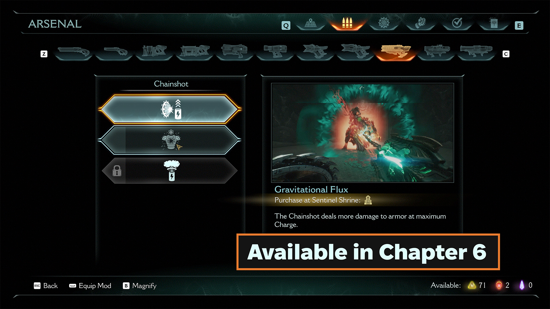 The second level, Gravitational Flux, increases the damage Chainshot deals to armor at maximum charge, making it useful against heavily armored enemies. The third level, Cosmic Breach, adds an explosion effect on impact, allowing you to effectively destroy groups of enemies. Completing all upgrade levels unlocks the Reverberation mastery challenge, in which the player must deal 100 explosive damage with fully charged Chainshot shots. Successfully completing this challenge rewards the player with the Conqueror gold skin.