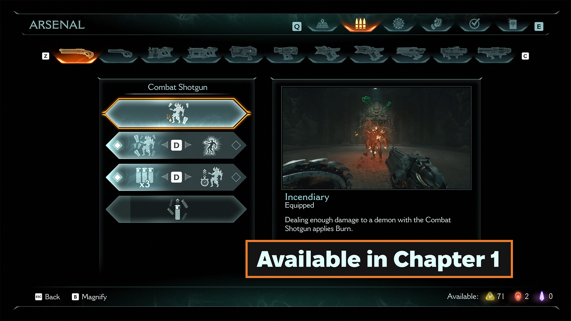 A special feature of the shotgun is its upgrade system: at the first levels, you can unlock the Incendiary modification, which causes enemies to burn and drop their armor when destroyed, and then choose between Smelt, which increases the amount of armor fragments, and Blast, which adds an explosive effect when a demon dies. Subsequent upgrades allow you to either fire a series of three quick shots (Tune Up) or immediately ignite targets with the first shot (Flare-Up).