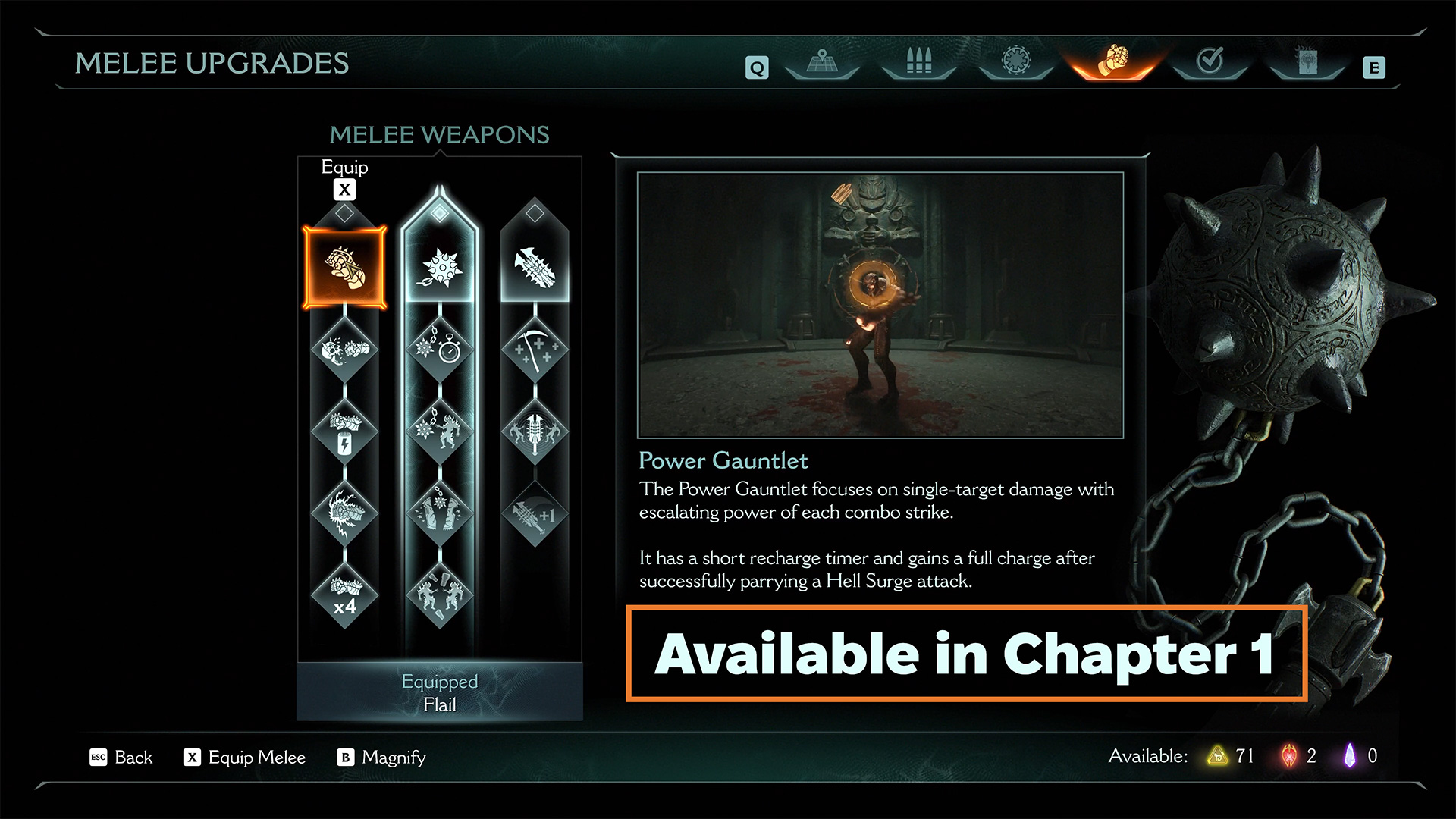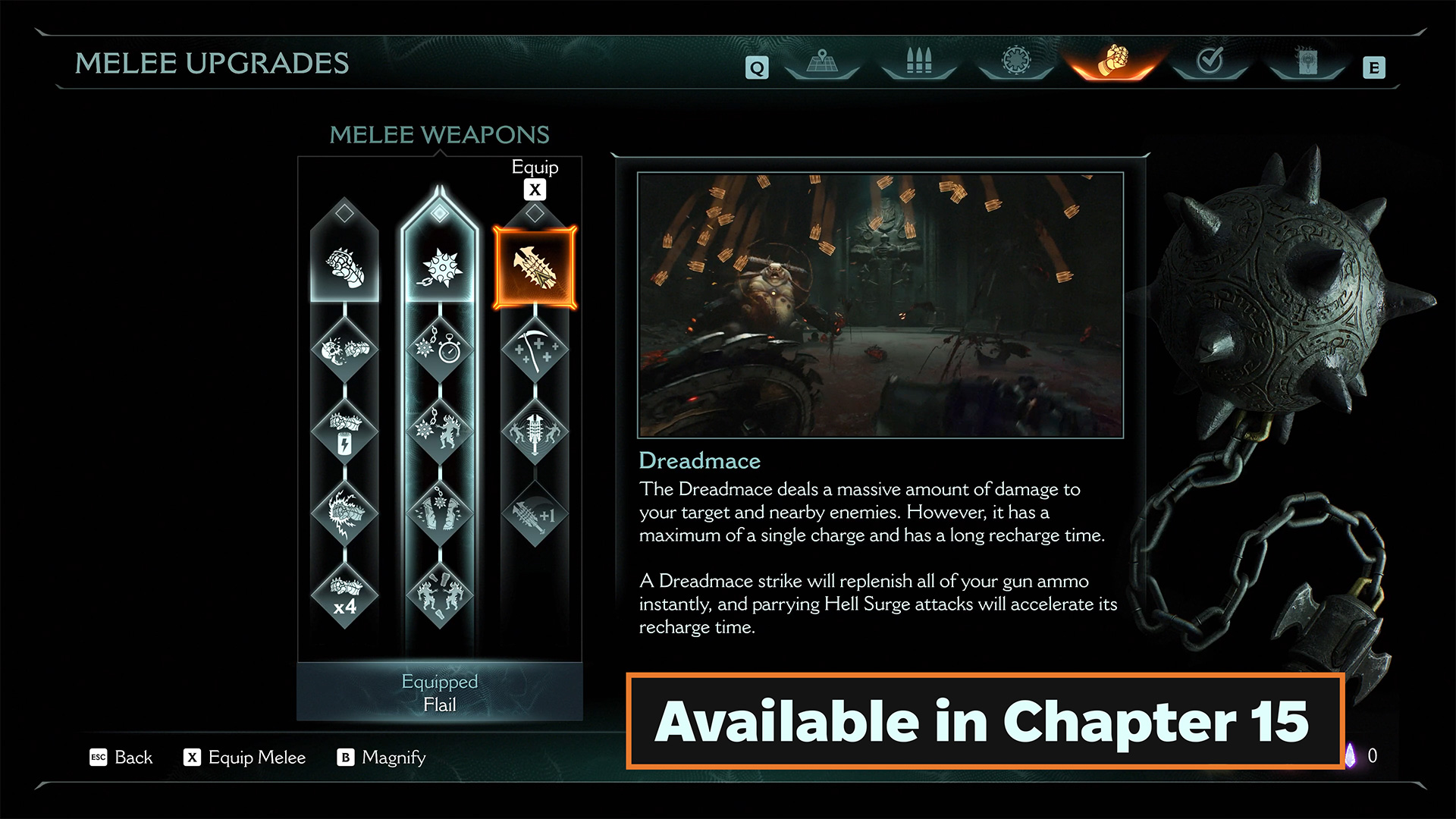 Dreadmace is introduced in Chapter 15. It deals massive damage with just one blow, and offers ammunition refunds to those who prefer slower, more punishing attacks. Dreadmace, a massive spiked weapon that can crush demons to pulp, is pure power. It is slower than most melee weapons but hits harder.