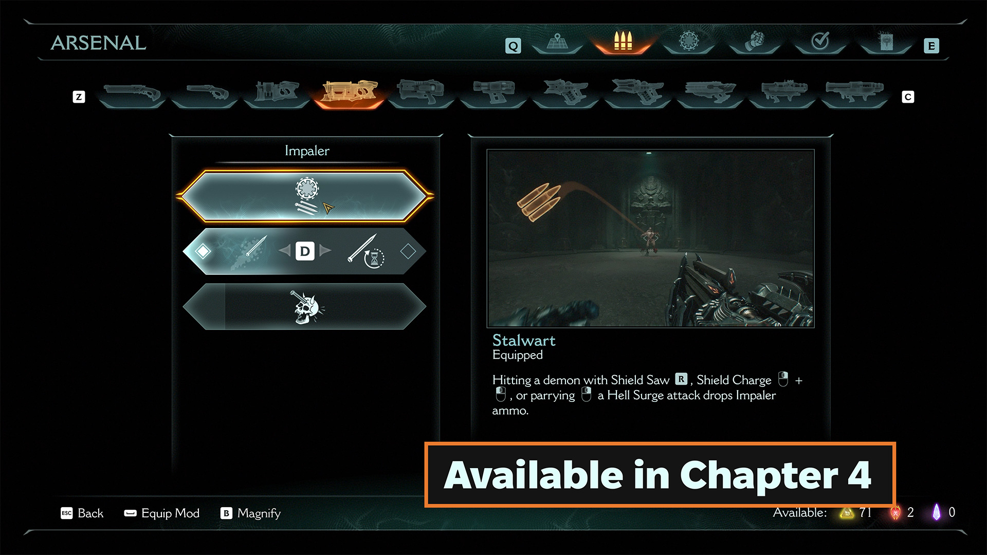 Although it has limited ammunition, it is ideal for quickly eliminating dangerous enemies or even powerful demons with a single shot. In the upgrade system, the first level of Stalwart allows you to get additional Impaler charges when performing actions with a shield — such as throwing, accelerated strikes, or parrying Hell Surge. The second level offers a choice between two options: Salvage, which provides a boost to the next shot after picking up ammunition, or Chronospike, which slows down time when the fire button is pressed and increases the damage of projectiles fired at that moment.