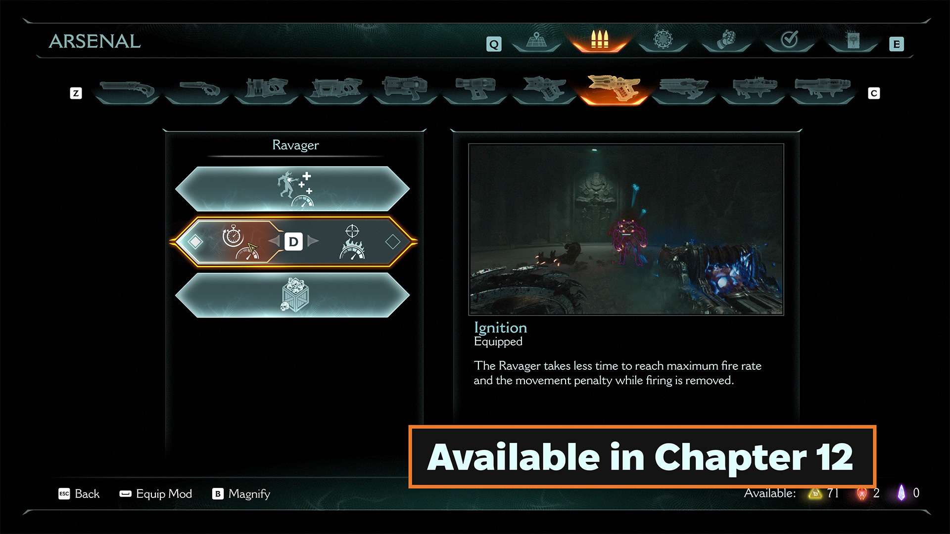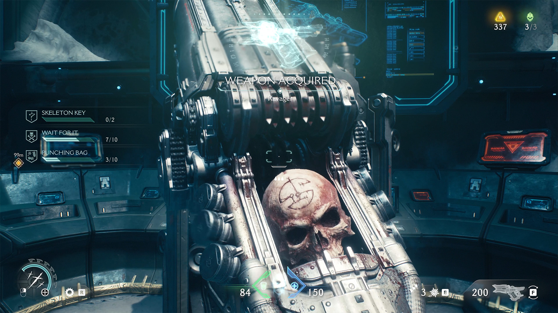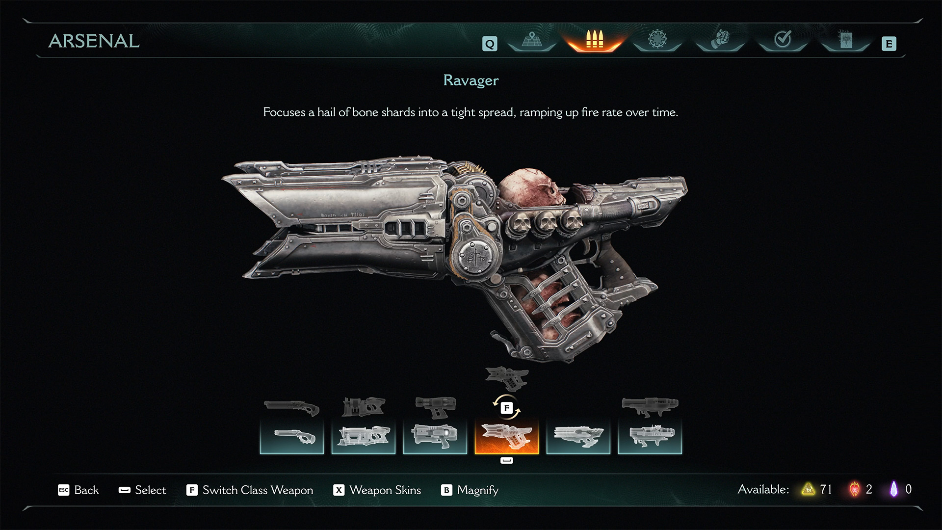 The Ravager is a formidable version of the Skullcrusher class, which the player finds in the twelfth chapter, titled “Sentinel Command Station,” located in a special weapon capsule next to the console. This weapon fires a rapid stream of bone fragments in a narrow area of effect, and its rate of fire increases when the player holds down the fire button, but movement slows down at the same time — just like the Pulverizer, but the Ravager has a more focused, directed attack.