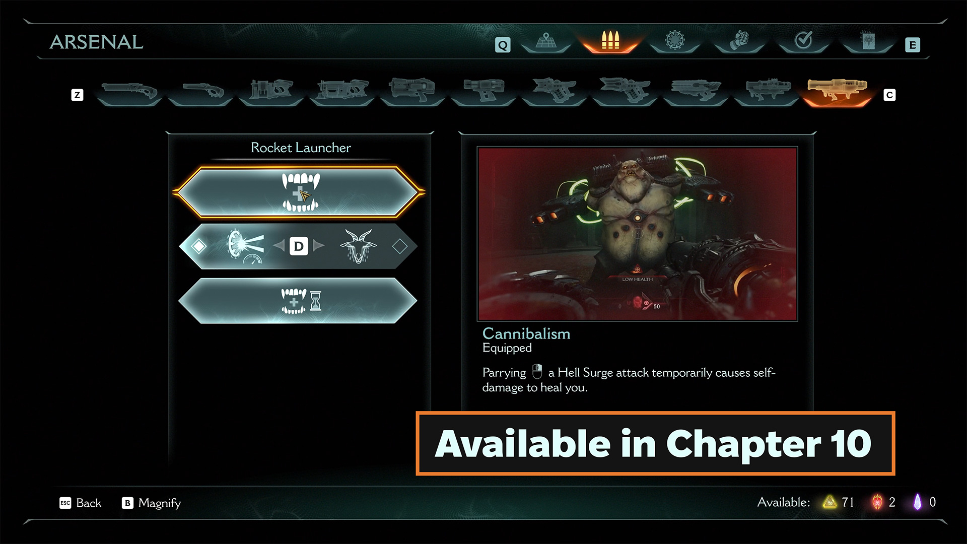 The weapon has a limited rate of fire and requires precise timing, especially when using the parry mechanic, which adds an element of strategy to its use. The Rocket Launcher upgrade system consists of three levels: the first, Cannibalism, allows you to parry Hell Surge attacks, temporarily converting the damage taken into health restoration; the second, Cooked and Blood Sacrifice, allows you to choose between increasing the power of the next shot after parrying or increasing the damage from the explosion at the cost of greater self-damage; the third, Bloodlust, significantly prolongs the effect of Cannibalism, allowing you to recover health longer after parries.
