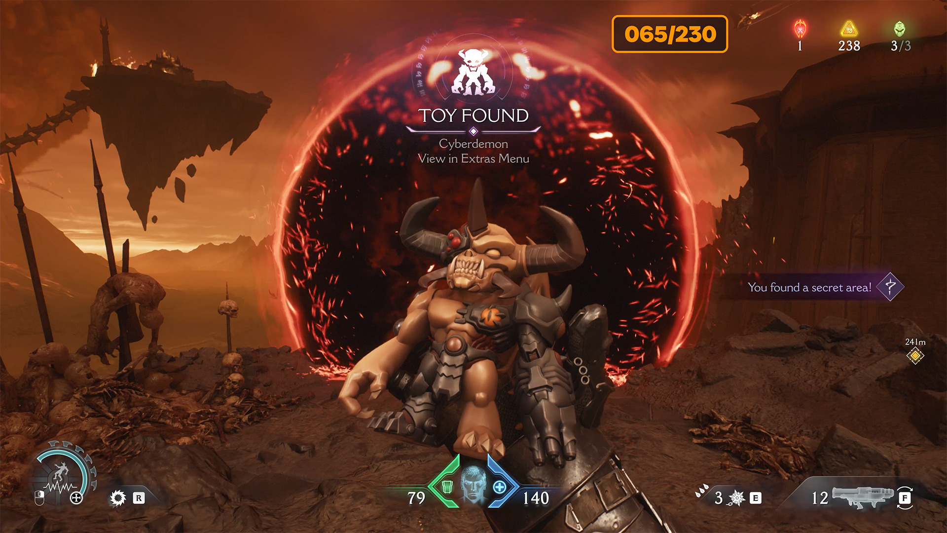 After obtaining the ruby, turn left. You will see an accelerator below; jump towards it. It will throw you onto the platform ahead, where you will find a collectible Cyberdemon toy. To return from this platform to the main area, enter the portal and you will be transported back.