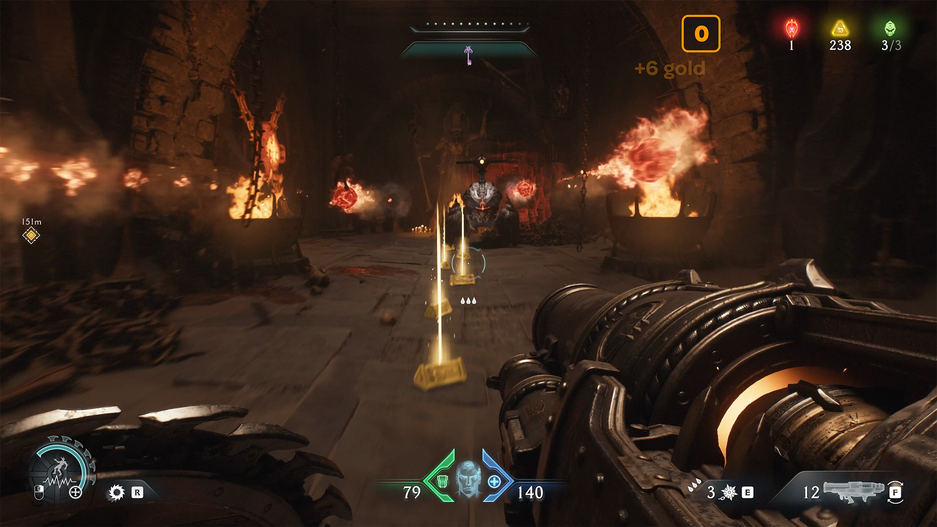 On the second floor, you will see a gold line on the floor. Before it begins, there will be a small balcony on the right and a ribbon laid out with armor replenishment elements. You need to go onto this balcony and throw your shield from there to break the metal connection in front of you. Now, collect 6 gold coins and go to the end of the floor to the balcony where you broke the metal connection.