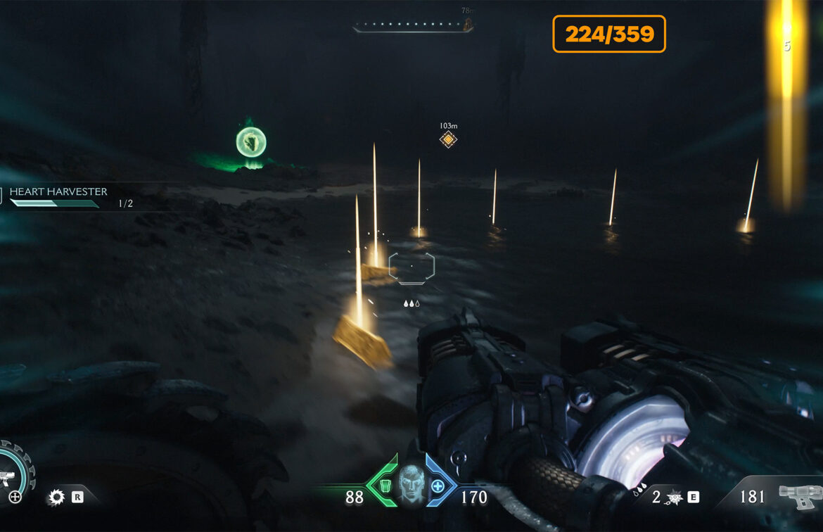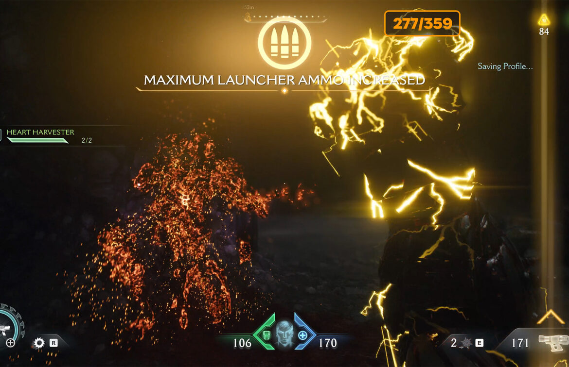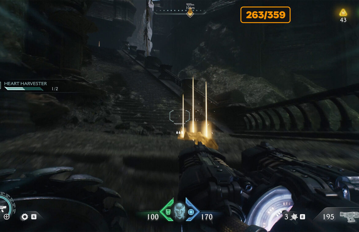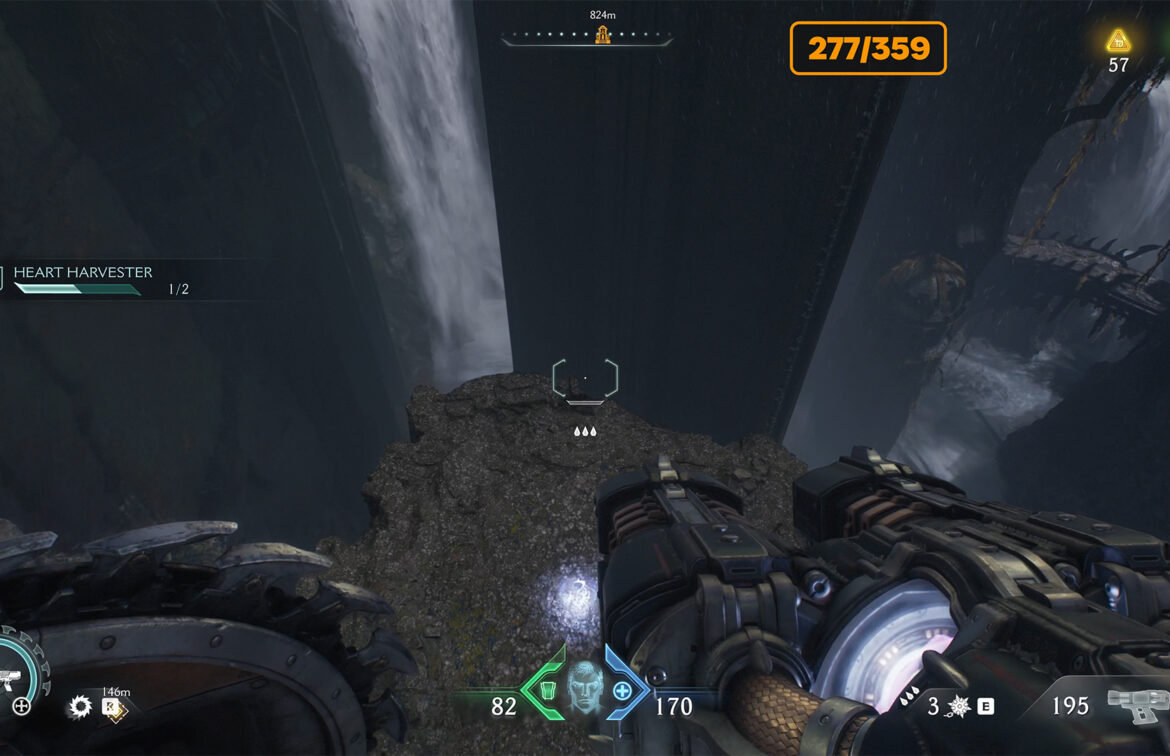 Next, you need to repeat the route, bend it to the upper floor with the help of an accelerator and from there follow the specified route to the yellow marker. Here you have to jump down to the red zone, where the battle awaits you. At the end of the fight, a mini boss will appear. After defeating him, you will get Demonic Essence Ammo.