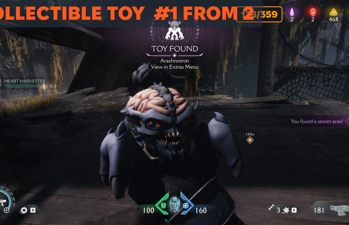 A little further on, you’ll see a wooden barrier. Break it with your shield and you will find yourself in a secret room where the first Arachnotron collectible toy is located. There will be two toys in total in this chapter, we will find the other a little later.
