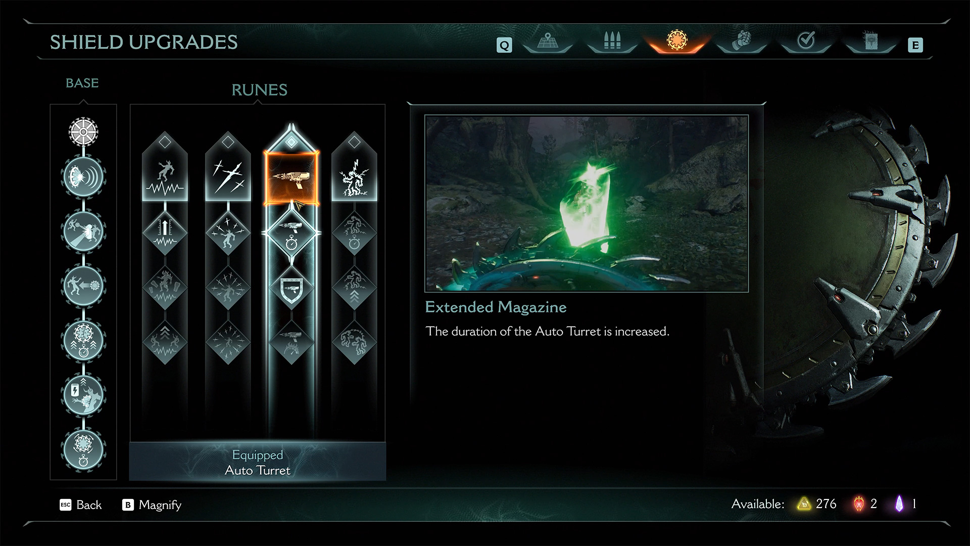 First of all, take away the fleece for the shield, it will automatically become active. Go to settings and activate the previous Auto Turret rune to be able to continue performing the second challenge in this chapter.