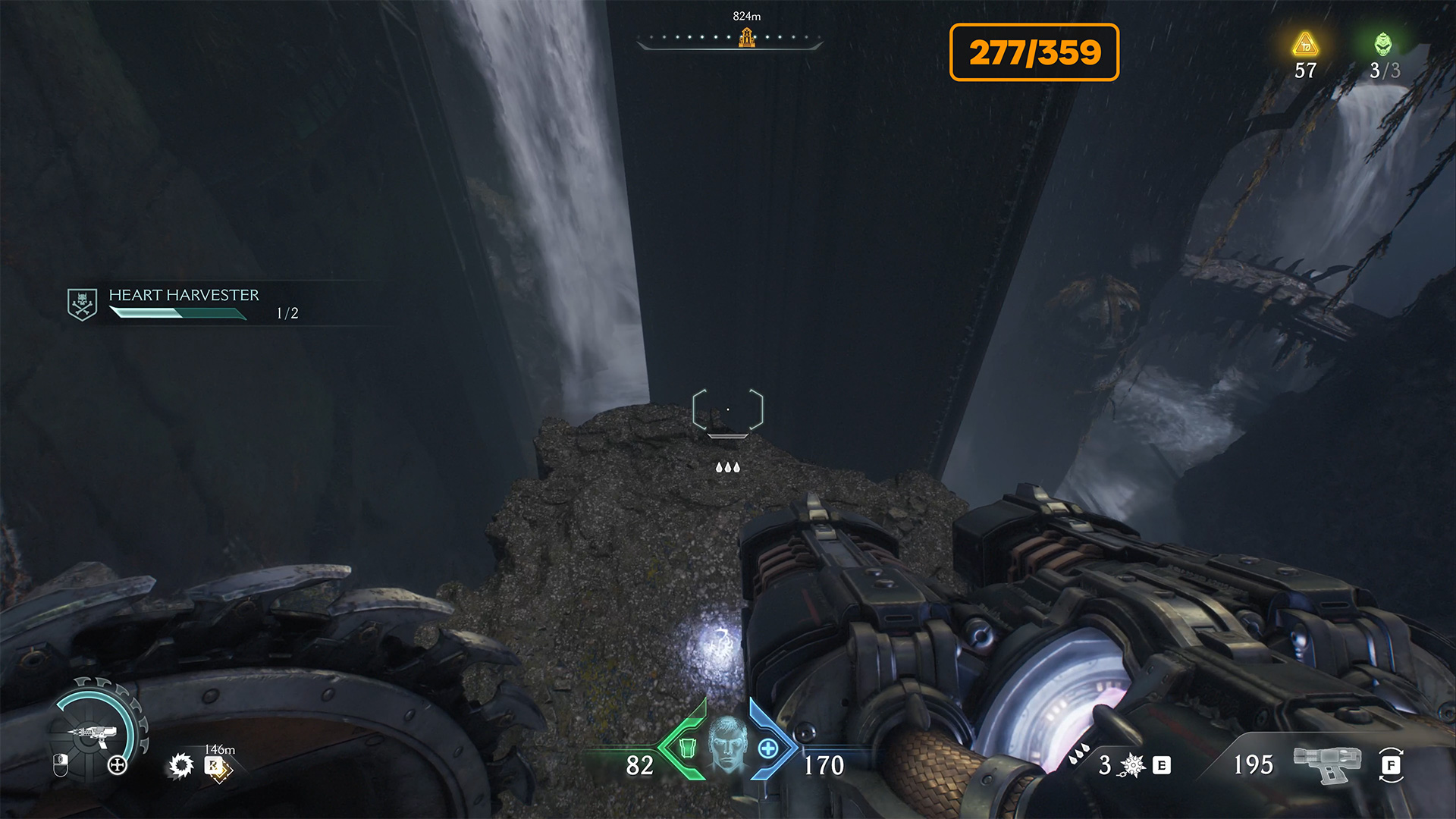 Next, you need to repeat the route, bend it to the upper floor with the help of an accelerator and from there follow the specified route to the yellow marker. Here you have to jump down to the red zone, where the battle awaits you. At the end of the fight, a mini boss will appear. After defeating him, you will get Demonic Essence Ammo.
