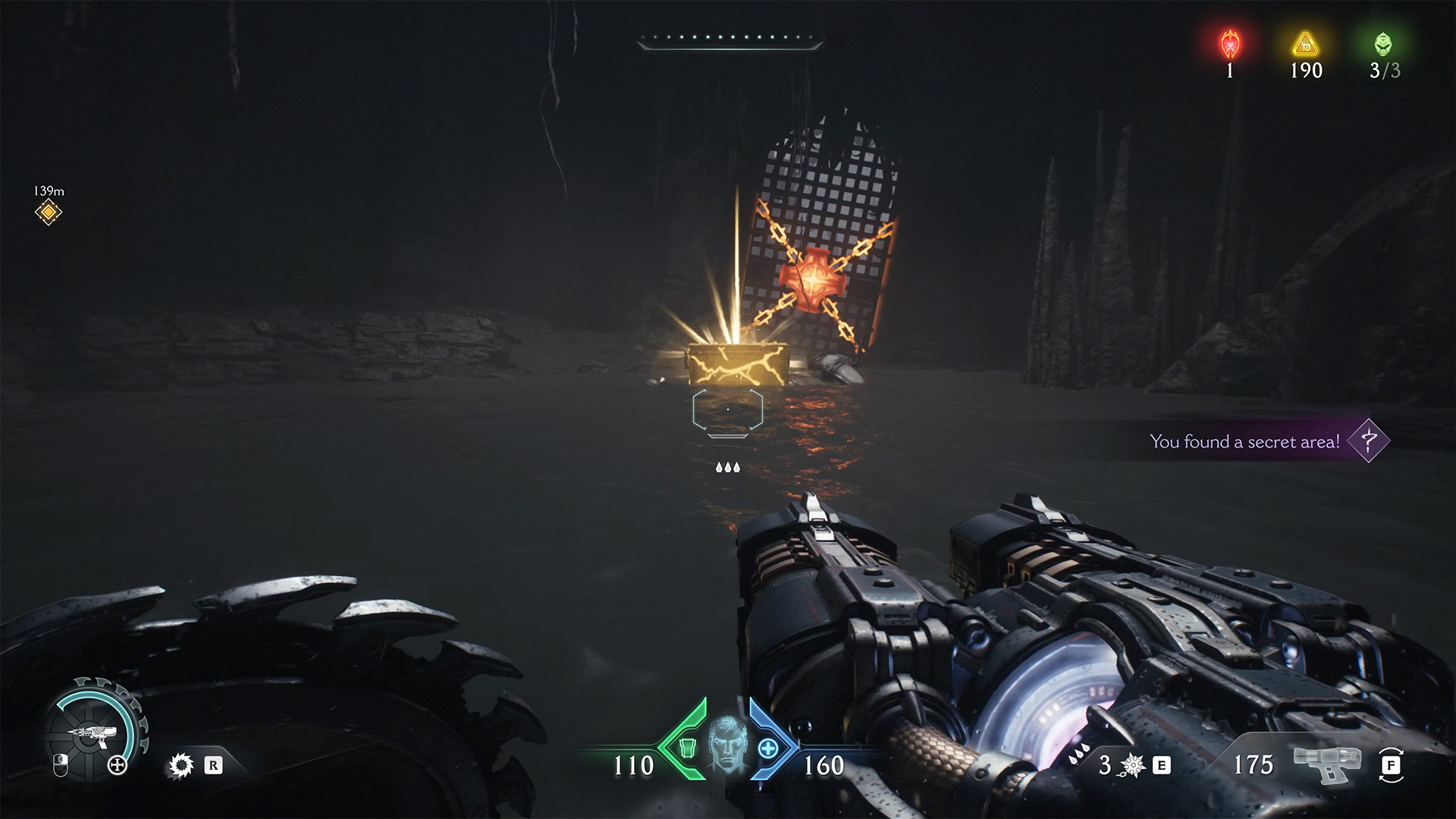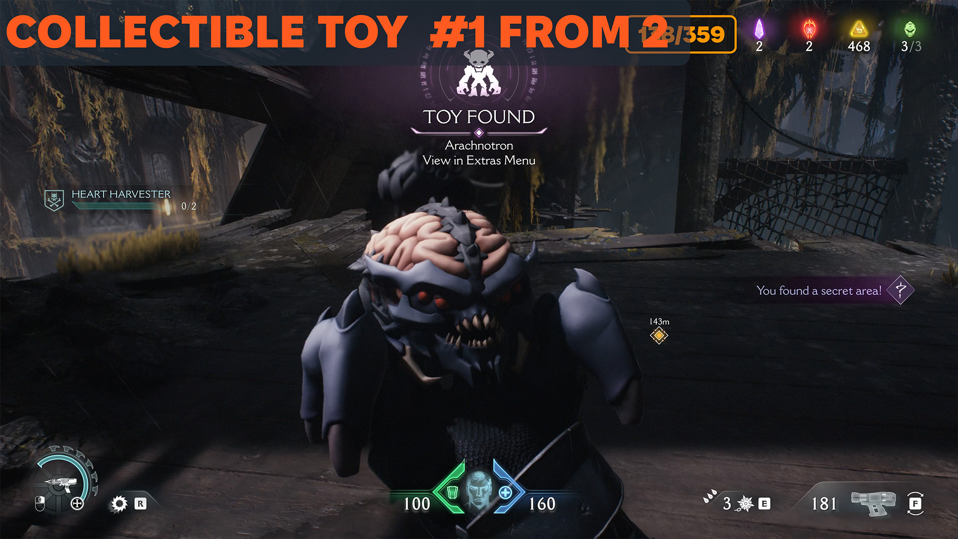 A little further on, you’ll see a wooden barrier. Break it with your shield and you will find yourself in a secret room where the first Arachnotron collectible toy is located. There will be two toys in total in this chapter, we will find the other a little later.