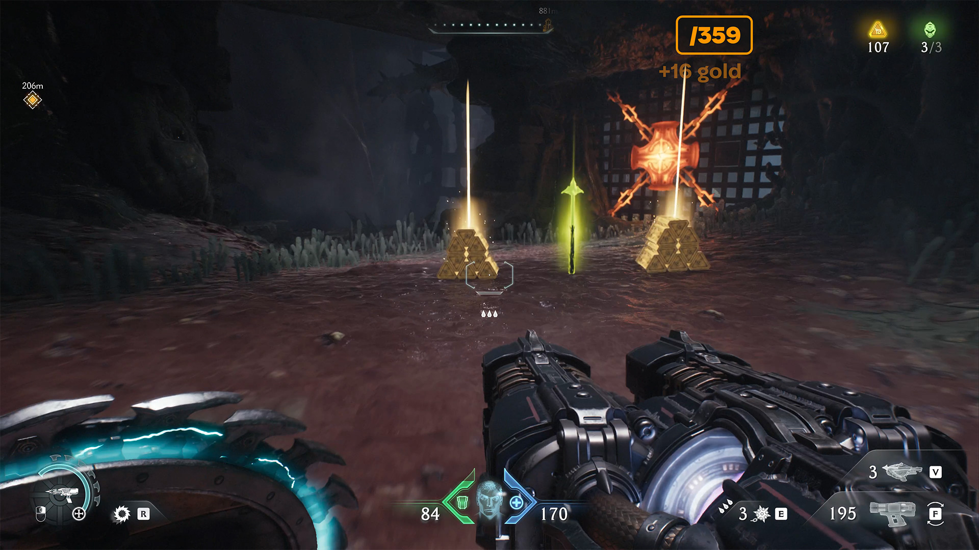 Now go to the elevator, which will take you down to the red zone, where there will be a battle with monsters. There are three places where gold is located. In total, you can collect 15 gold here. You can do it like me by running past enemies or you can collect gold after a battle. The main thing is to make sure that you have collected everything that lies here.