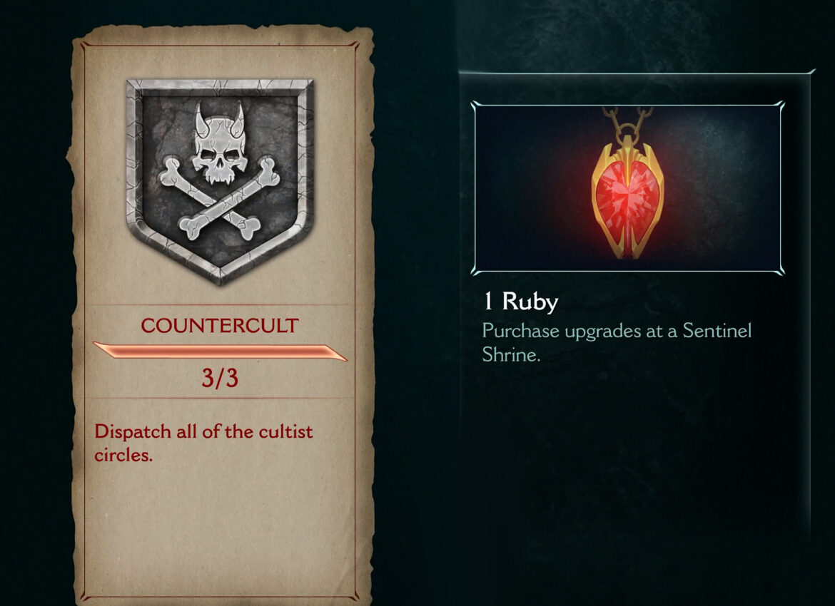 After destroying the third cultist circle, your Countercult challenge will be completed and you will automatically receive a reward – 1 ruby.