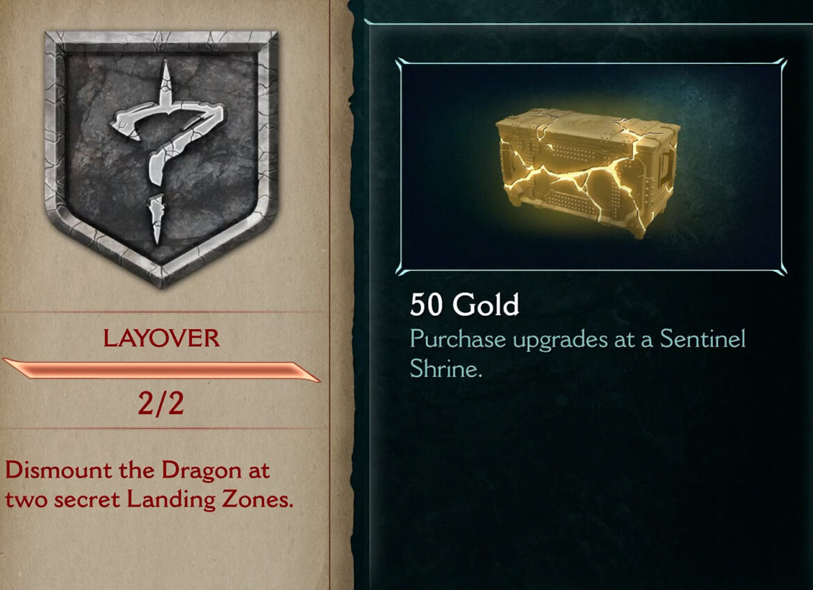 The Layover Challenge challenges players in Chapter 5 of Doom: The Dark Ages to dismount a dragon at two secret landing zones within Chapter 5, earning 50 Gold upon completion that can be used to upgrade weapons at Sentinel Shrine. Once available, this challenge becomes available upon reaching The Holy City of Aratum open-air section and receive an objective to destroy four Hell Carriers.
