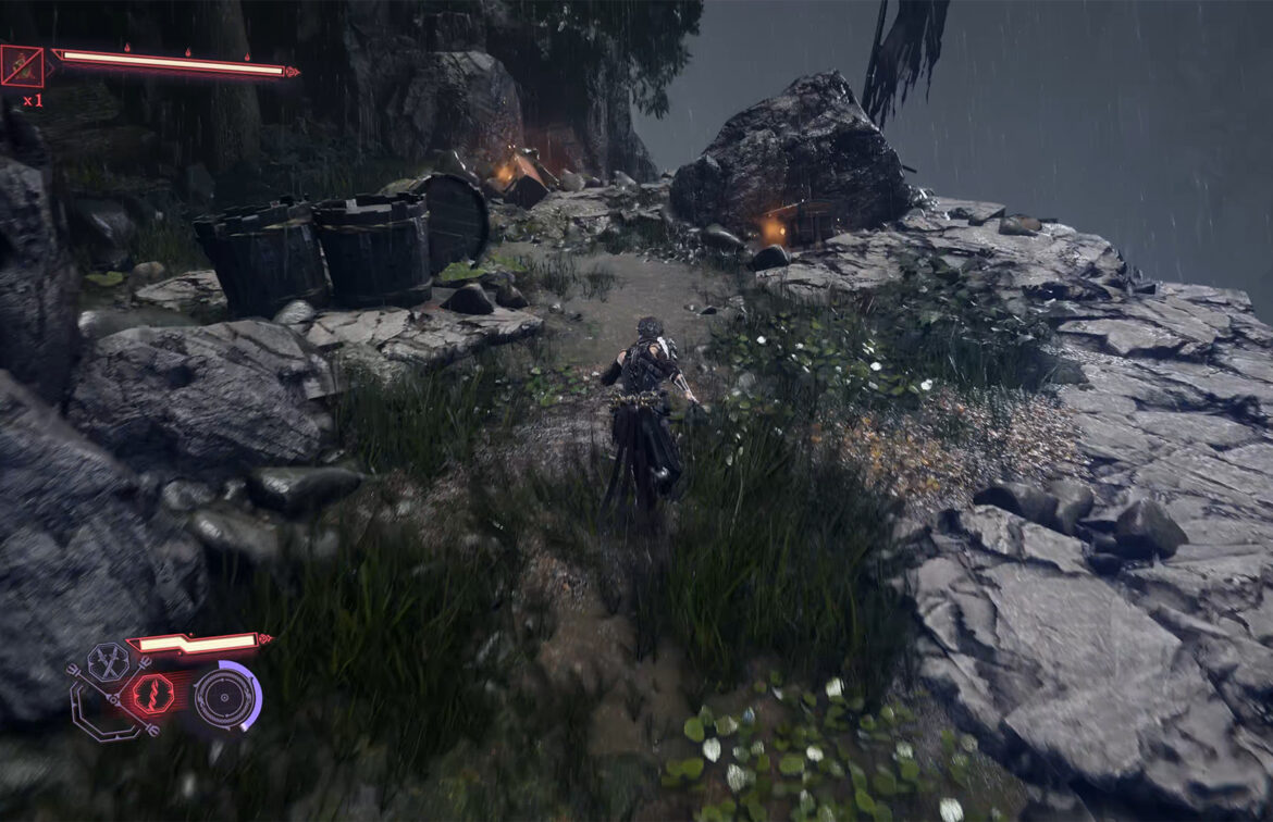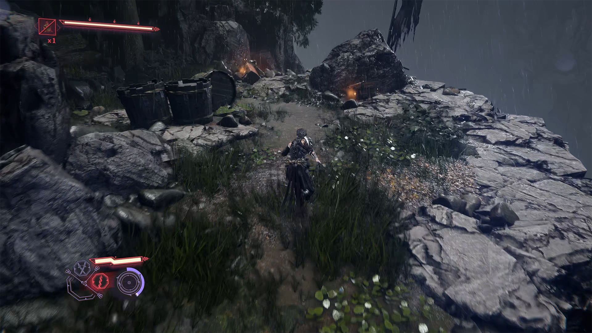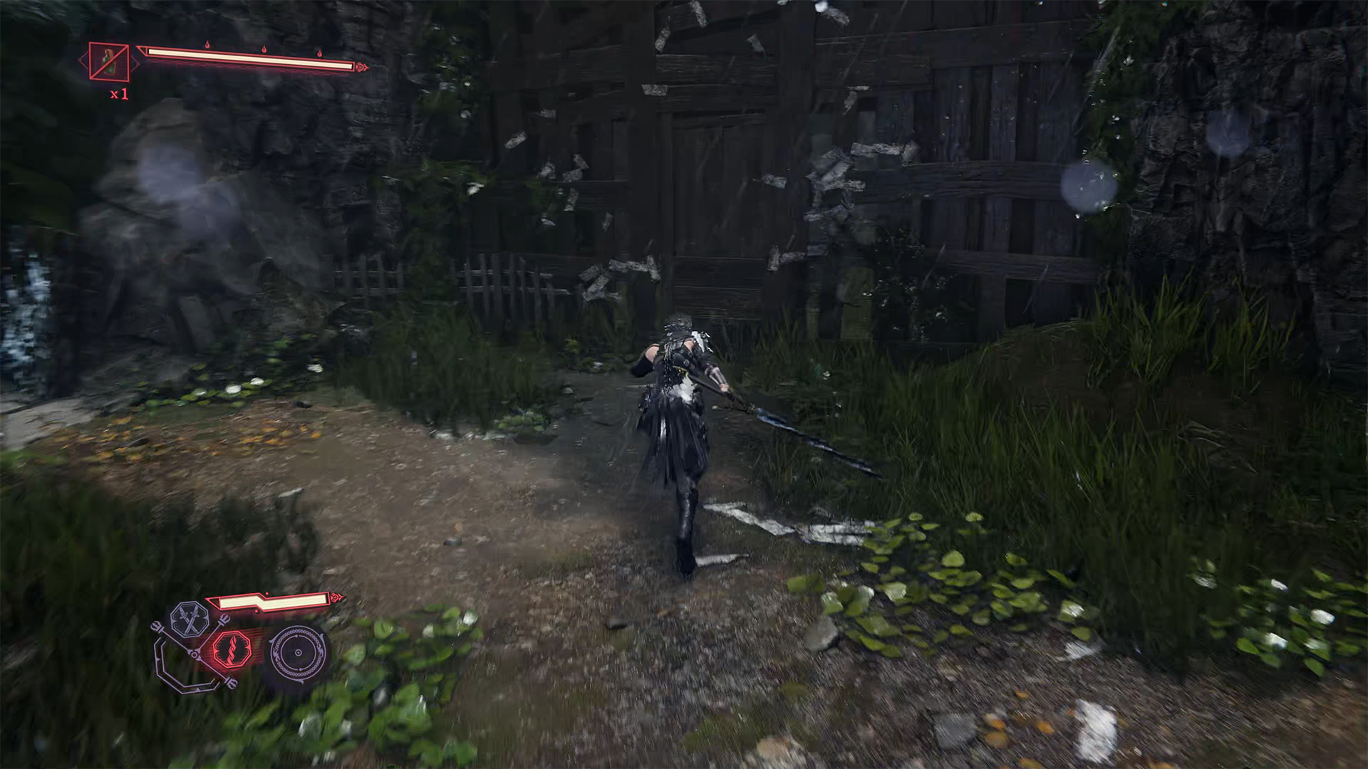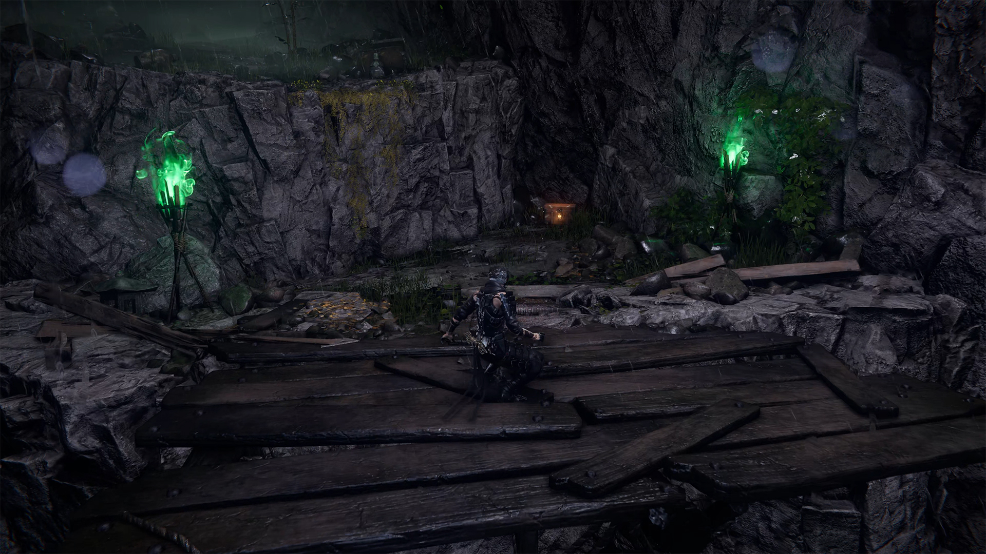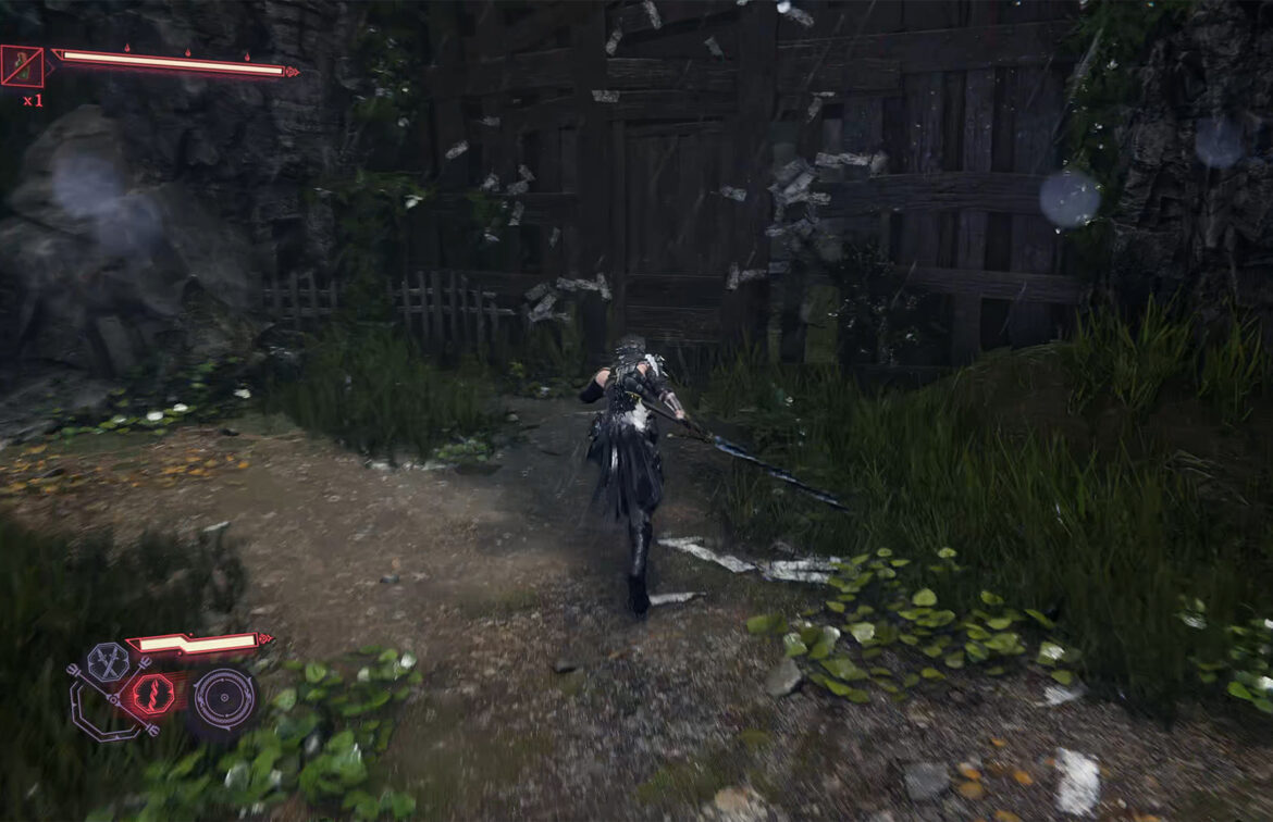 Now you are ready to set off on an adventure, and it awaits you just around the corner. After walking a short distance, you will encounter your first enemies. It is simple and there are no difficult bosses here. This battle is designed to help you learn the capabilities of your new weapon. After the battle, you will come to a place with a closed wooden door. When you open it, you will see a chest in front of you. Open it to get another Life Elixir. Then break down the wooden barrier and you will see that there are many enemies below.