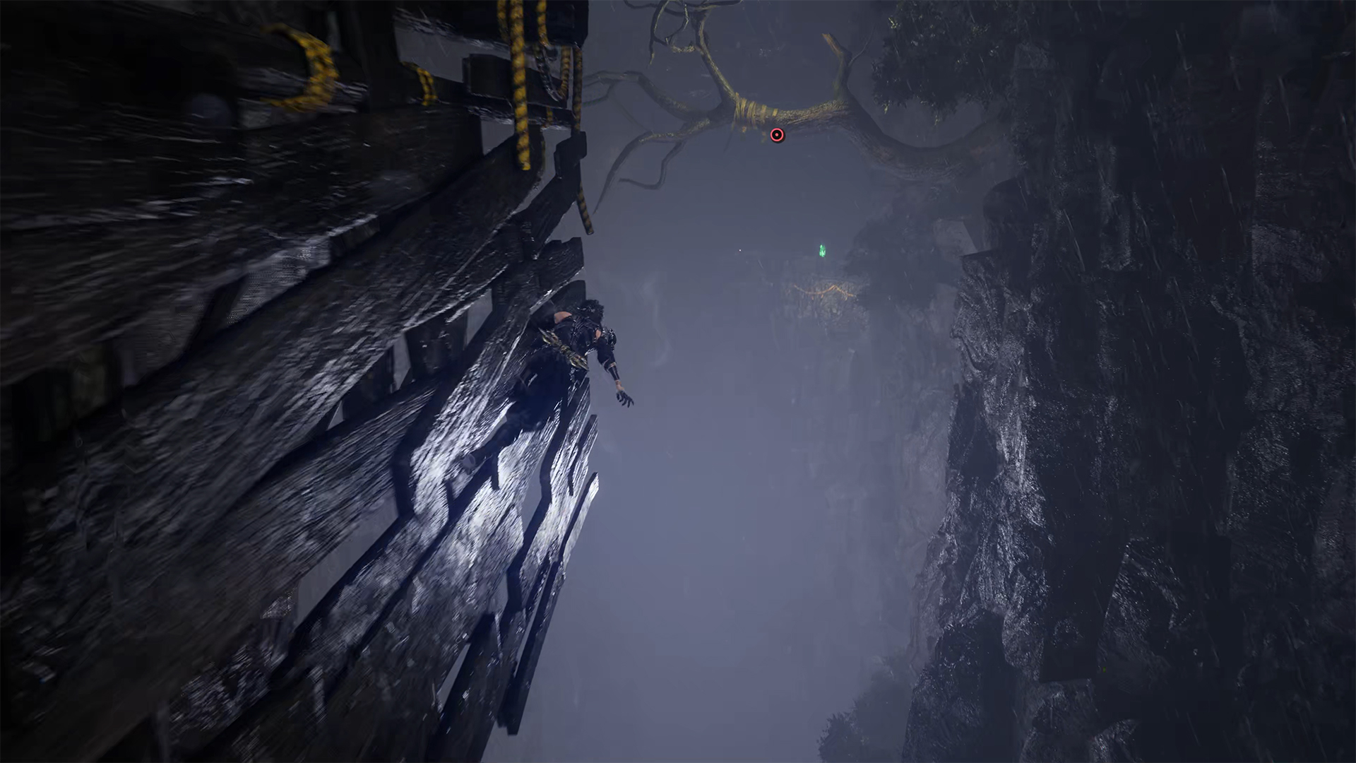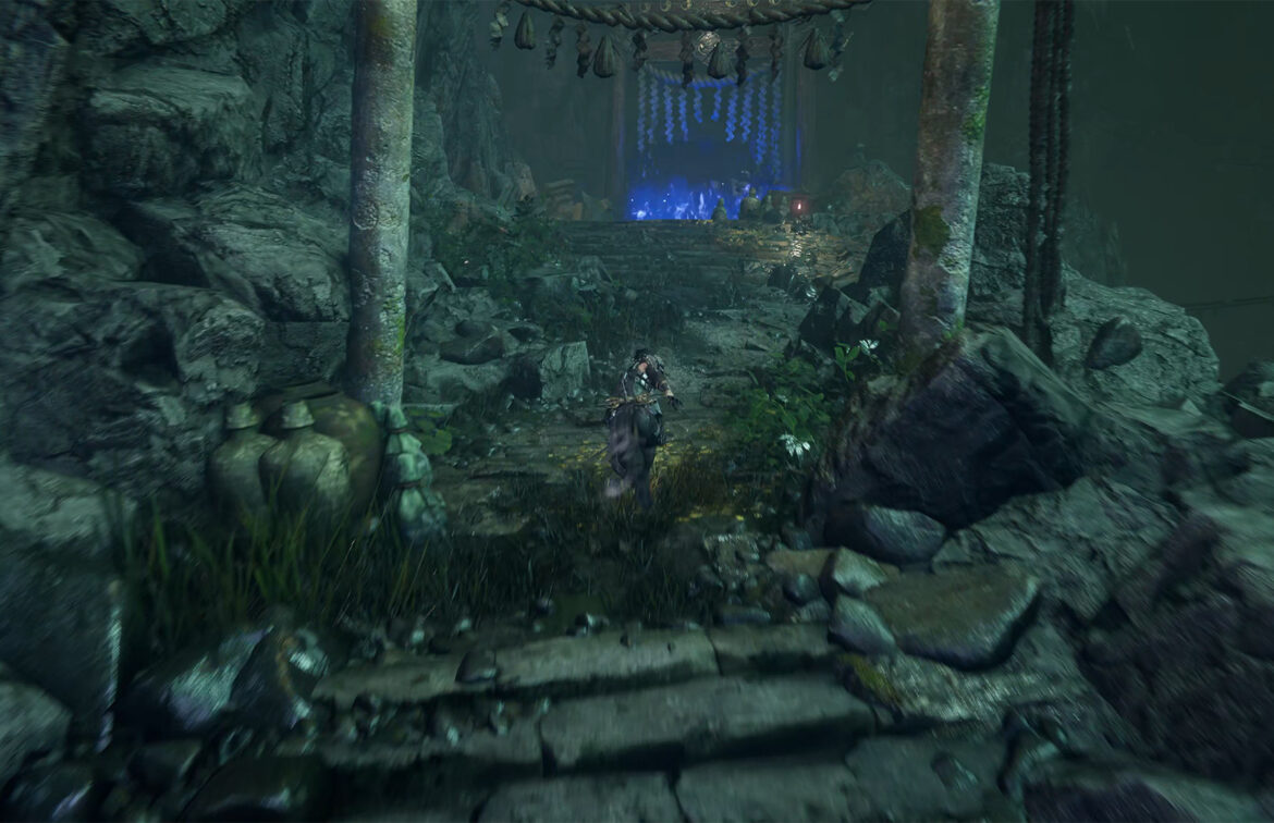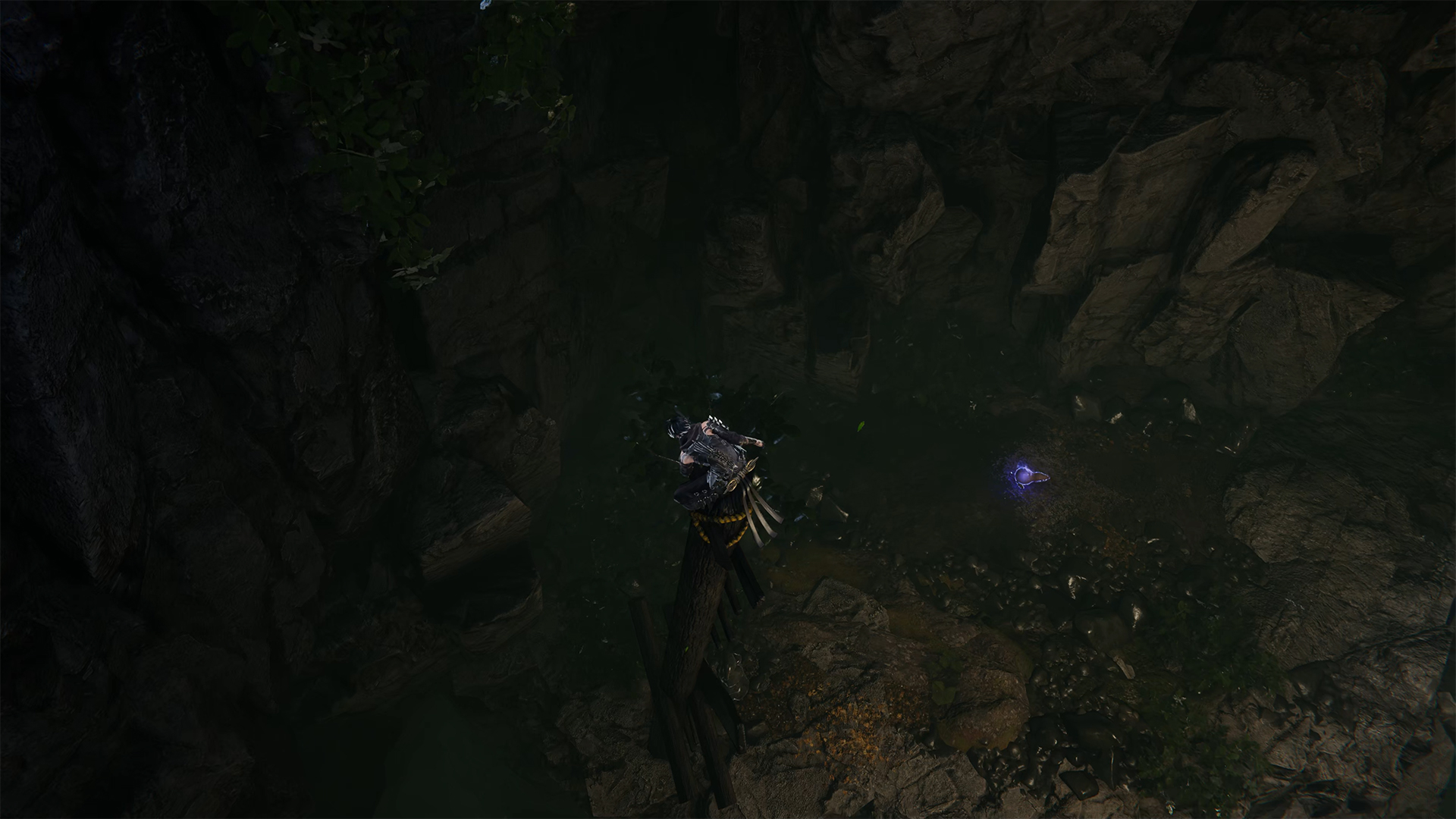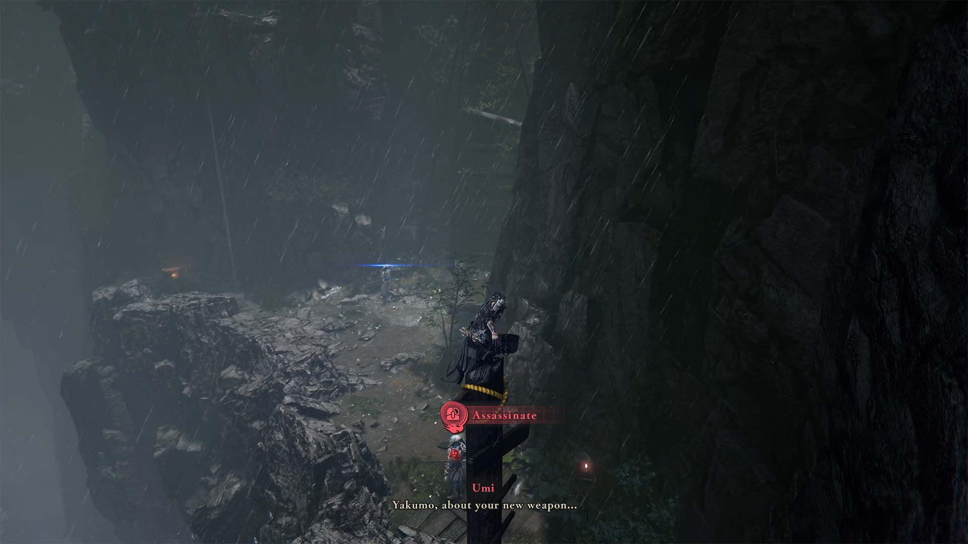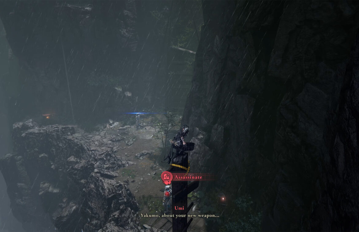 After a series of jumps using Caddis Wire, you will find yourself on a platform where you will encounter two regular Tengus. After that, your storyline path goes uphill. But before that, turn around and follow the path back along the wall.