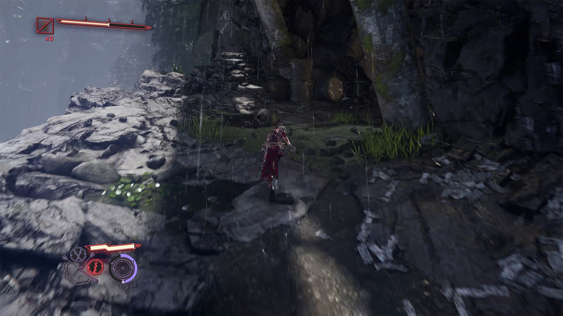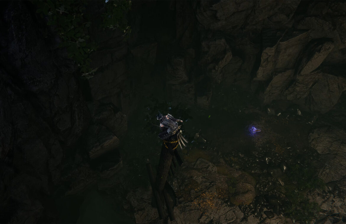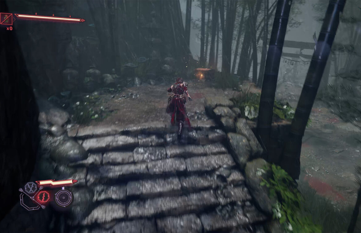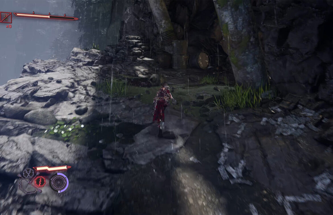 After a series of jumps using Caddis Wire, you will find yourself on a platform where you will encounter two regular Tengus. After that, your storyline path goes uphill. But before that, turn around and follow the path back along the wall.