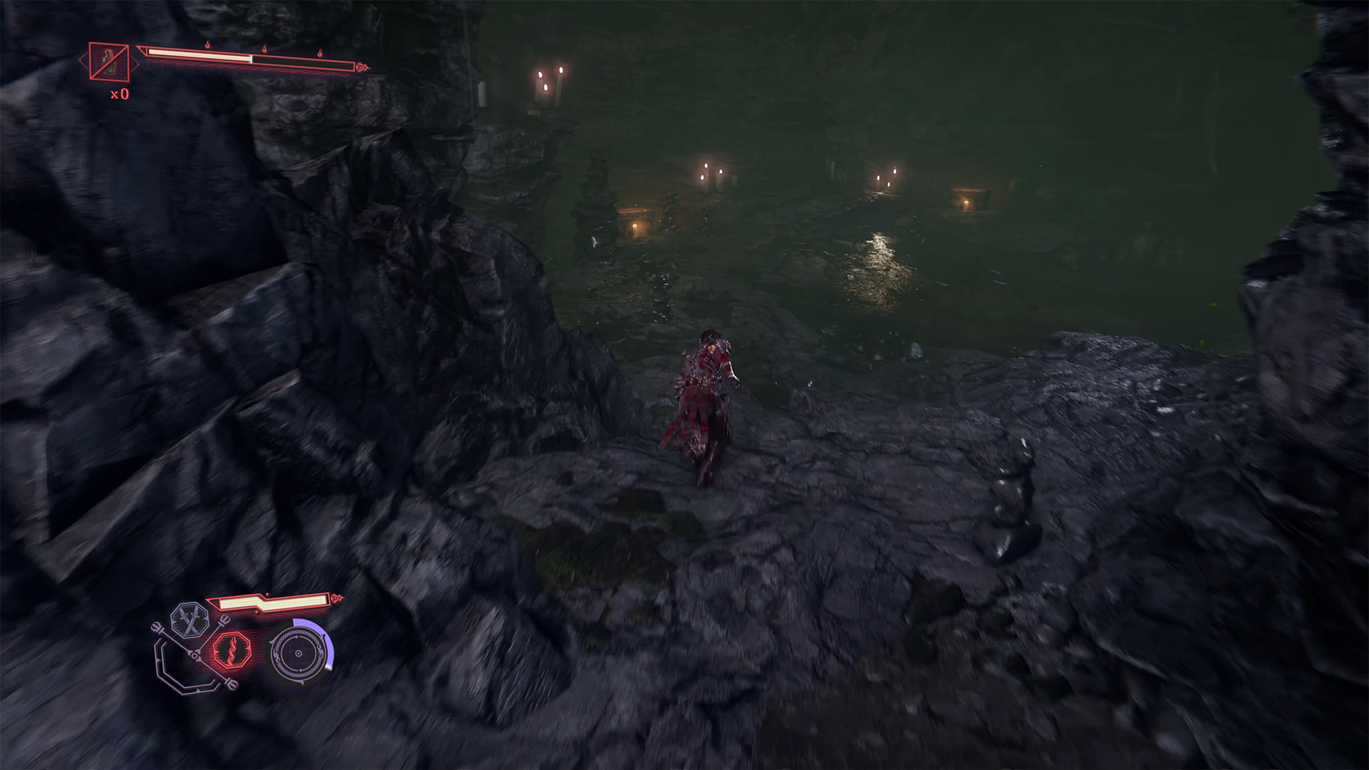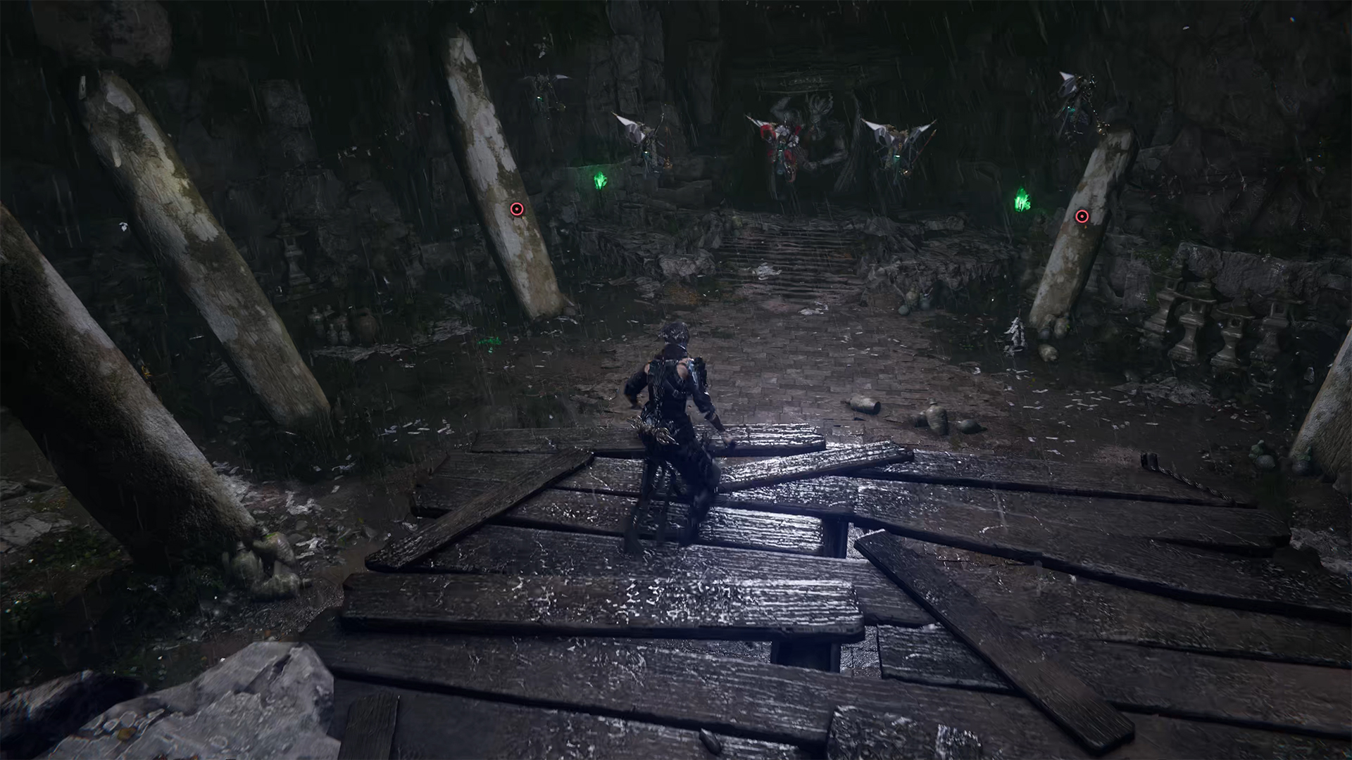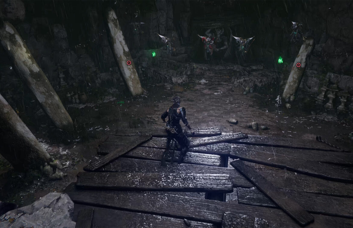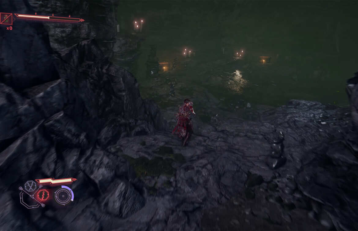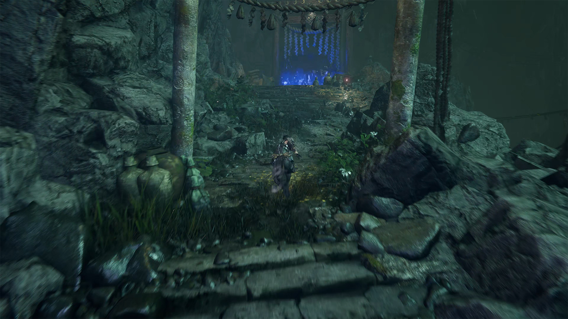 After a series of jumps using Caddis Wire, you will find yourself on a platform where you will encounter two regular Tengus. After that, your storyline path goes uphill. But before that, turn around and follow the path back along the wall.