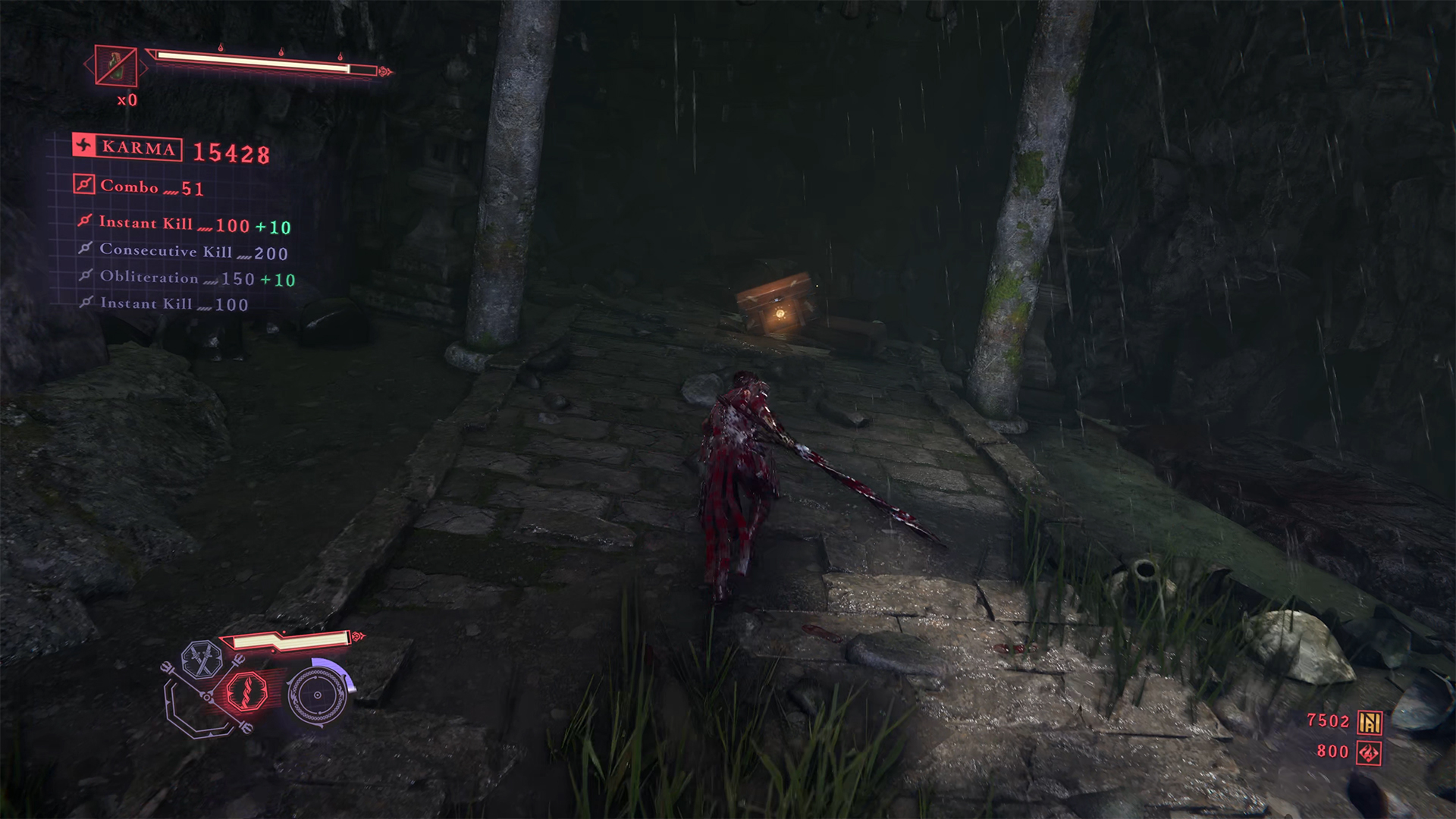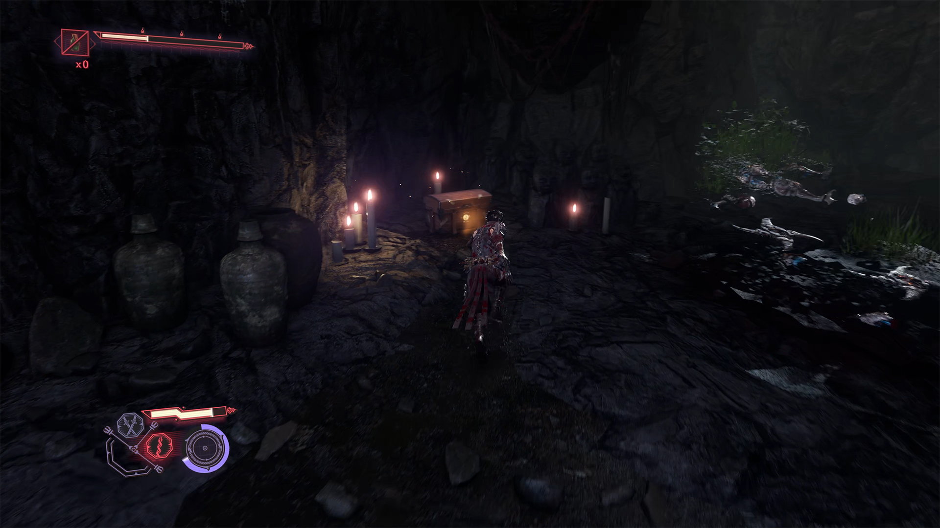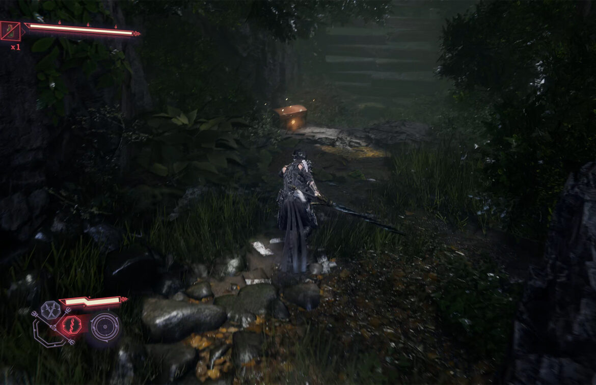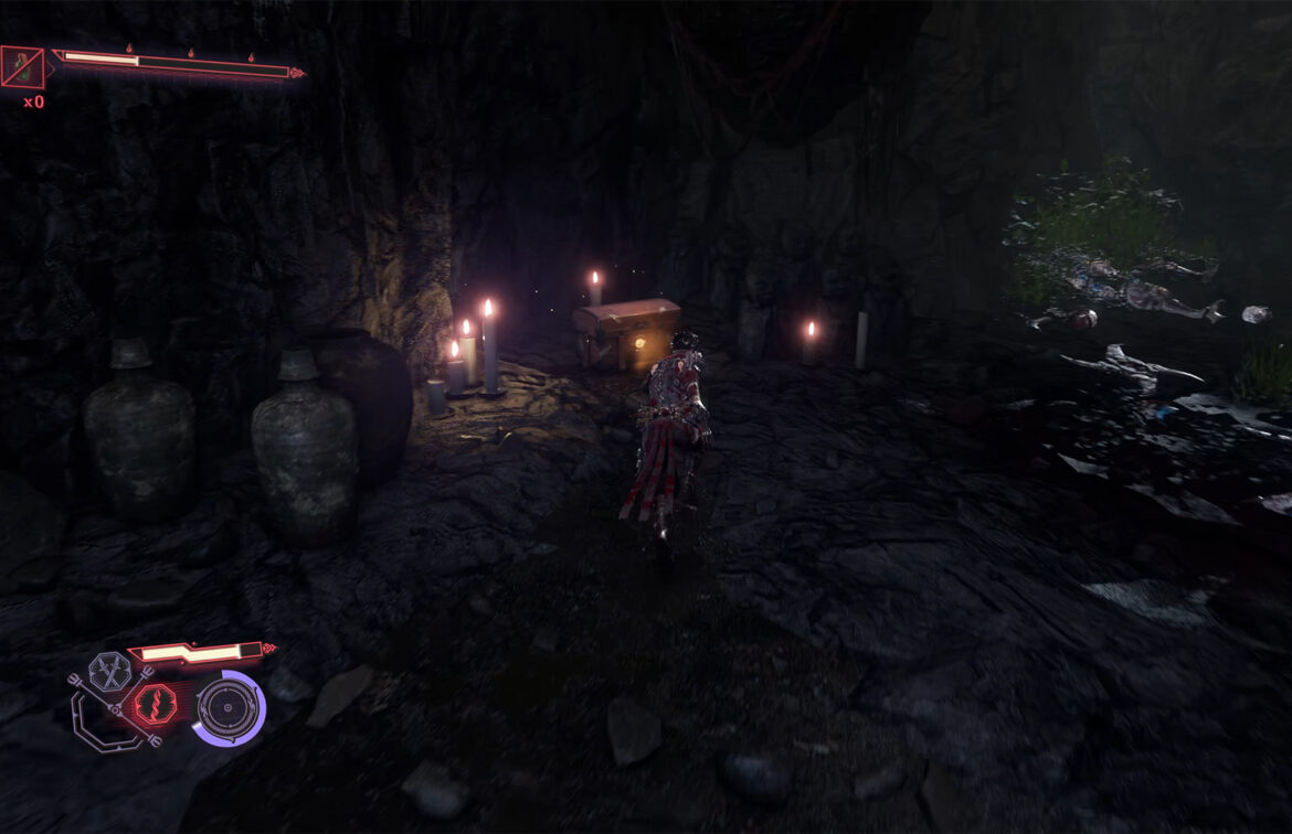 Moving forward, you will see one of your opponents crawling away from a new creature you have not seen before. This is the Armored Sickle. The main difficulty in fighting this opponent is that it blocks all frontal attacks, and you need to find a special moment to neutralize it. After the victory, a little ahead on the left, you will see a chest with Kongou Iron Brew.