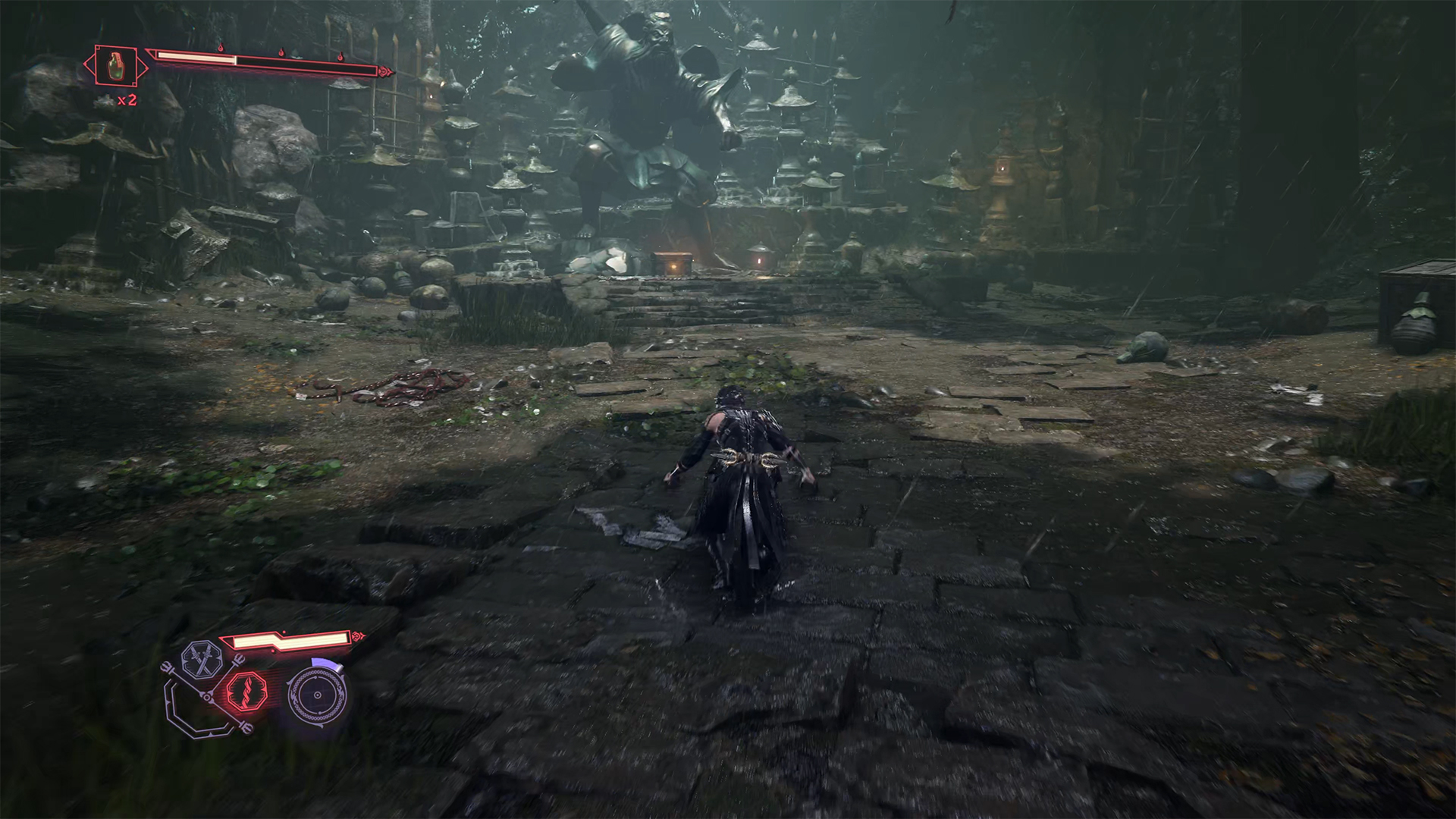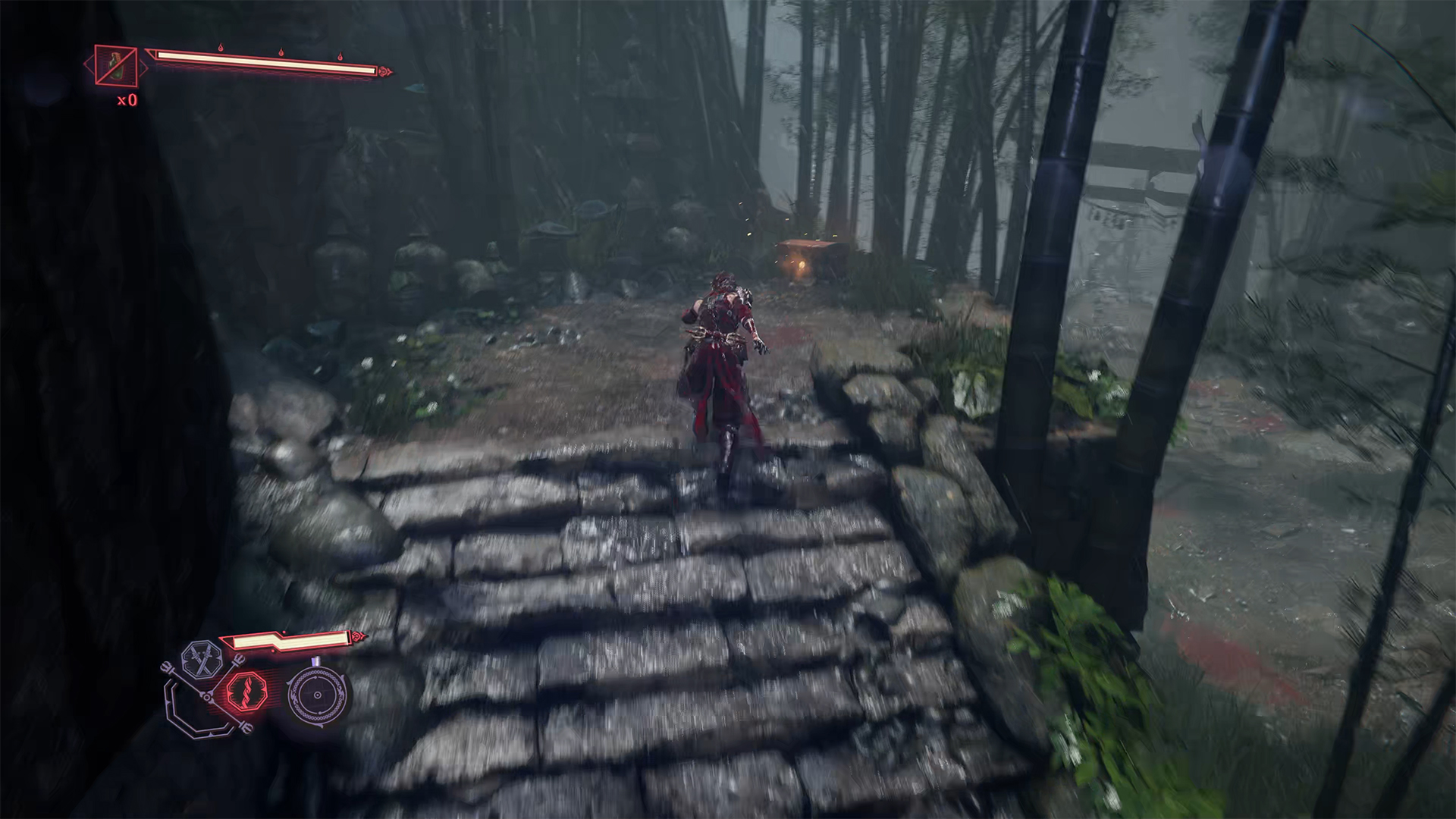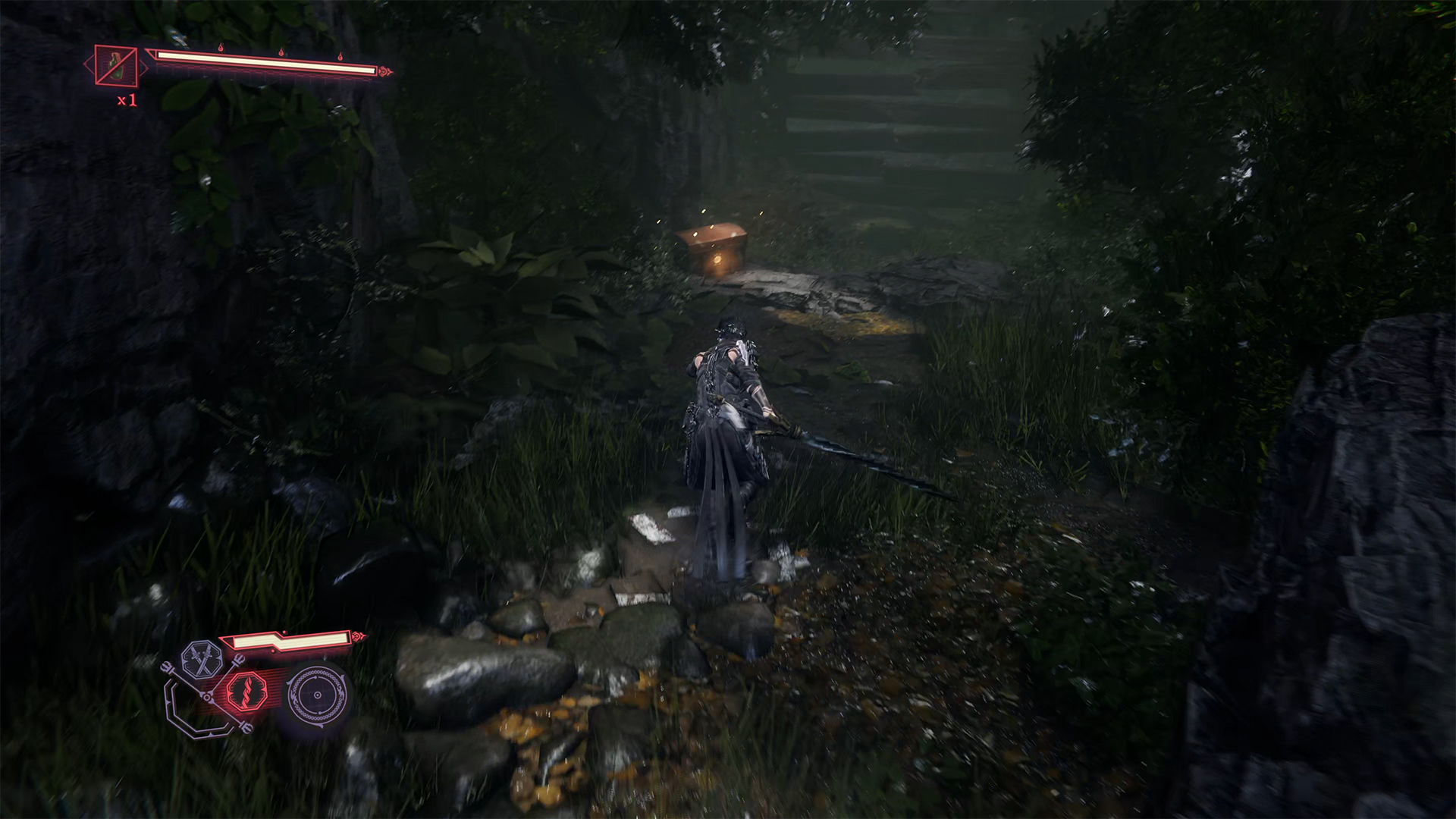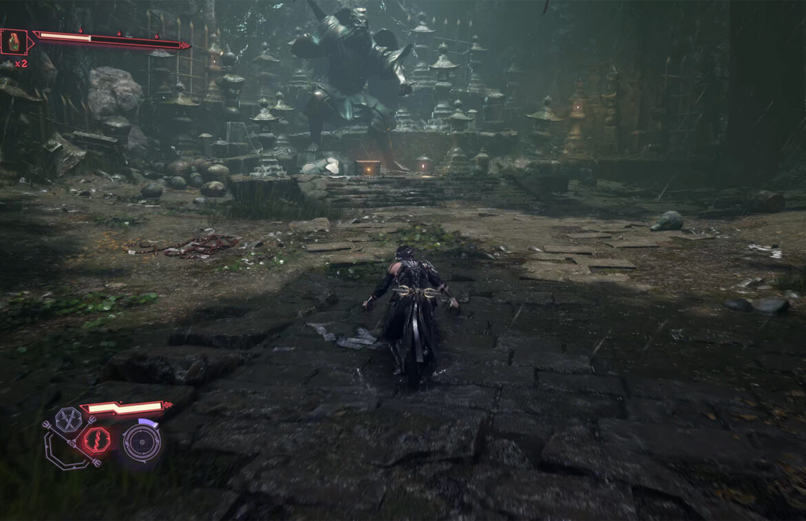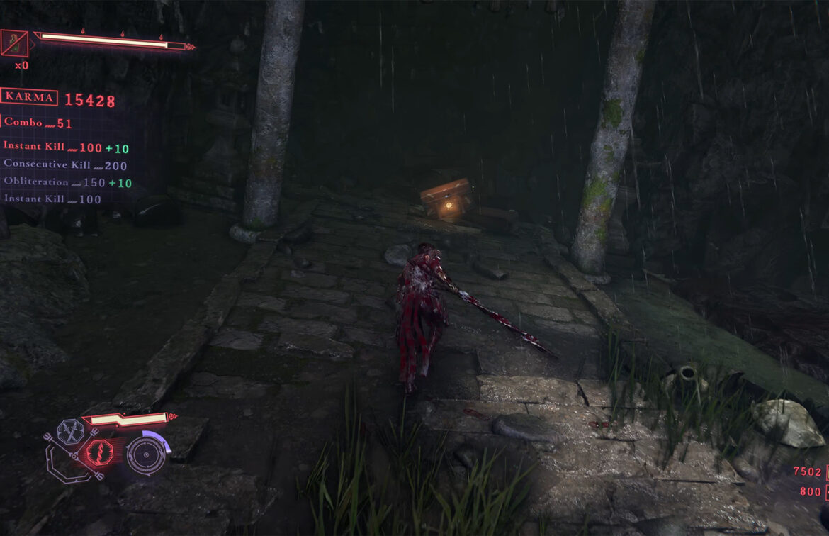Next, a fairly large location will open up before you. Here you will encounter Tengus for the first time. These are the creatures you saw in the cut scene at the beginning of the chapter. Now you have to fight them. They are not too difficult. The only caveat is that Tengus are in the air and you have to bring them down to fight. The easiest way is to throw a kunai at them several times and then continue the fight on the ground. You can just wait, and after a few attacks, they will come down to you. After the fight, find one chest with Rejuvenation Elixir, then turn around and find a second chest with Divine Life Elixir on the elevation to the left. After that, go forward, but turn left before the arch. At the bottom, after passing along the side wall, you will again engage in battle with two Tengus, and then you will be able to open the chest to get Incense of Rebirth.