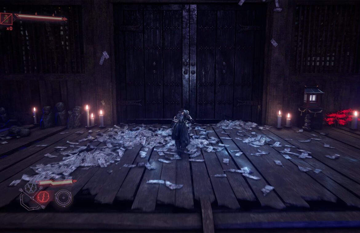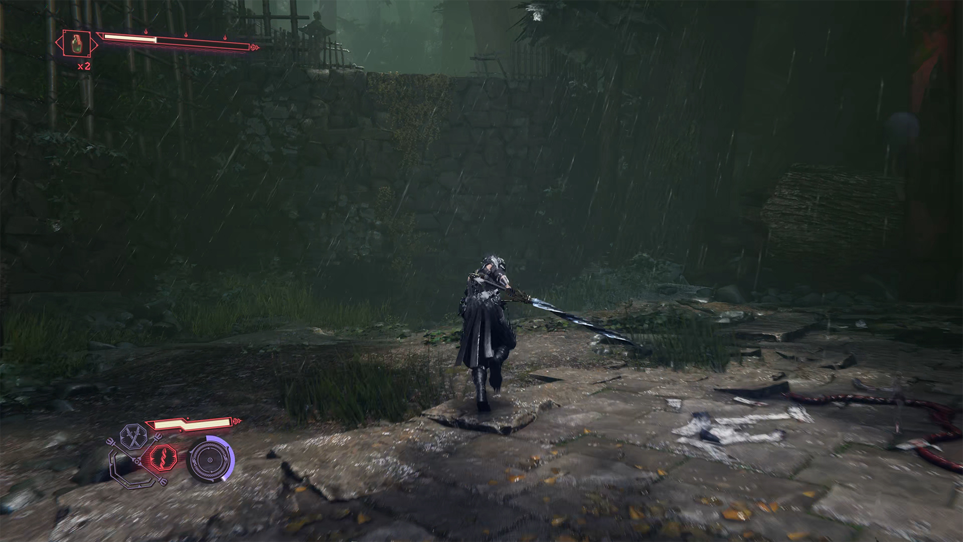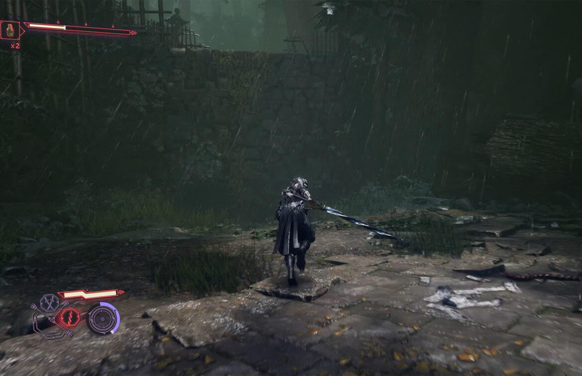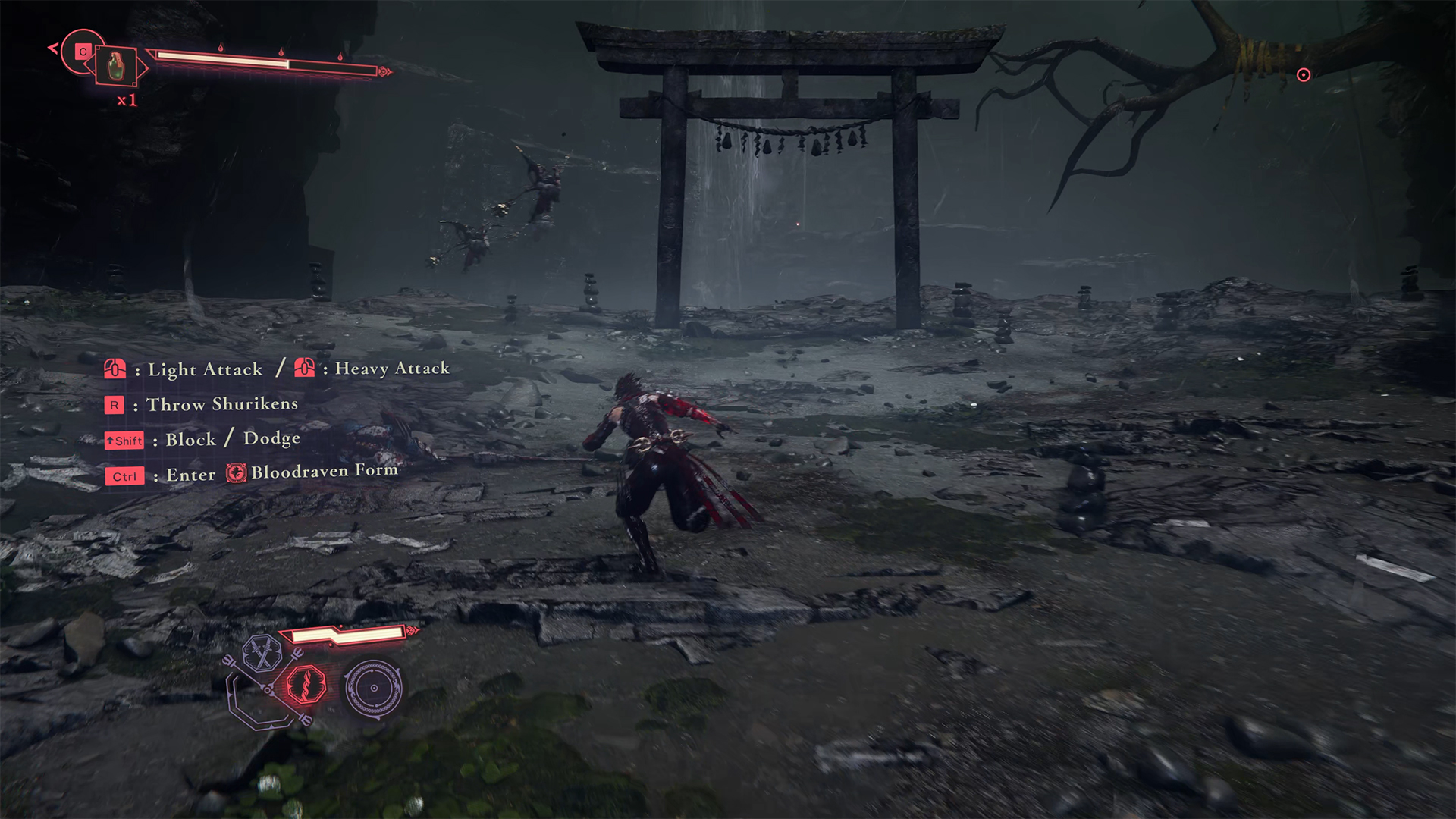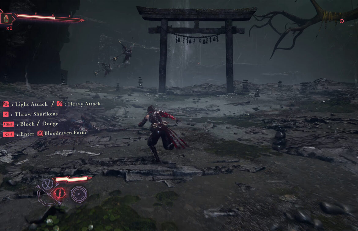 Next, a fairly large location will open up before you. Here you will encounter Tengus for the first time. These are the creatures you saw in the cut scene at the beginning of the chapter. Now you have to fight them. They are not too difficult. The only caveat is that Tengus are in the air and you have to bring them down to fight. The easiest way is to throw a kunai at them several times and then continue the fight on the ground. You can just wait, and after a few attacks, they will come down to you. After the fight, find one chest with Rejuvenation Elixir, then turn around and find a second chest with Divine Life Elixir on the elevation to the left. After that, go forward, but turn left before the arch. At the bottom, after passing along the side wall, you will again engage in battle with two Tengus, and then you will be able to open the chest to get Incense of Rebirth.