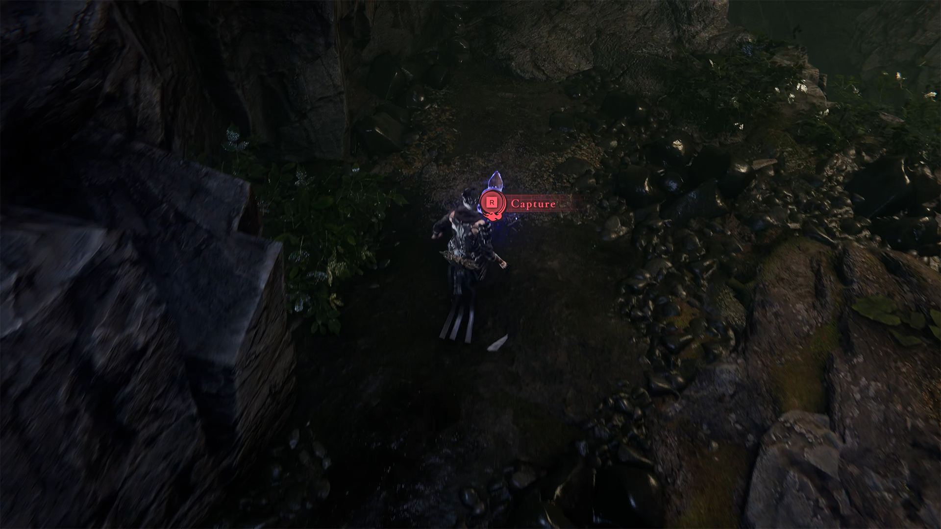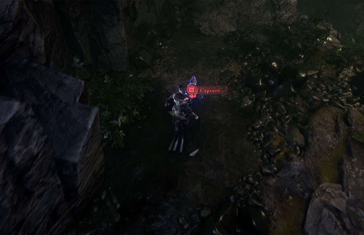 After the battle, you must proceed to your next flight, but first turn right. Here you can catch Gourdy. This time it will be a different kind of interactive interaction. If you look closely, you will see that Gourdy glows blue. This means that he is easily startled, and you need to approach him quietly to catch him. Jump to the side of him and then grab onto the pole in front of you. Now you can jump behind Gourdy and easily catch him.