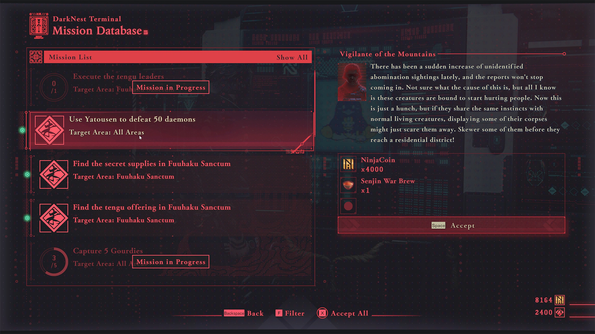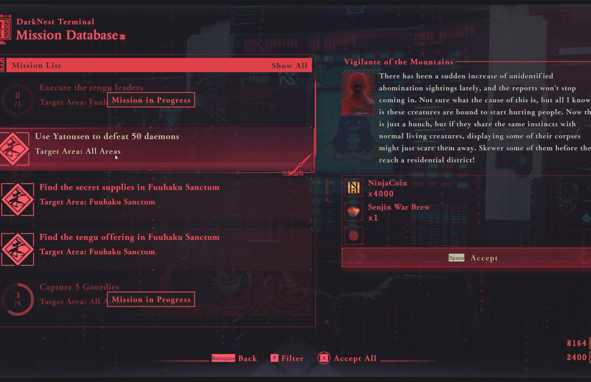 - Find the Tengu Offering (In this chapter, you only need to accept the quest, but you can complete it in the next chapter.)