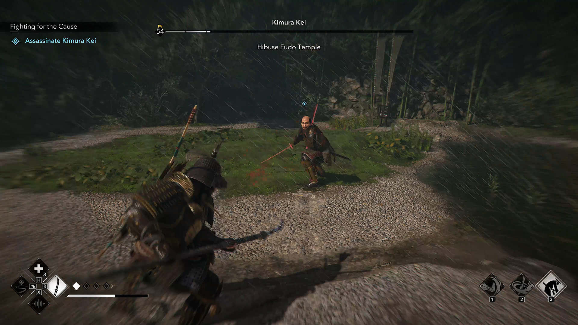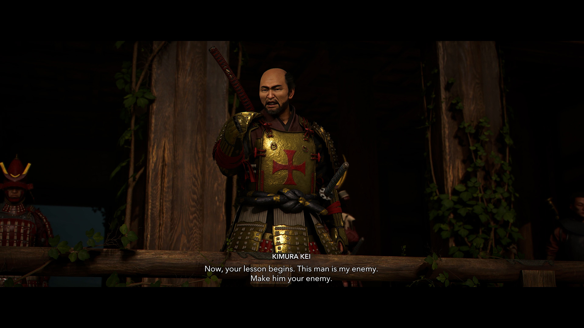 Shoot the red barrels with your bow and teppo if you want to take out large groups of enemy. When you reach Kimura Kei he will start a boss battle and cannot be assassinated stealthily. You will need to equip armor engravings that allow you to parry his unblockable attacks. He will use a lot of them. This is a boss battle with multiple phases.