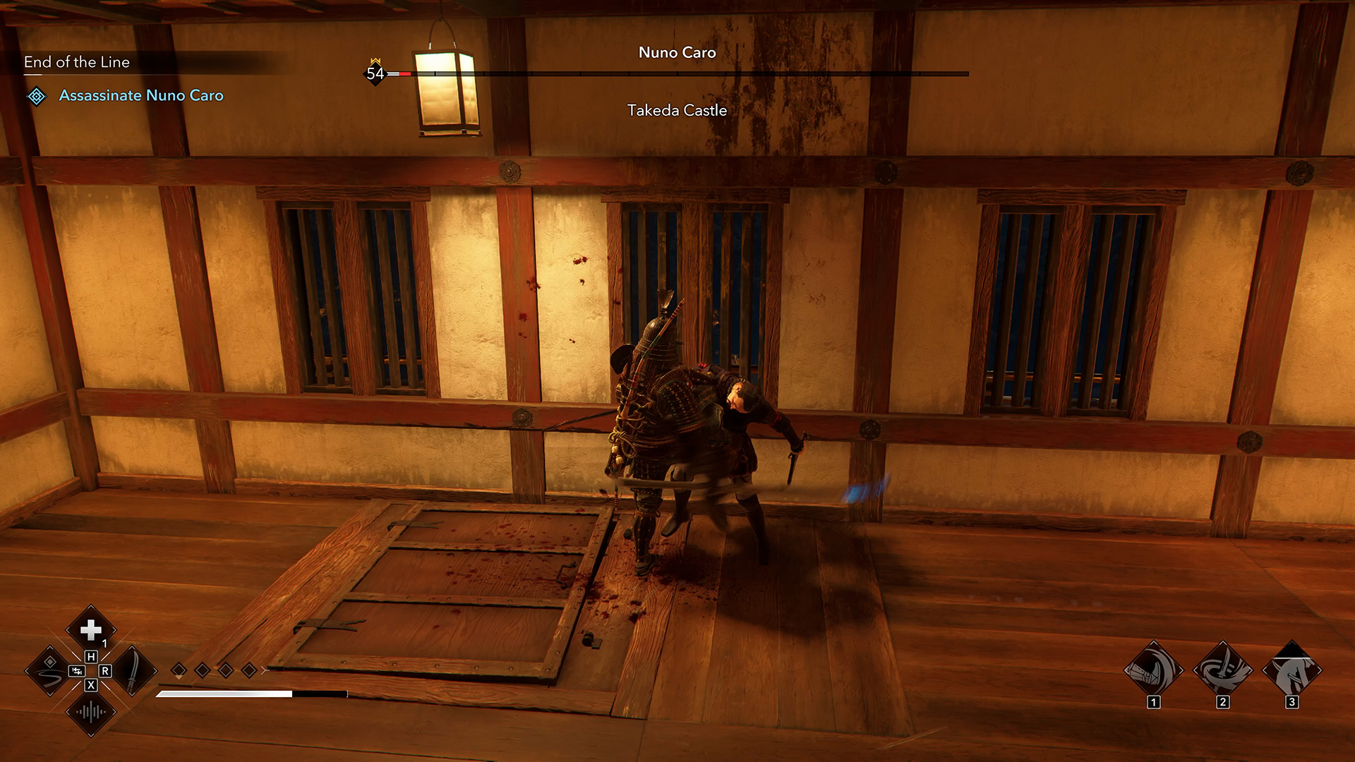 As Yasuke stealth isn’t a very viable option, so disable any alarm bells you see with your teppo or bow. You’ll reach a double door set as you climb. Use it to start the encounter with Nuno. As you climb the castle, kill Nuno Caro’s men to track him down. Nuno Caro can be found at the top of Takeda Castle. He will trigger a boss battle. Nuno Caro uses a sword as well as a pistol, and his fighting style is similar to that of some of his soldiers. You can parry or block his main sword attack, which is a combination of up to four strokes. Avoid the shot of his pistol when you see it glow red.