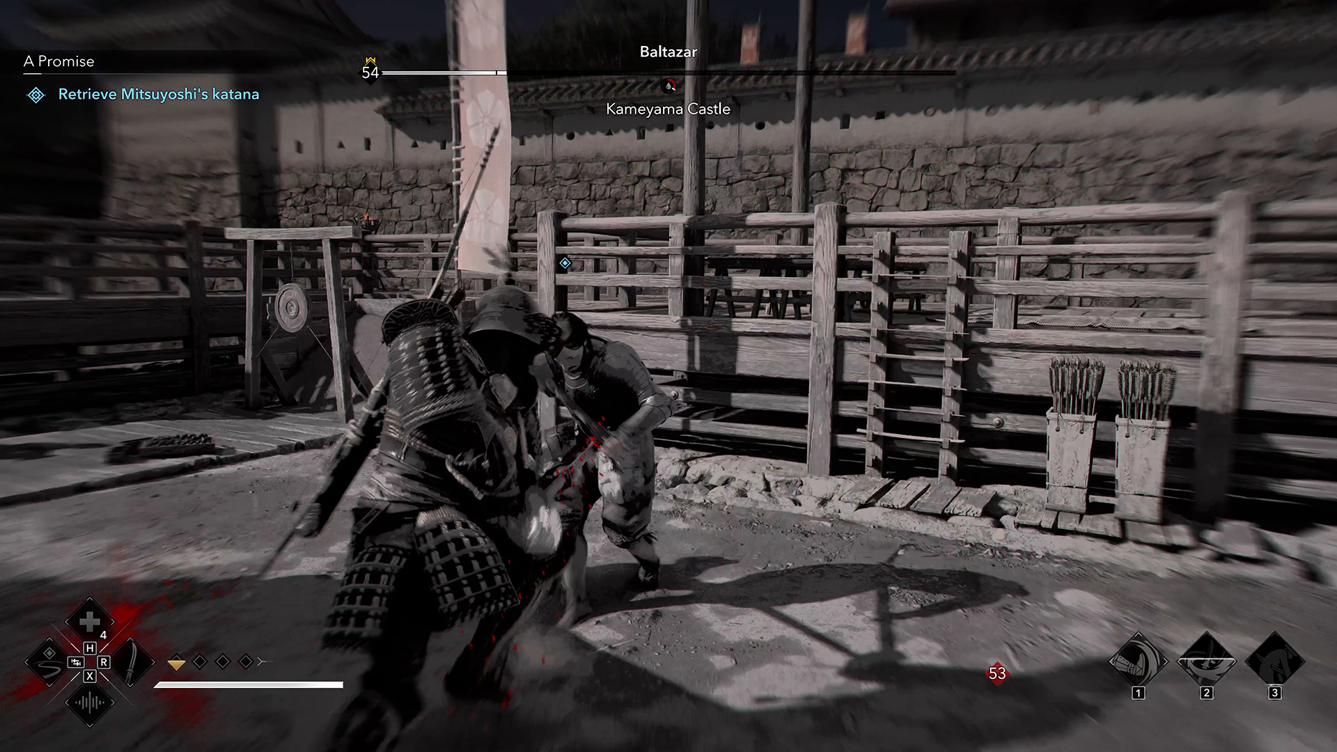 When you leave the castle and reach a safe place, Akechi Mitsuyoshi will ask you to retrieve the katana that was left in the castle. It is his father’s katana and is very dear to him. Akechi Mitsuyoshi will go on ahead, and you will have to return to the castle and find Baltazar there. You must defeat him in battle and escape from the castle again.
